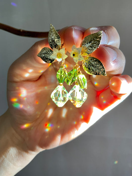 Rare Lemon Blossom Prism Earrings~ Mother of Pearl, Crystal Prisms, 18k Gold-Plated Fruit jewelry