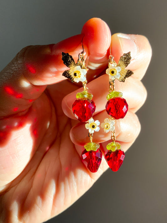 Red Sparkle Strawberry Blossom Earrings~ Mother of Pearl, Crystal Prisms, 18k Gold-Plated Fruit jewelry
