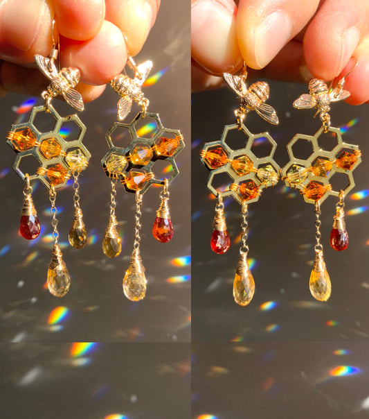 *Limited* Orange Garnet, Citrine, Honey Quartz Honeycomb Bee Earrings with ombré Crystal prisms, 18k Gold-Plated Honeybee