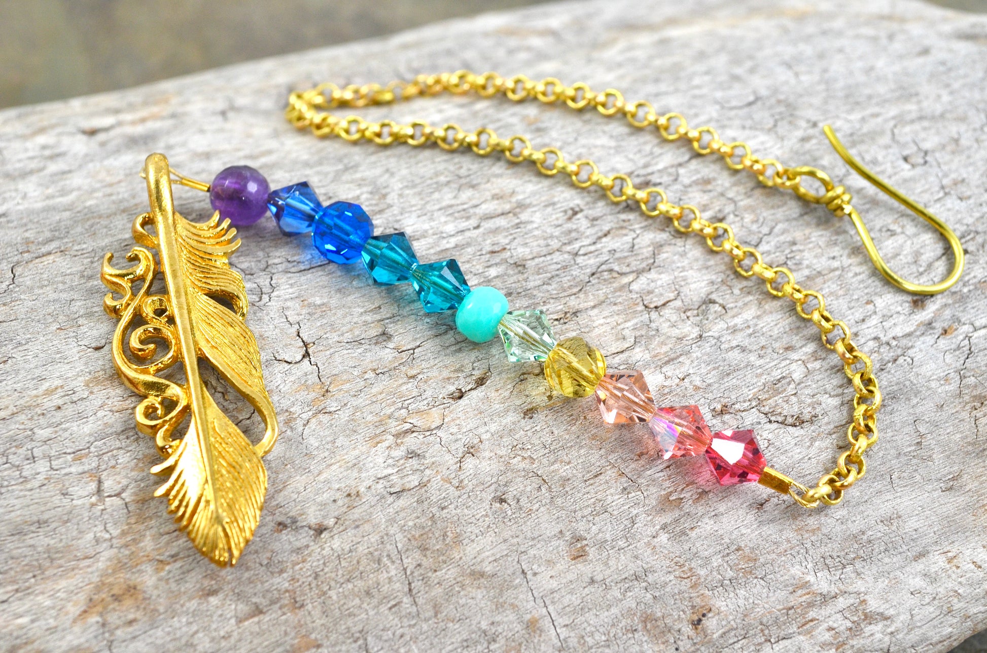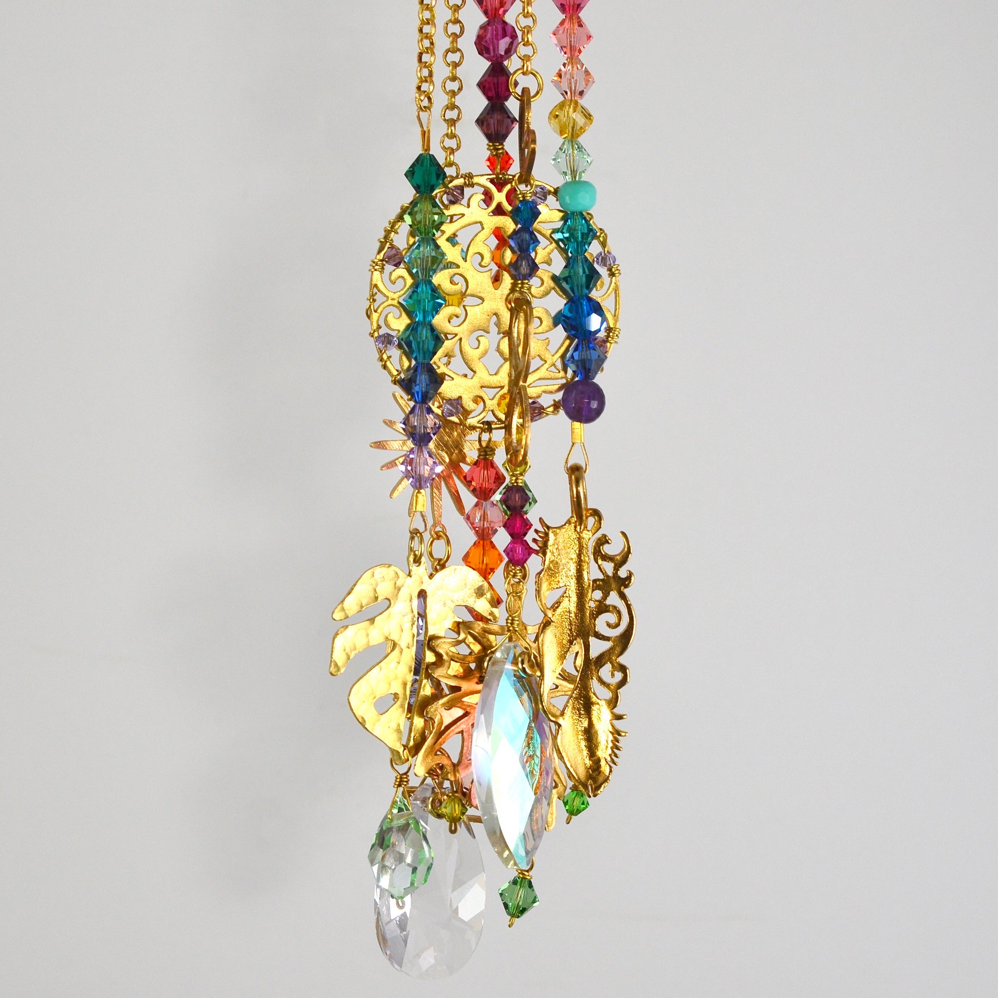 Glam up your car with these glittering, oh-so-boho crystal rear view mirror charms! With meticulously arranged Crystals prisms in an ombré rainbow pattern with Amethyst and Chrysoprase, and solid, raw brass components for a touch of warmth. 😊