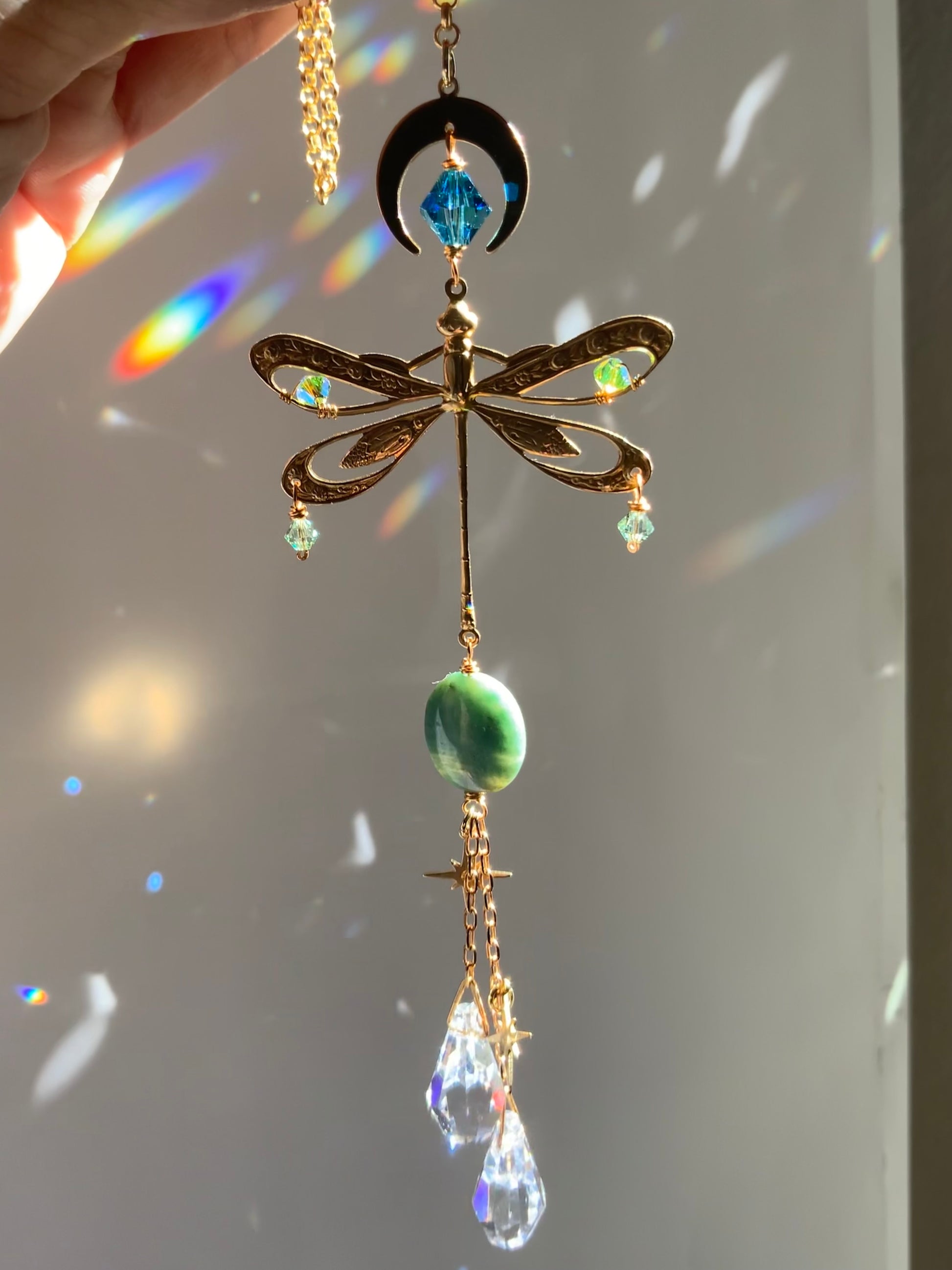 A delicate, ornate Dragonfly with rare Aura green crystals in the wings, dangling beneath a crescent moon with a gorgeous teal (super rare) crystal inside! 🤩 Featuring African "Jade," which is the trade name for a beautiful type of Quartz with maroon inclusions and varying shades of cool-toned green.