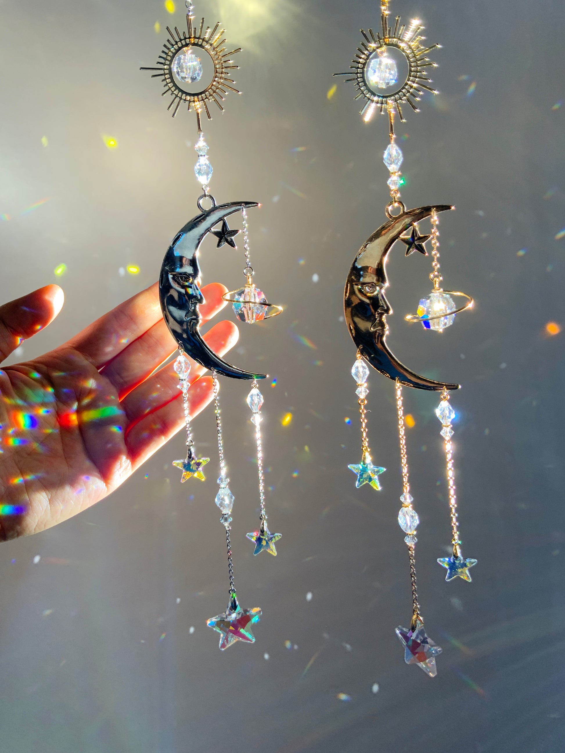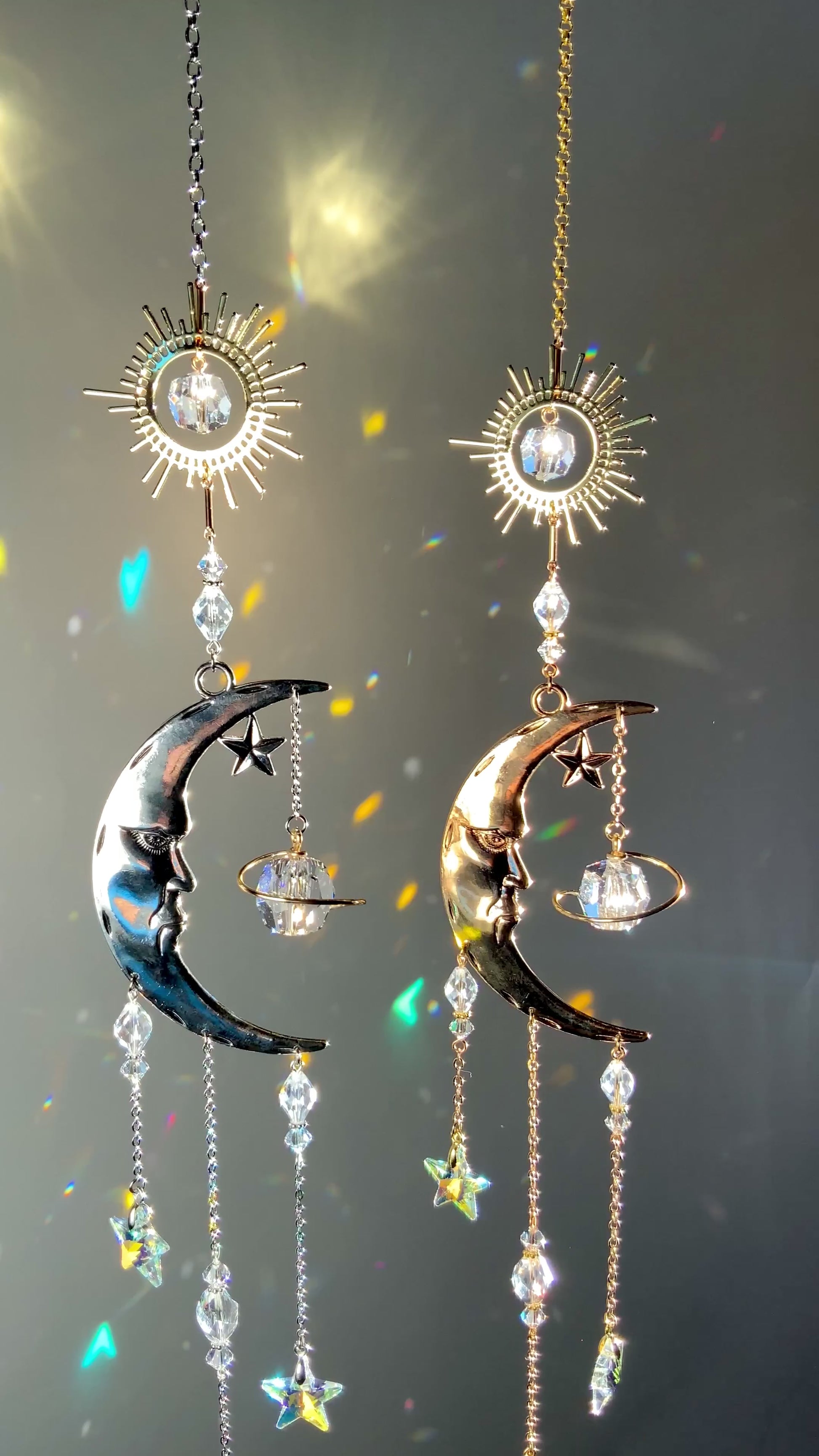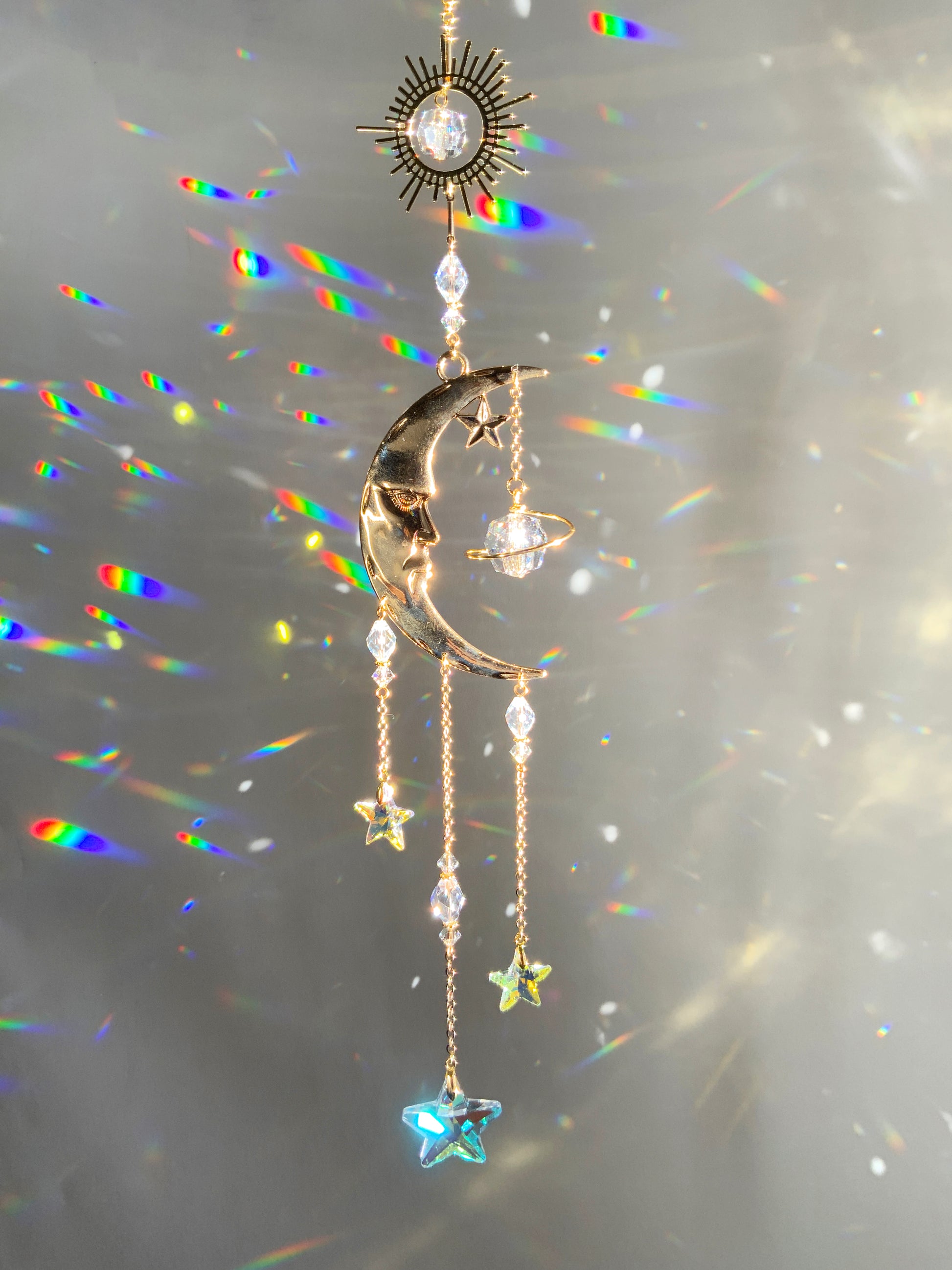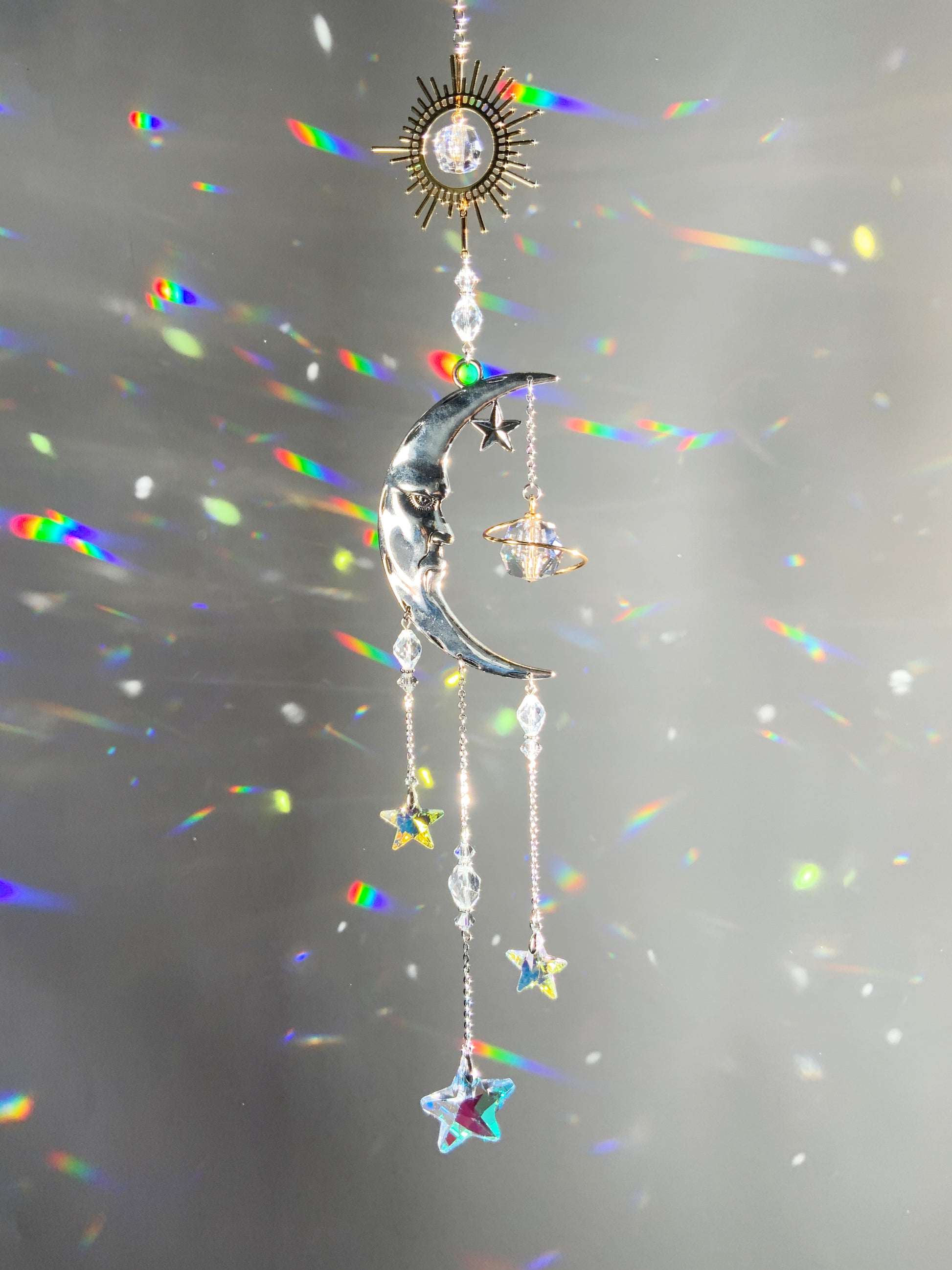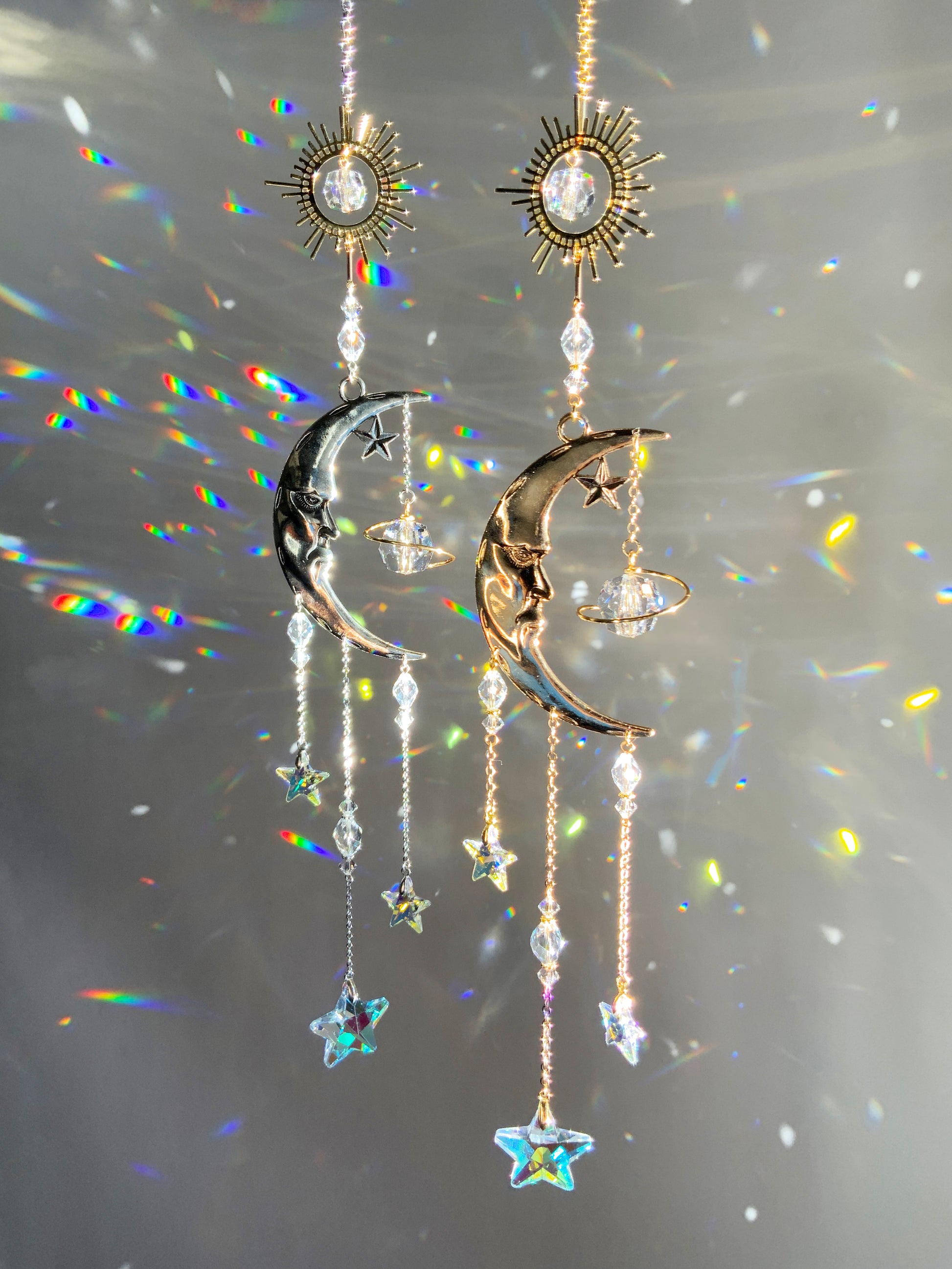"Falling Stars" ~ Mini Suncatcher, Gold or Silver, Sun Moon Saturn Celestial Crystal Prism ornament