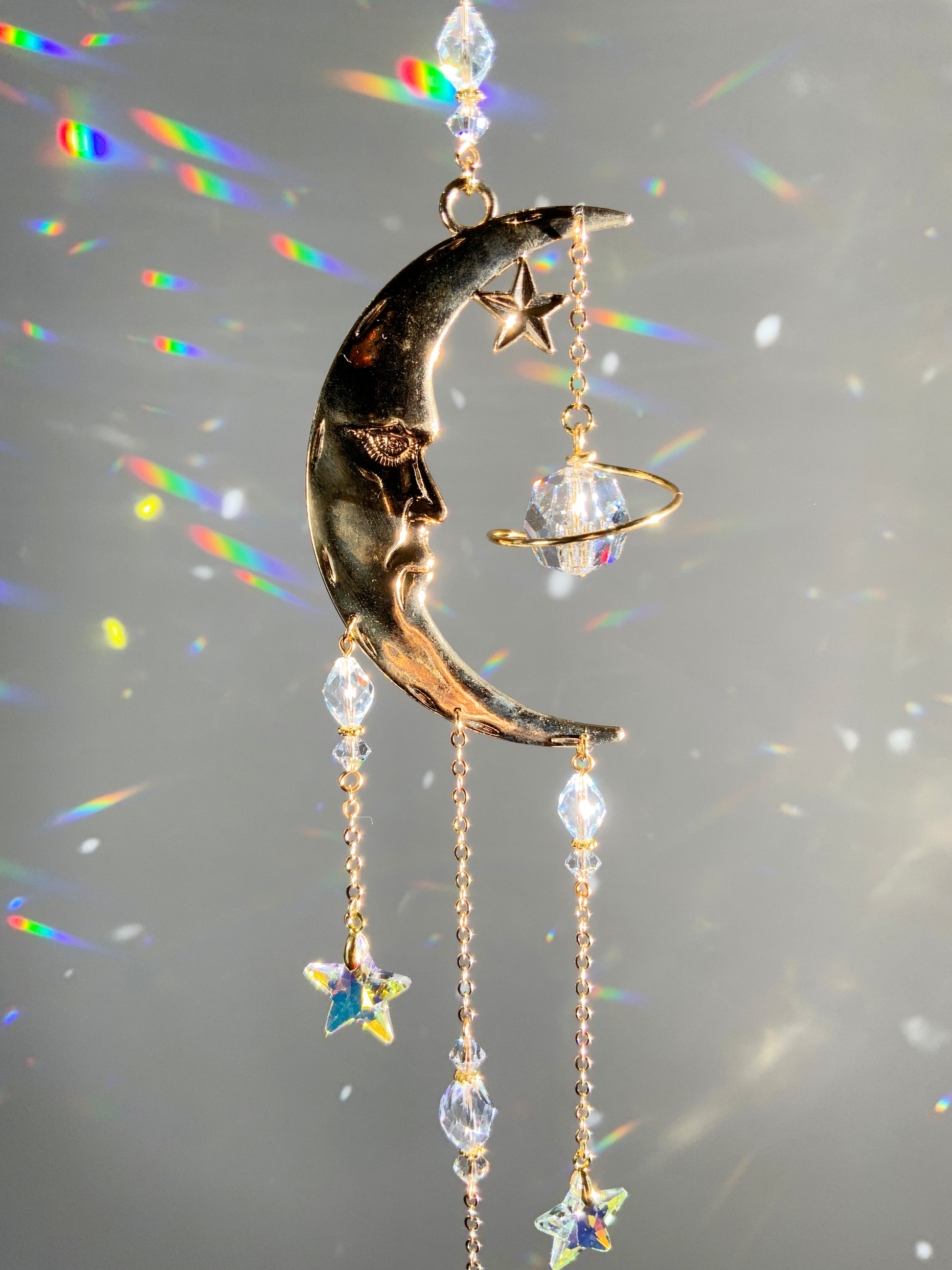 A cascade of Falling Stars sparkle and dance beneath a charming crescent moon, with a hand-wired Saturn prism dangling in its center. 🪐