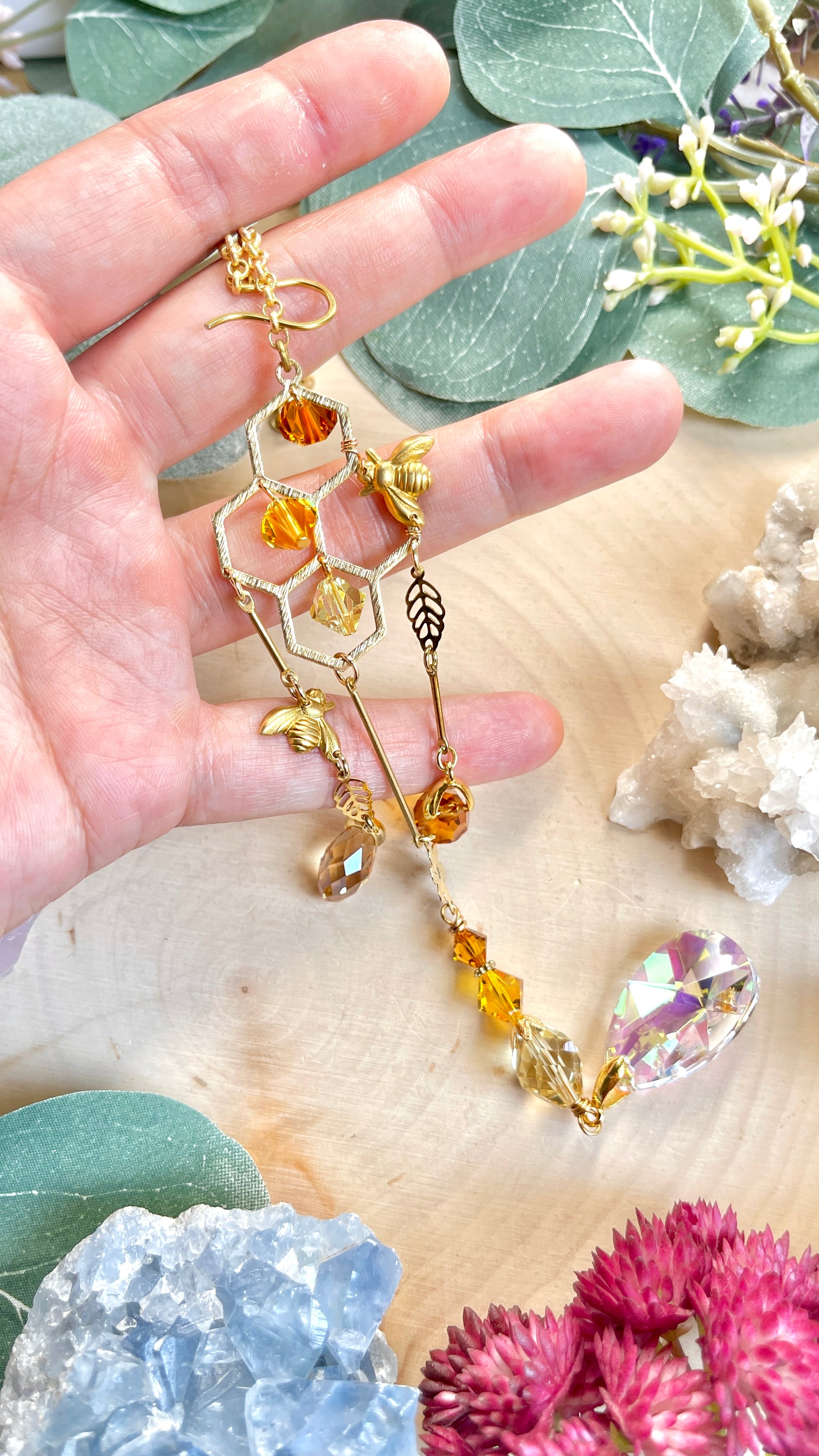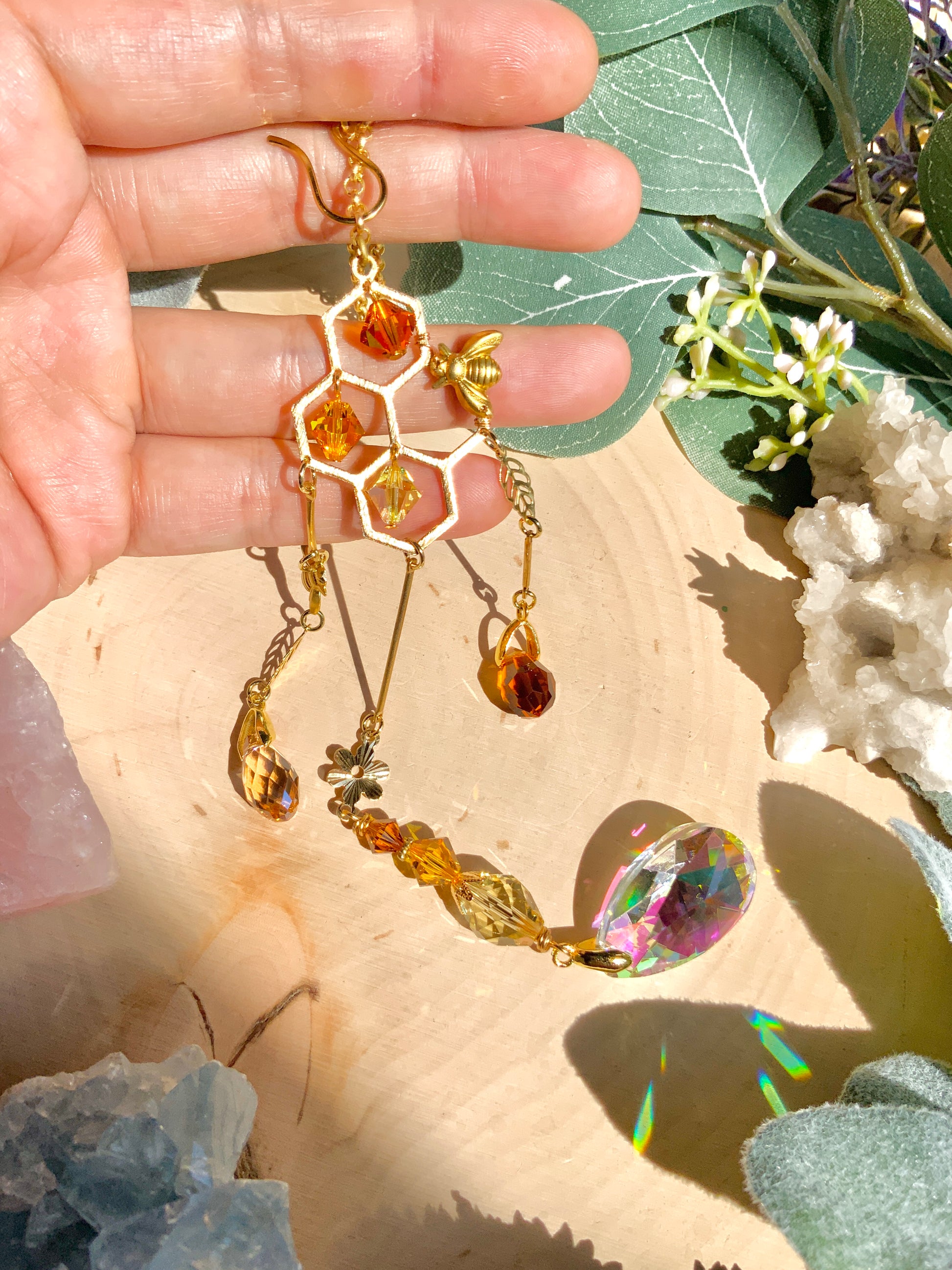 Glittering ombré honey crystals swing and dangle from hand-wired links inside a sweet 18k Gold-Plated honeycomb with two busy bees hovering around. Hanging below are droplets of "honey" and a beautiful, sparkly Brass flower accent. 🌼