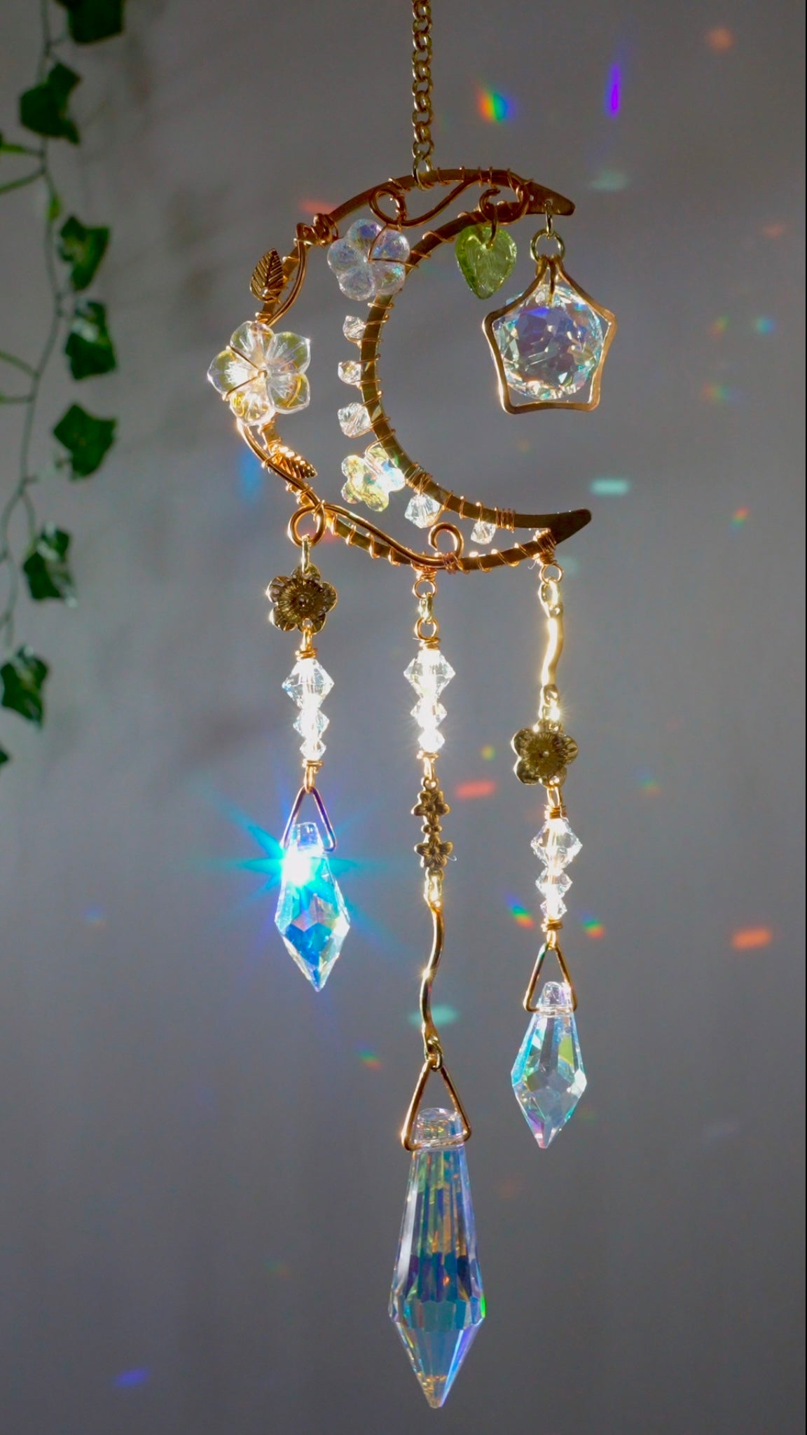 Hanging in the 18k Gold-Plated moon is a limited edition, rose-cut (faceted like a Diamond) Aura Crystal dangling inside a hand-formed and hammered Moonflower outline, with a small artisan-made glass heart-leaf. 😺
