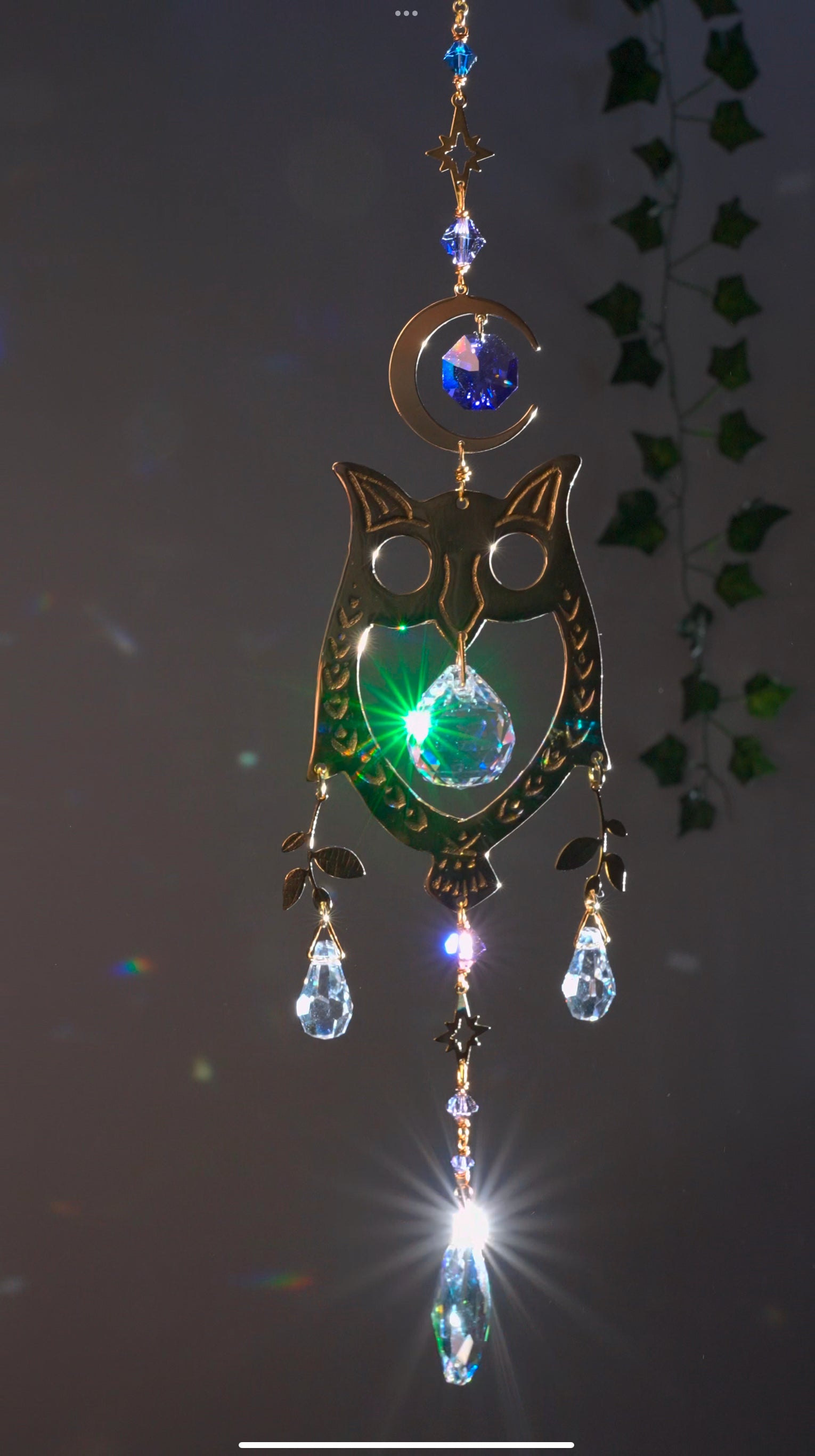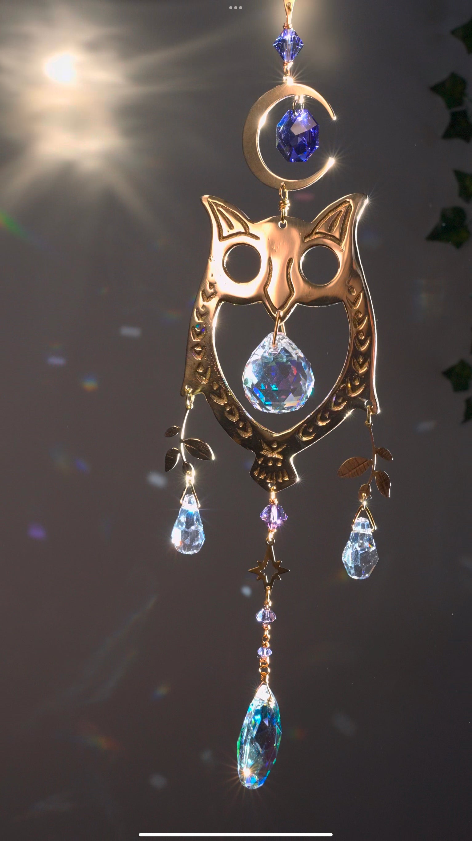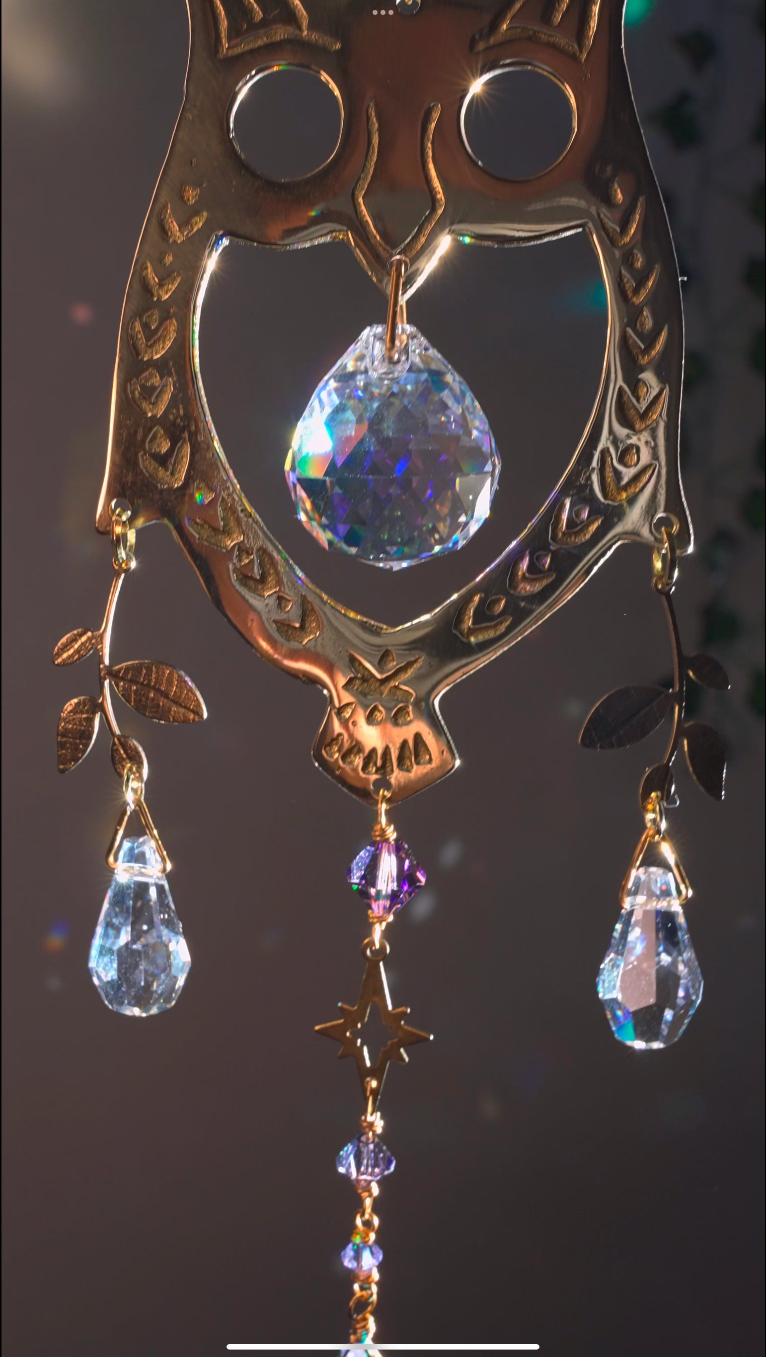 "Night Owl" ~ Mini Suncatcher, boho witchy room decor made with Brass and Crystal Prisms