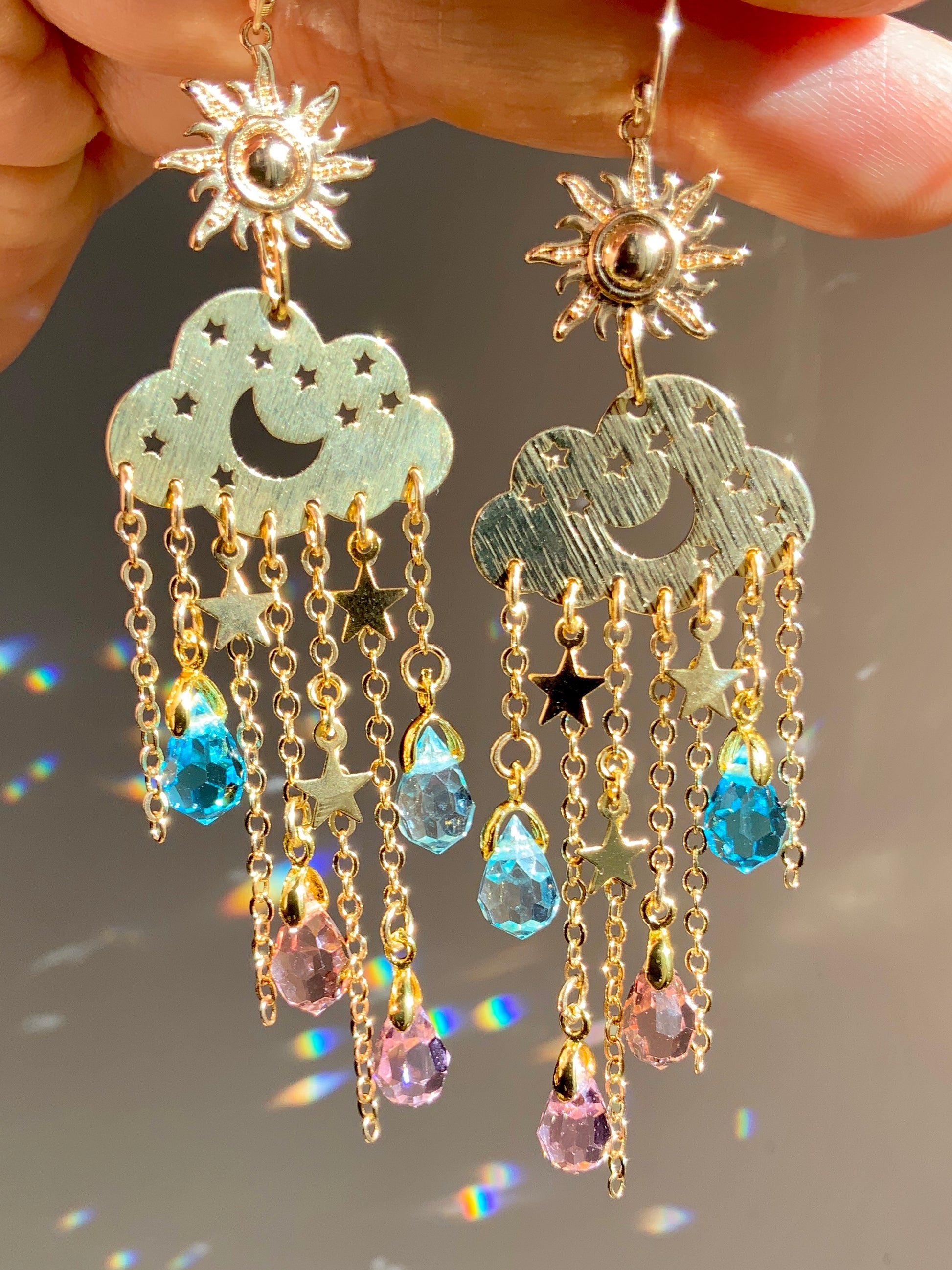 A cascade of delicate gold chains hang below, representing rainfall, with tiny 18k Gold-plated Sun and Stars framing the clouds. ☀️☁️✨