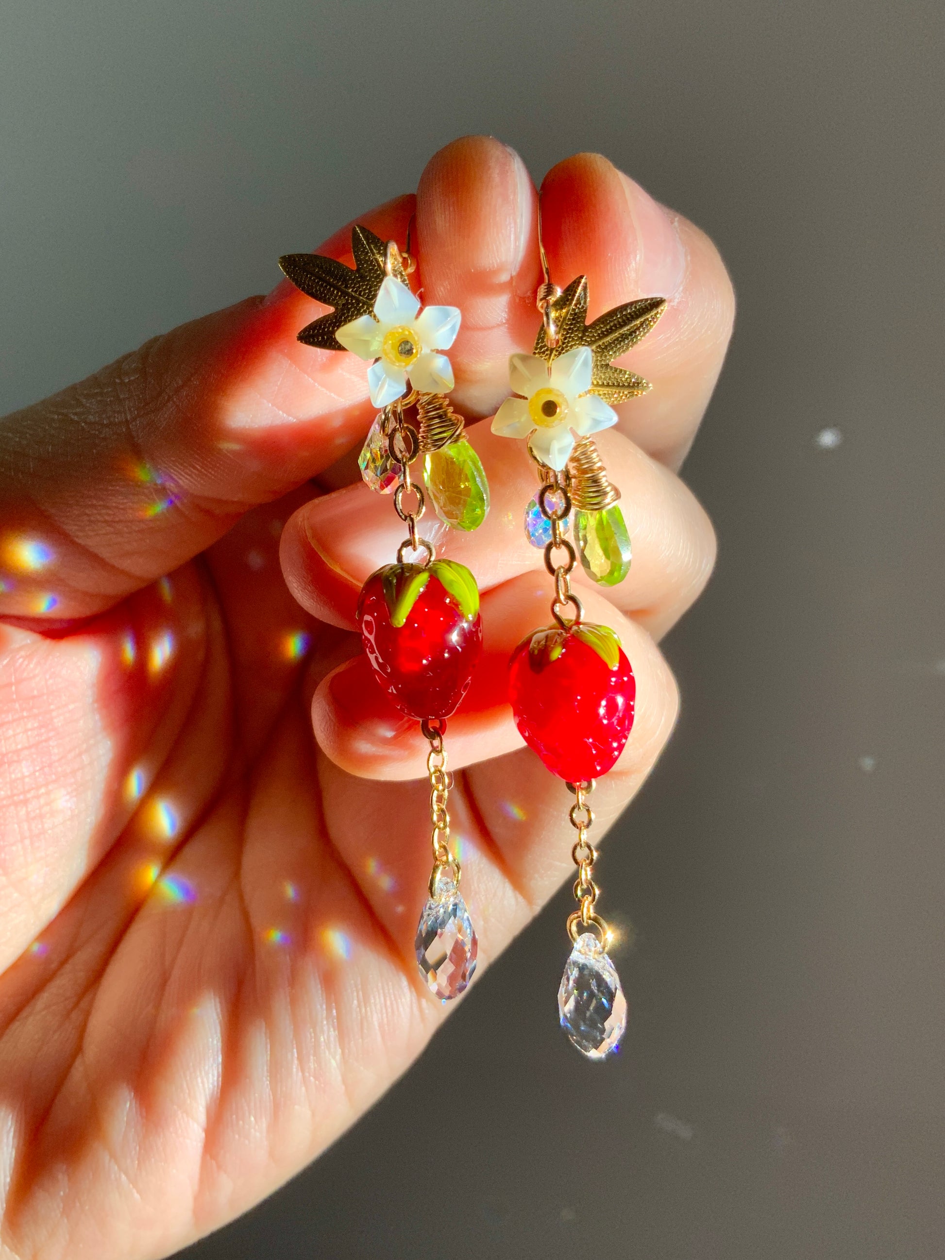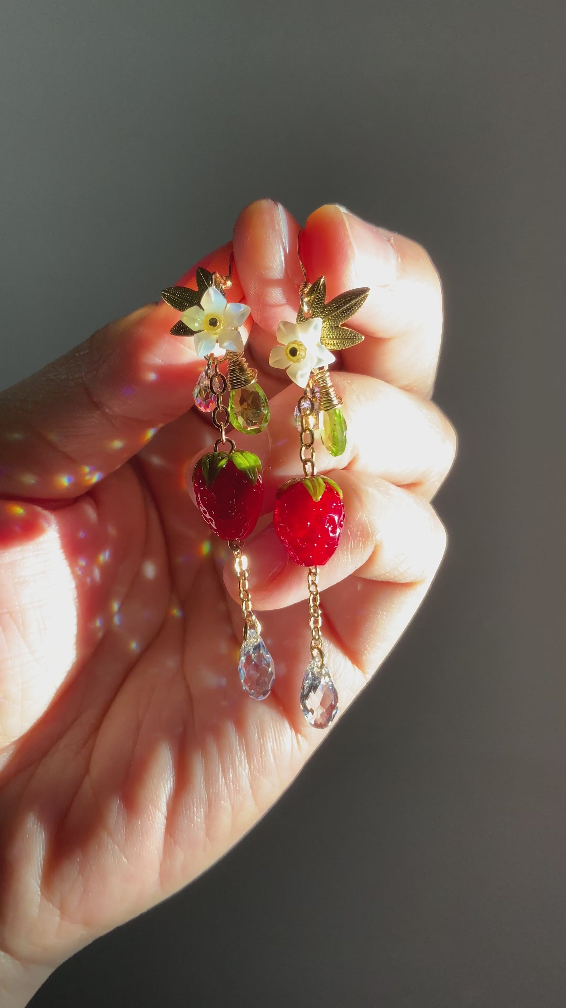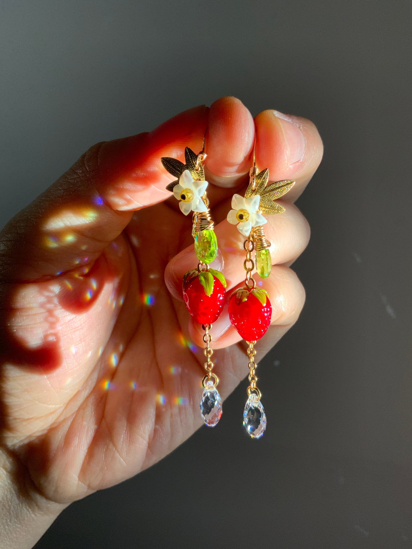 Super Realistic Strawberry Blossom Earrings~ Peridot, Mother of Pearl, Artisan-made Glass, 18k Gold-Plated Crystal Fruit jewelry