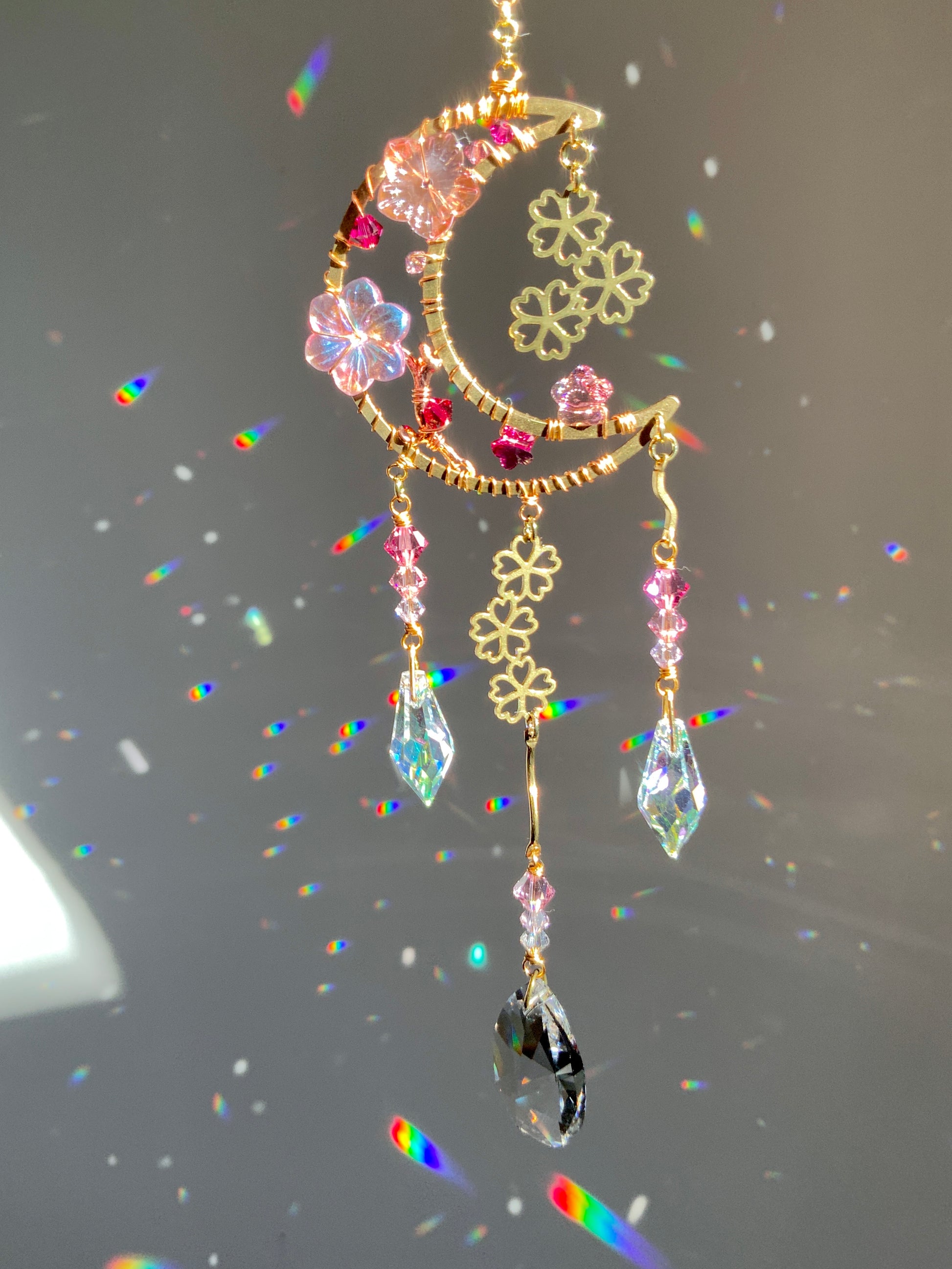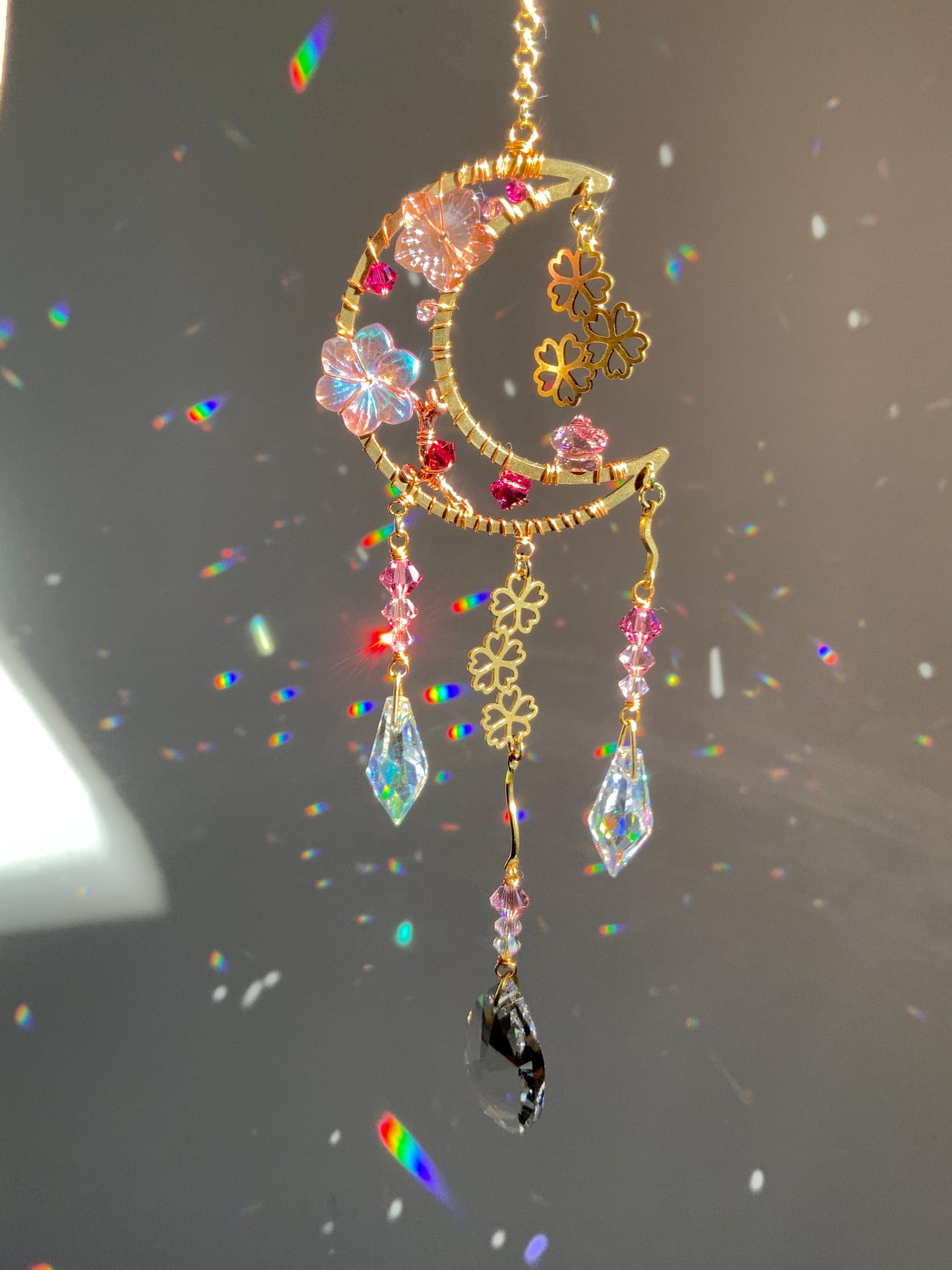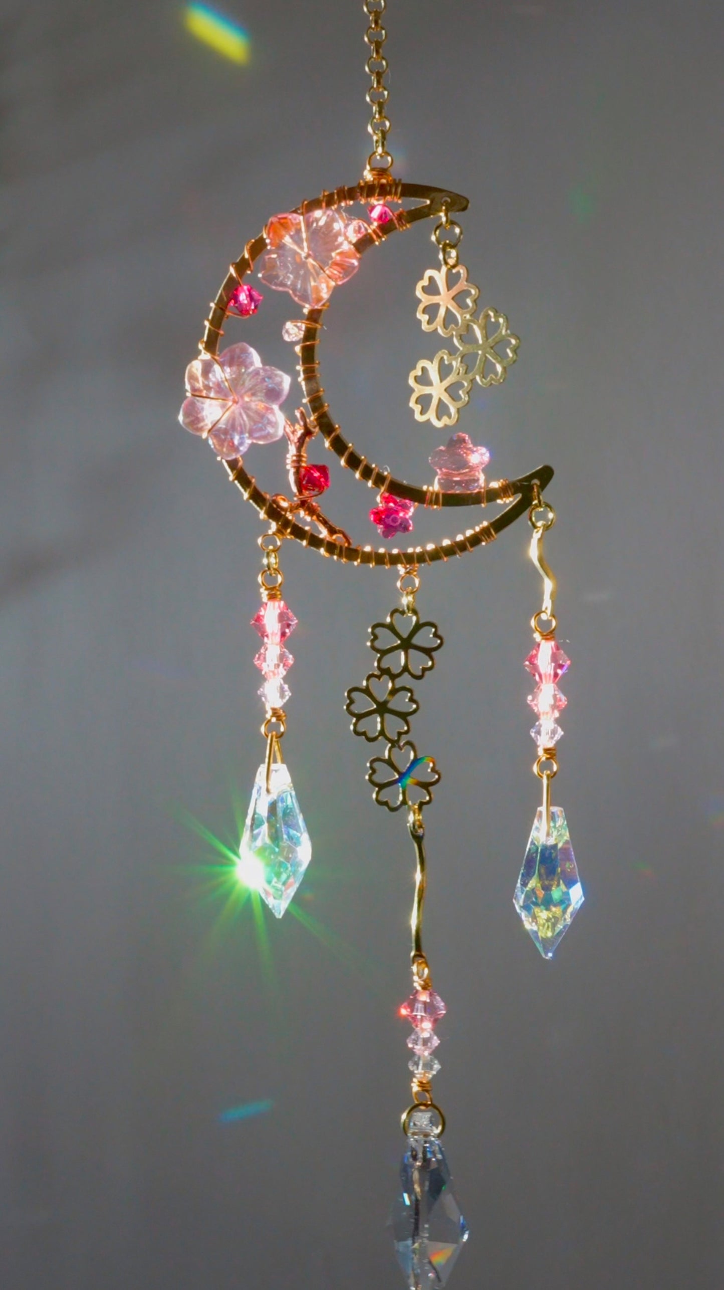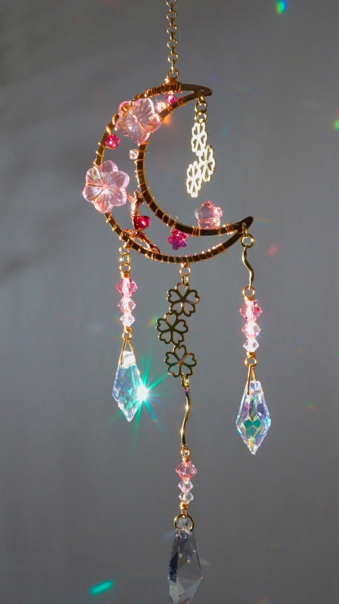 Sakura Moonglow Floral Aura Crystal Rear View Mirror Car Charm, Crescent Celestial auto decoration accessories made with 18k Gold-Plated