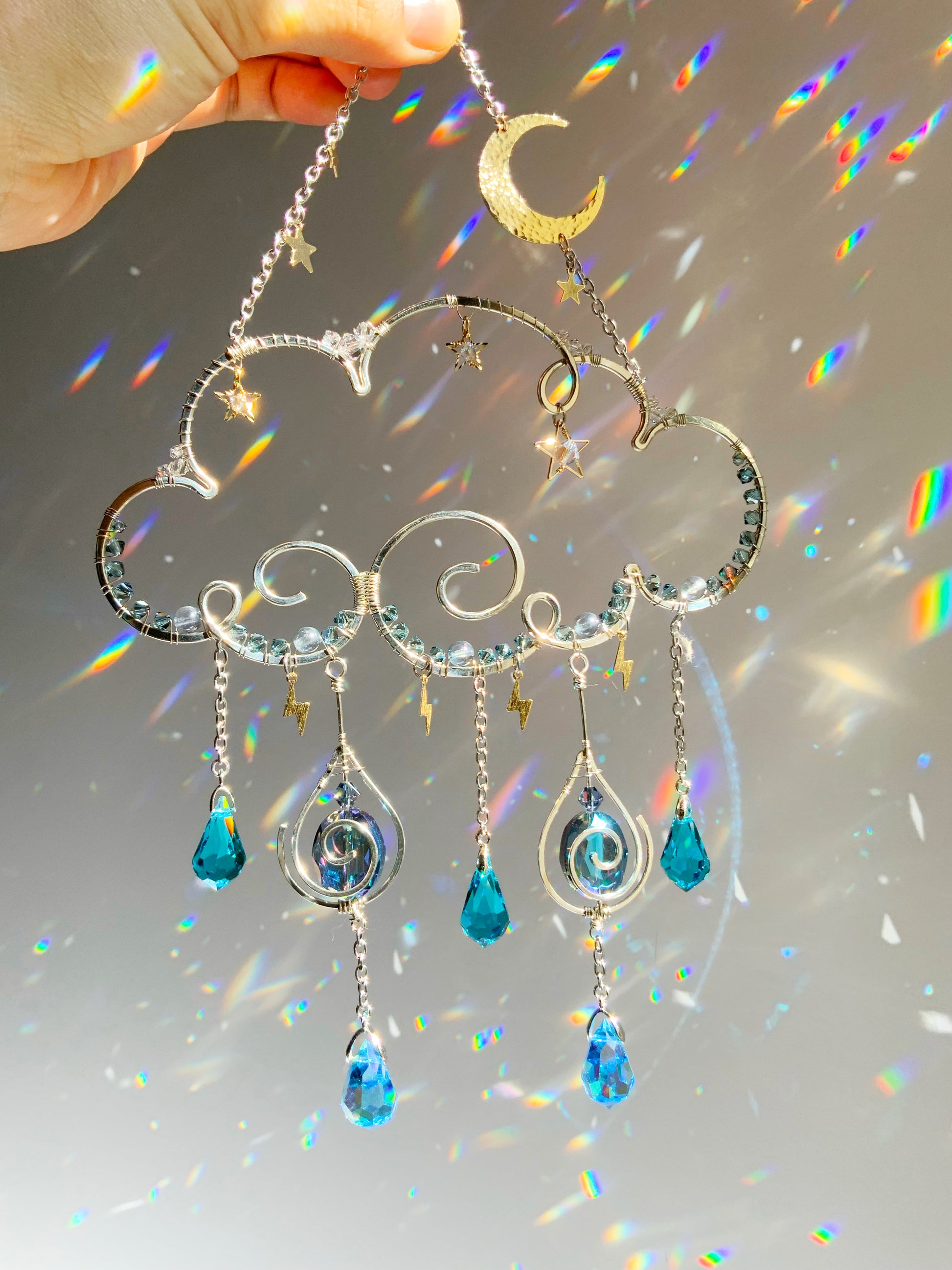 Silver Rain Cloud Suncatcher with Moon, Stars, Lightning, and Crystal Raindrops