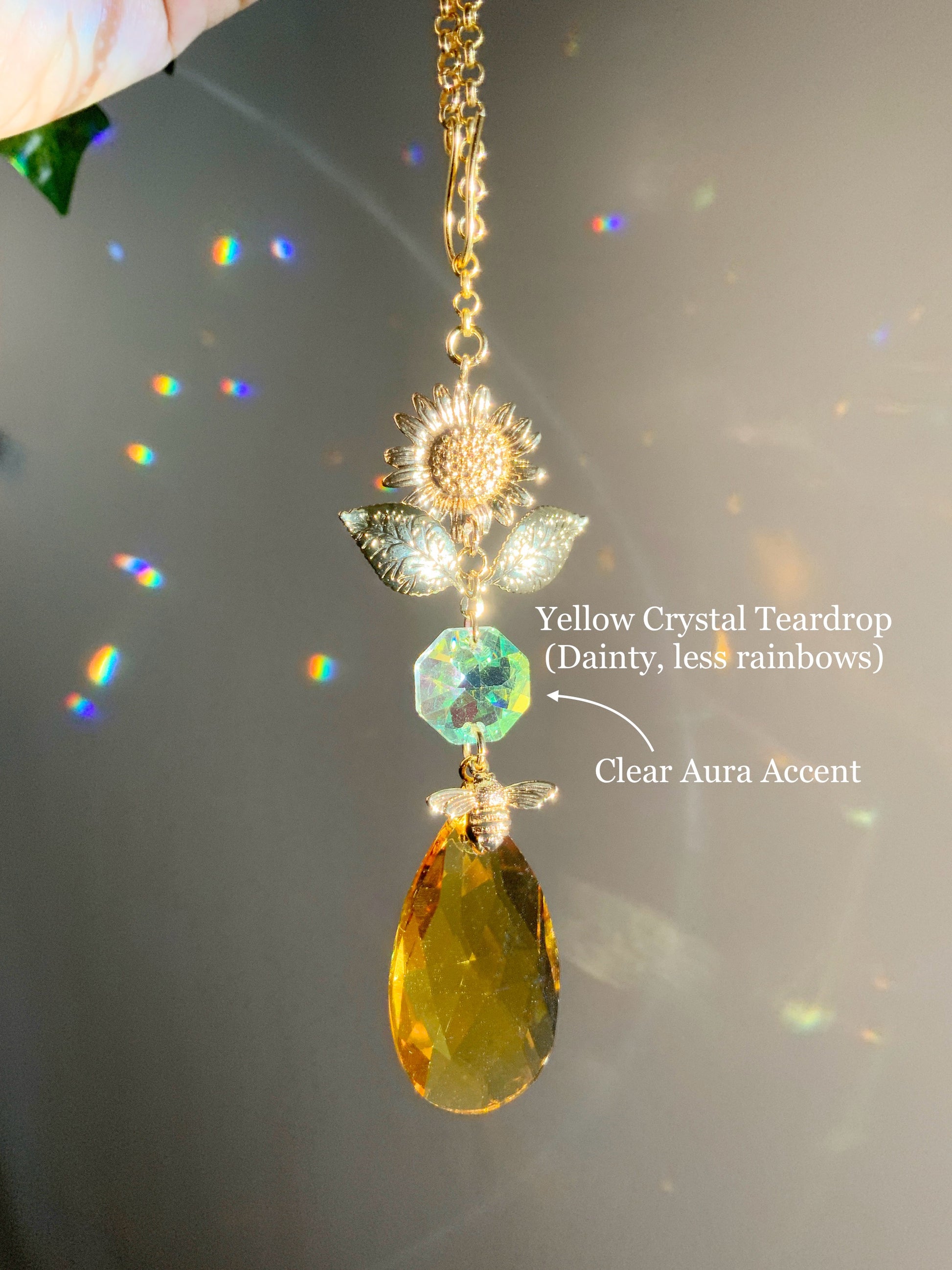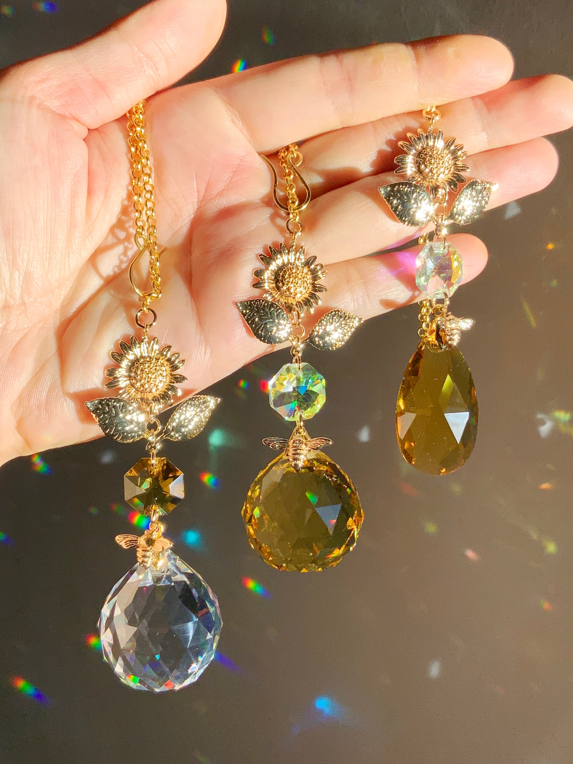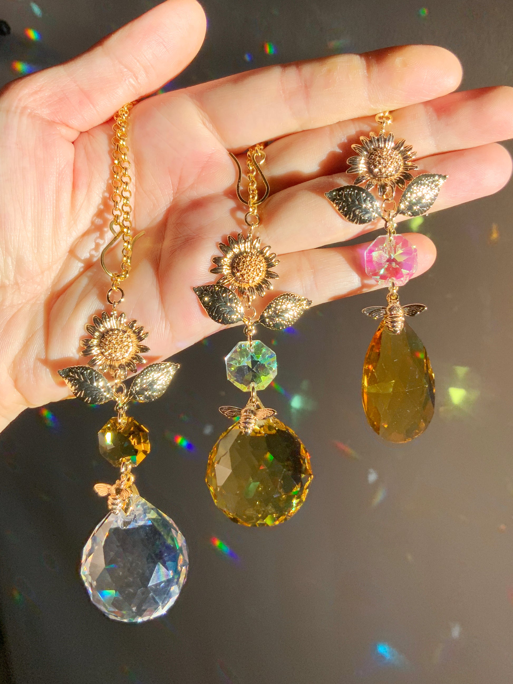 This darling little sparkler features a beautifully detailed 18k Gold-Plated Sunflower with a leafy stem that dangles/wiggles as it moves, with an adorable plump honeybee sitting atop high-quality prisms. 🌼🐝