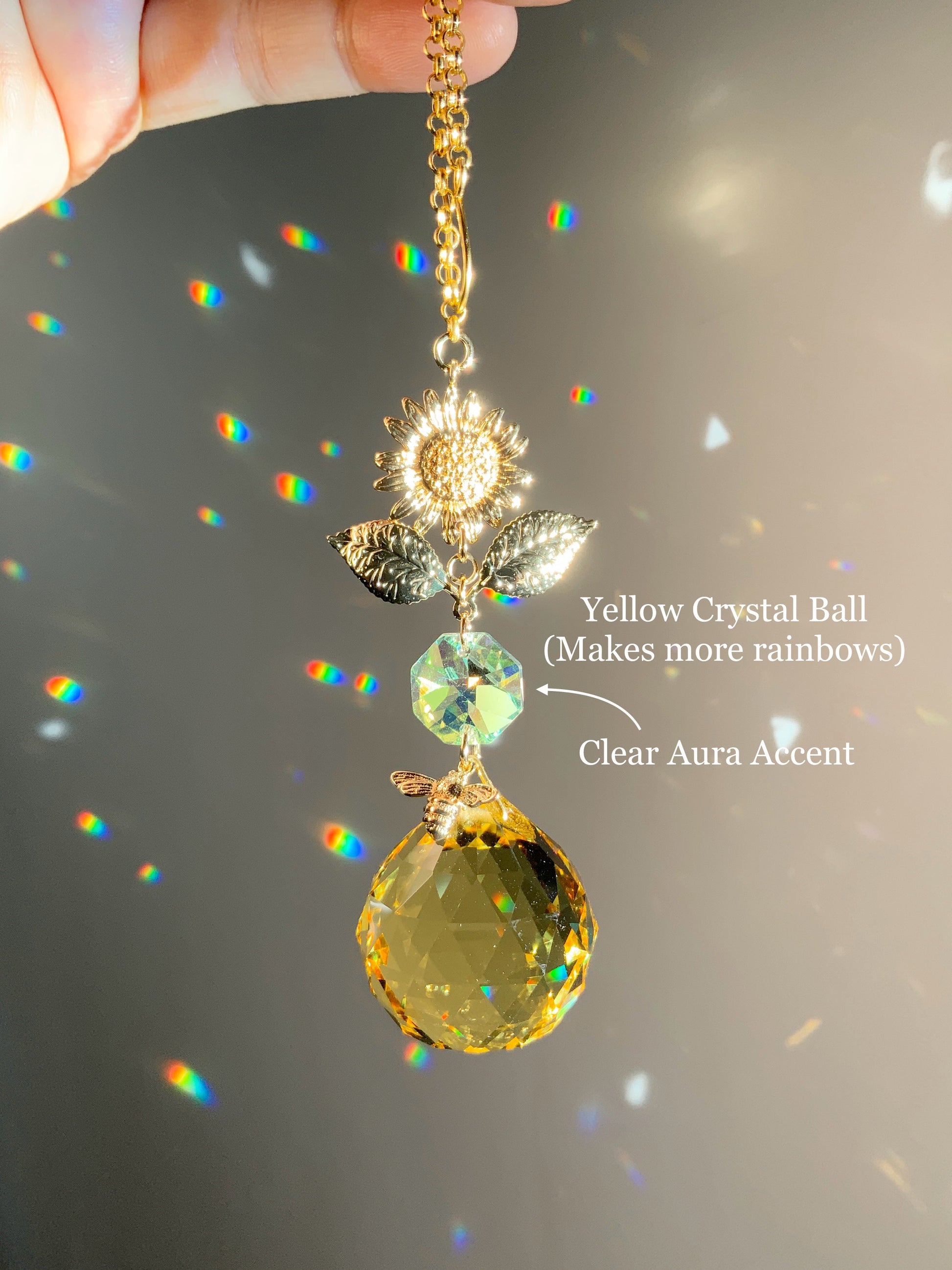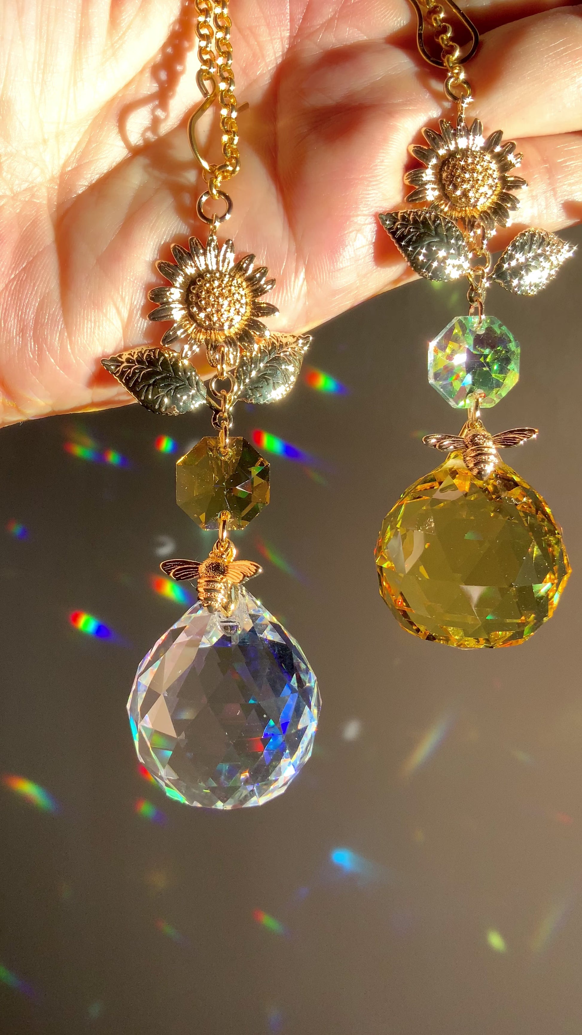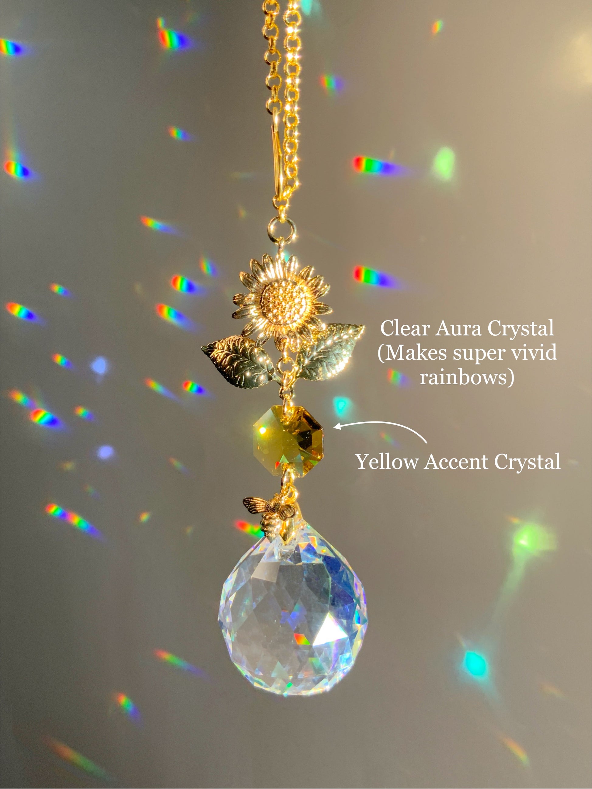 This darling little sparkler features a beautifully detailed 18k Gold-Plated Sunflower with a leafy stem that dangles/wiggles as it moves, with an adorable plump honeybee sitting atop high-quality prisms. 🌼🐝