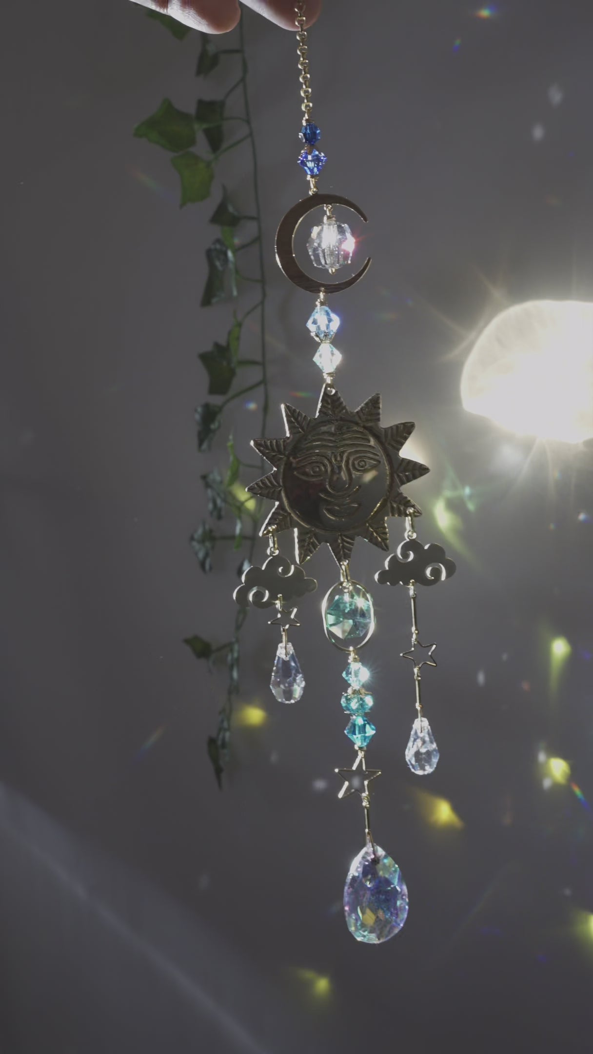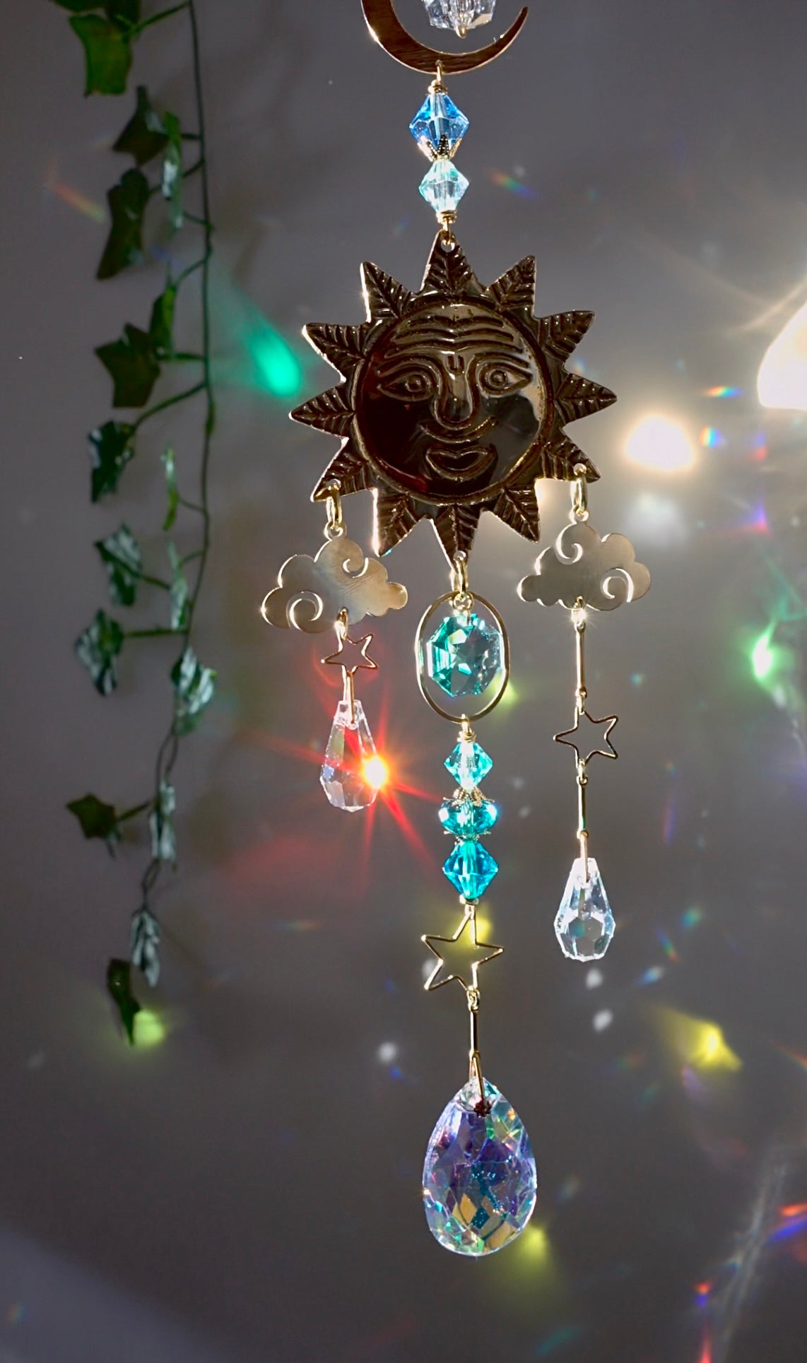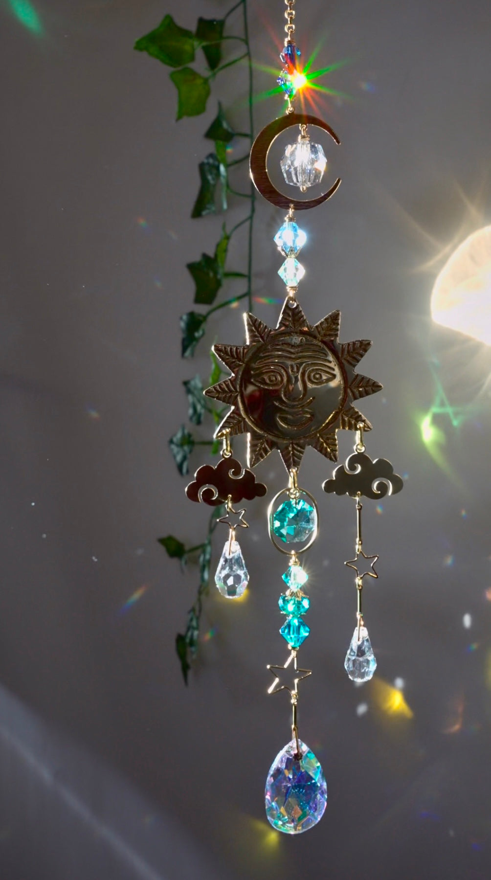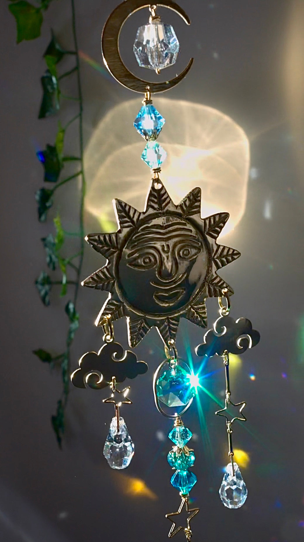 Bright and cheery, and full of glittering crystals, our newest "Sunny Days" Suncatcher features a soothing range of aqua blues, arranged in an ombré/gradient to represent the varching shades of daylight, with a happy Sun God nestled amongst starry Clouds. Hanging above in the darker shades of dusk is a Brass Moon with a plump focal prism. 🌙🌈✨