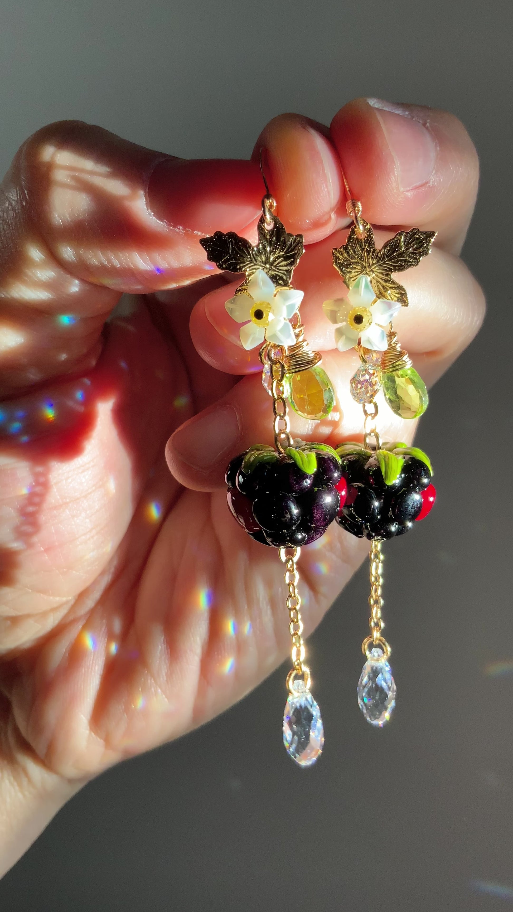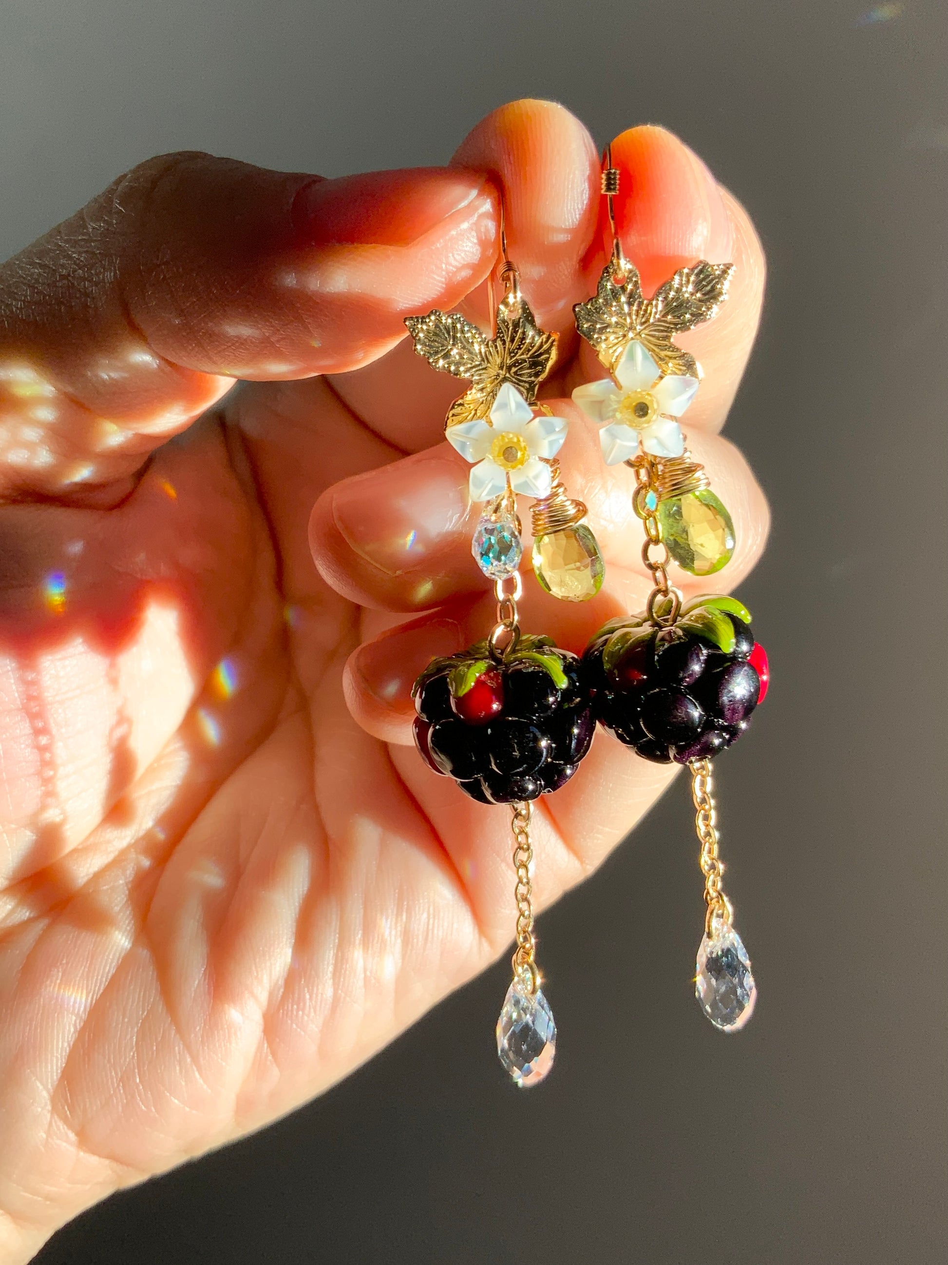 Super Realistic Blackberry Blossom Earrings~ Peridot, Mother of Pearl, Artisan-made Glass, 18k Gold-Plated Crystal Fruit jewelry