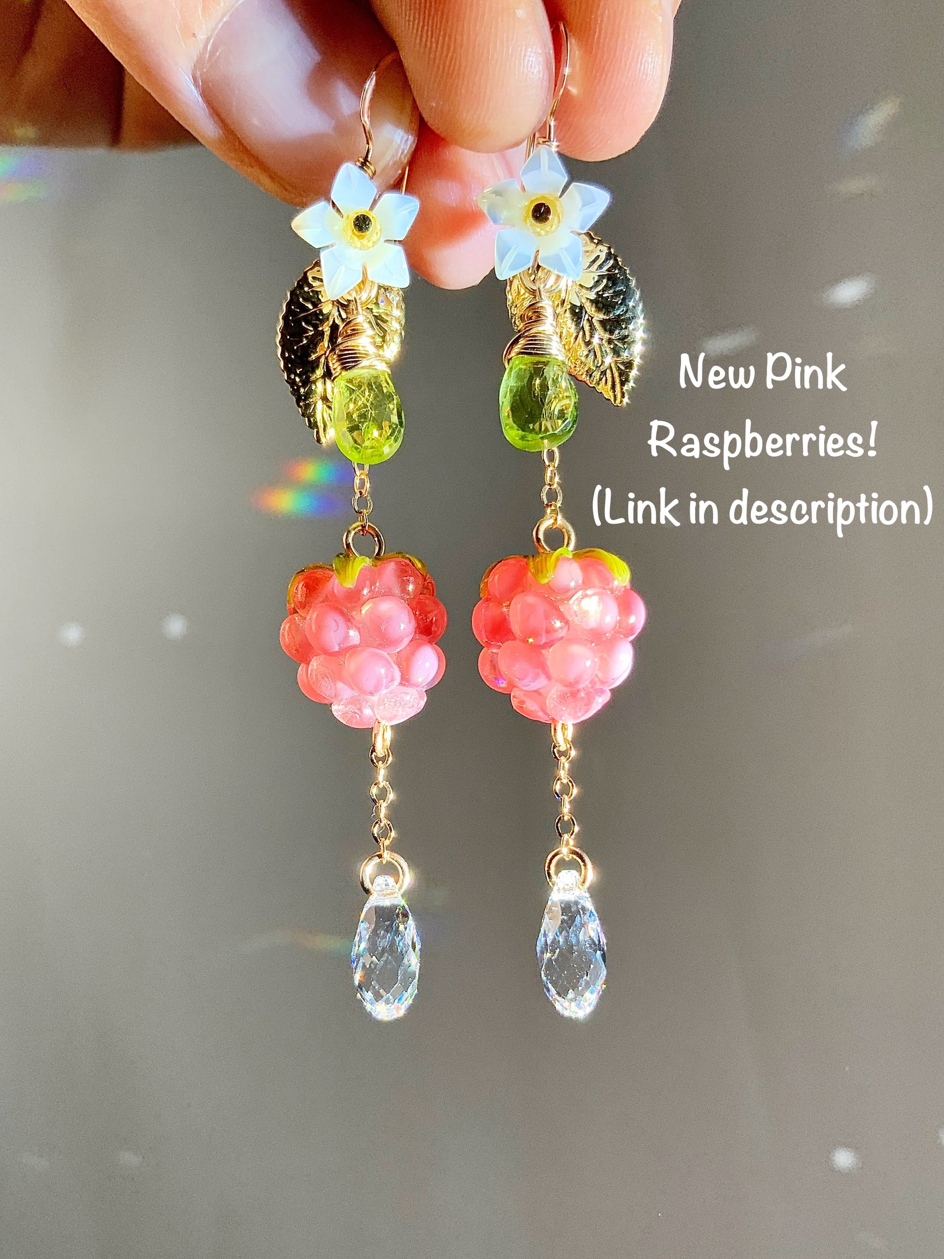 💗 New Pink Raspberries here: https://margayb.com/products/super-realistic-pink-raspberry-blossom-earrings-peridot-mother-of-pearl-artisan-made-glass-18k-gold-plated-crystal-fruit-jewelry-1