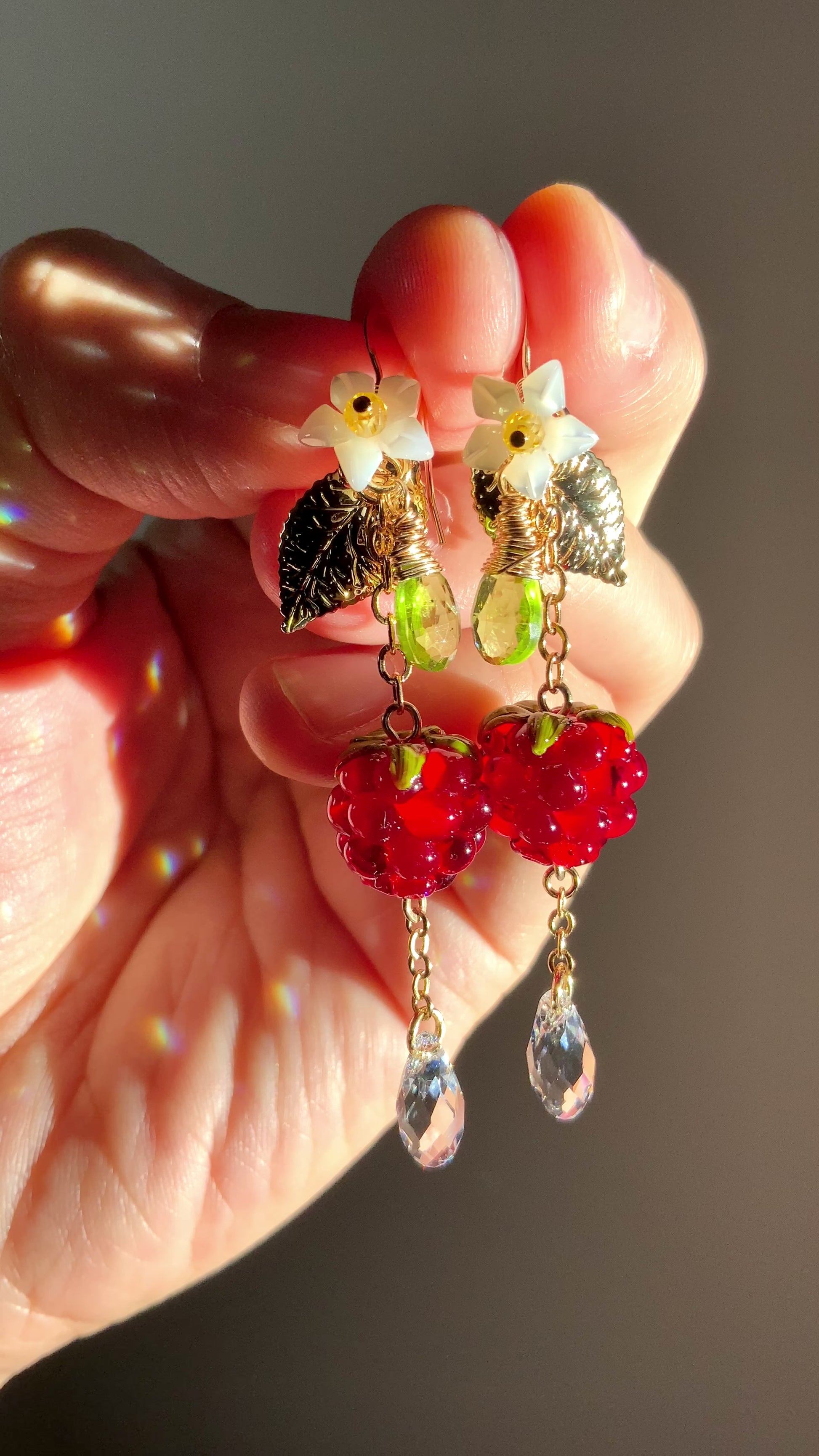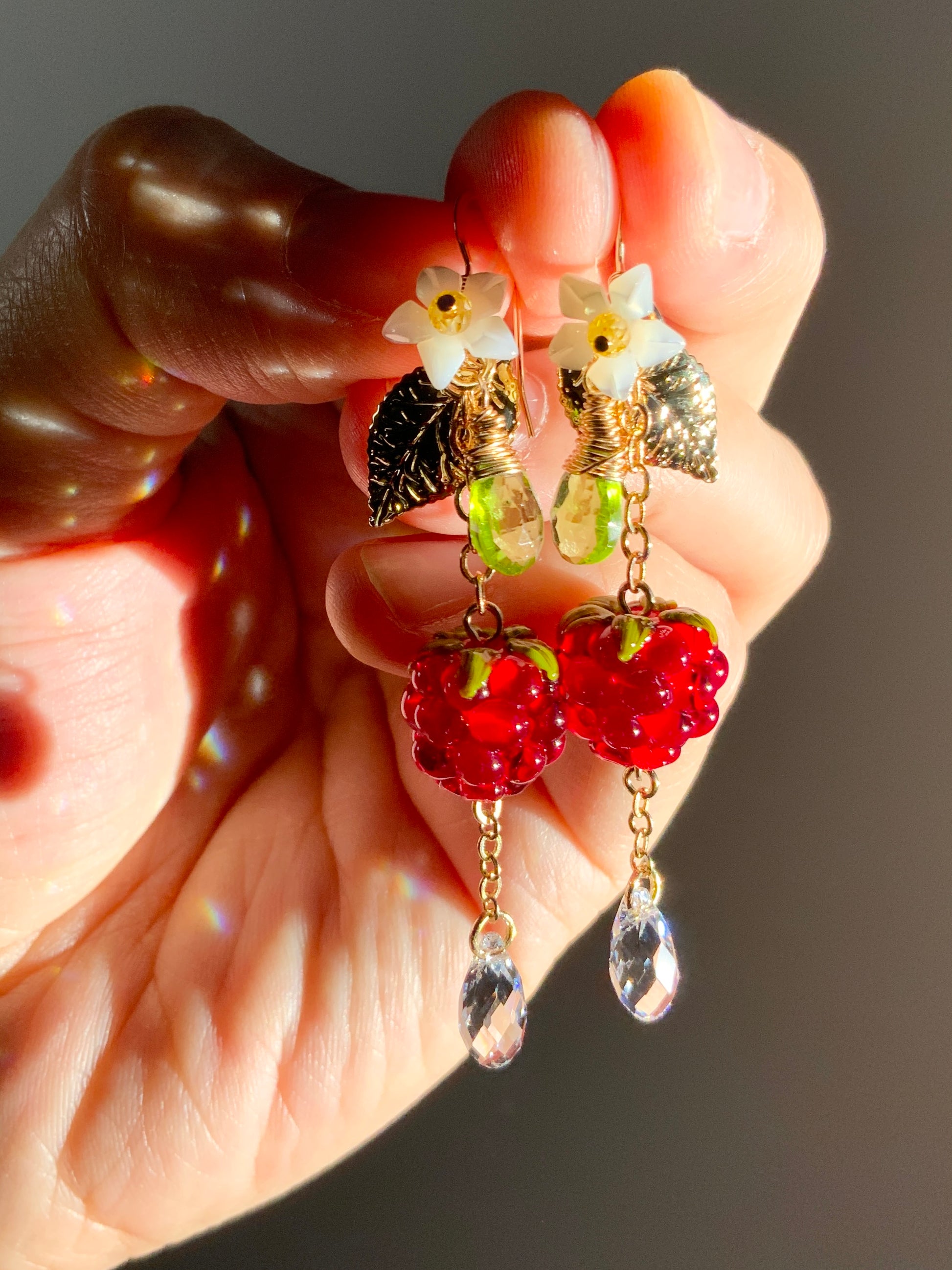 Super Realistic Raspberry Blossom Earrings~ Peridot, Mother of Pearl, Artisan-made Glass, 18k Gold-Plated Crystal Fruit jewelry