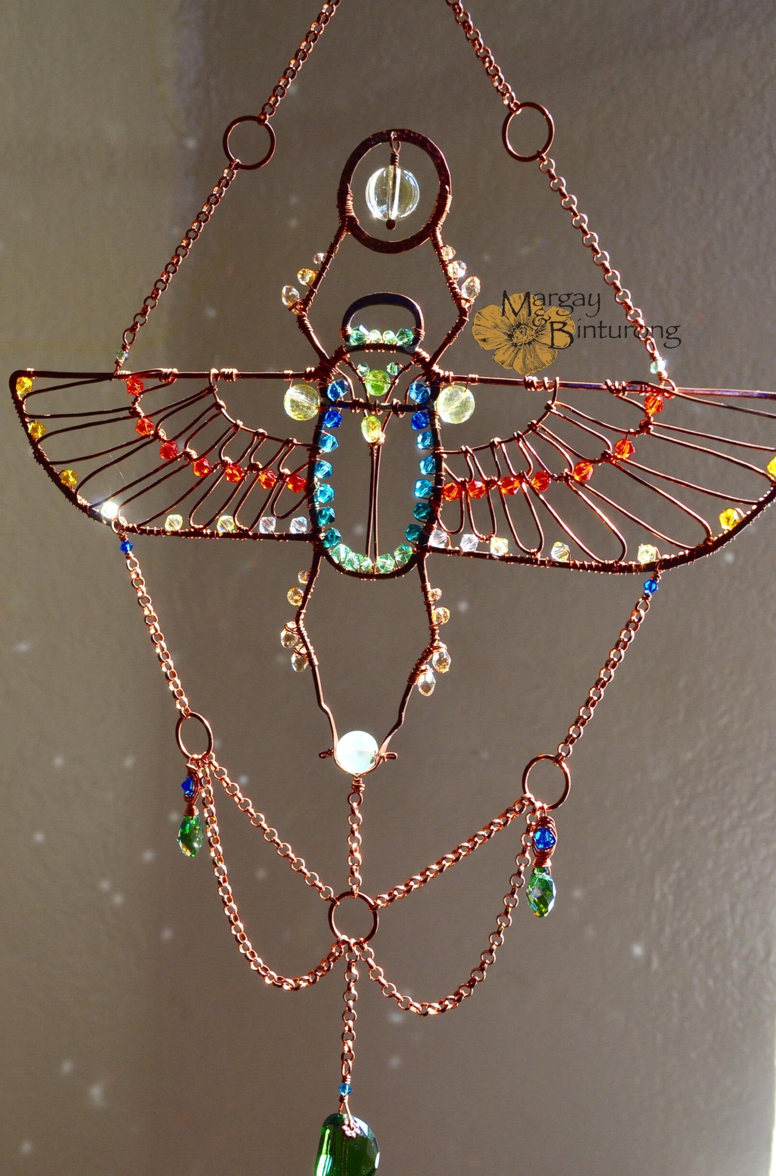 Egyptian Scarab Beetle Suncatcher with London Blue Topaz, Peridot, Prehnite, and Crystal prisms