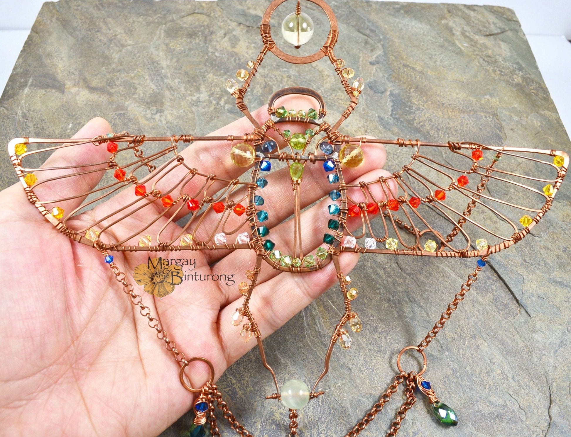 All handmade by me! Featuring soldering work on the body as well as the orb housing the "Sun" (Yellow Quartz dangle). The wing-details proved to be much more challenging than I first imagined, so this is going to be a one-of-a-kind piece. I chose a color-scheme that reminds me of what I see in Egyptian art: ultramarine blues, bright oranges/reds and greens, and golden colors as well. The Crystals in the lower part of the wings are an ombre/gradient yellow to clear. This project was very involved, and I not only feel quite proud of the finished piece, but also quite attached to it. It has a special place in my heart. ❤️