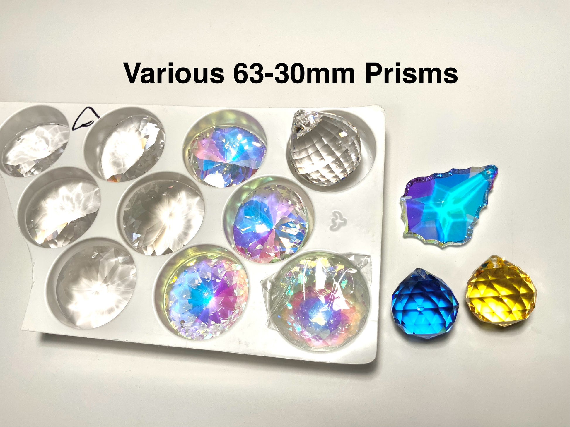 All of these are still perfectly capable of rainbow-making, they just have dings or scuffs on the AB/aura coating, and I’m too much of a worrywort to use them for our business. 🙃