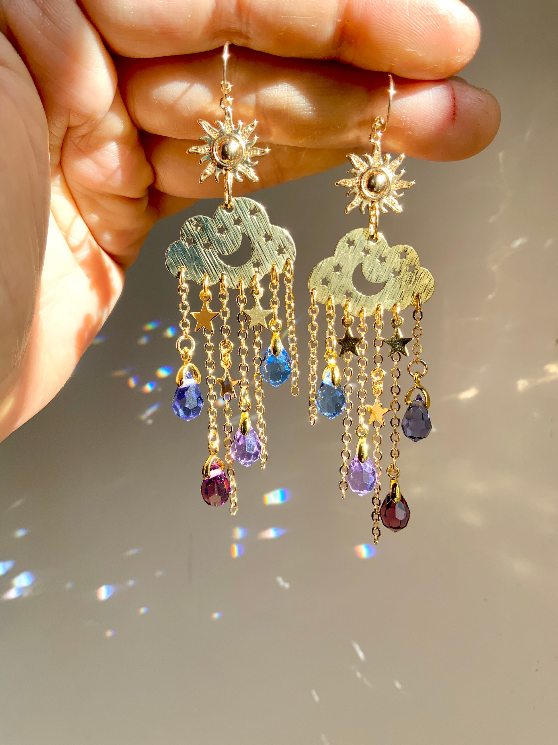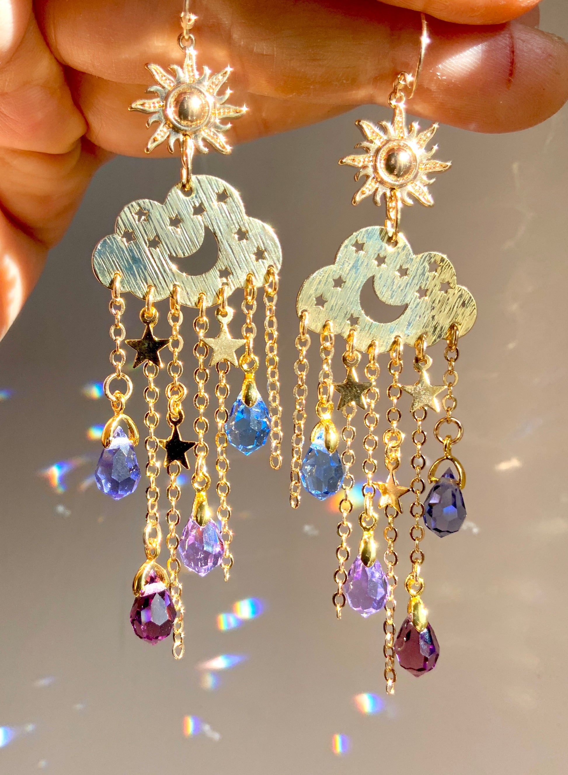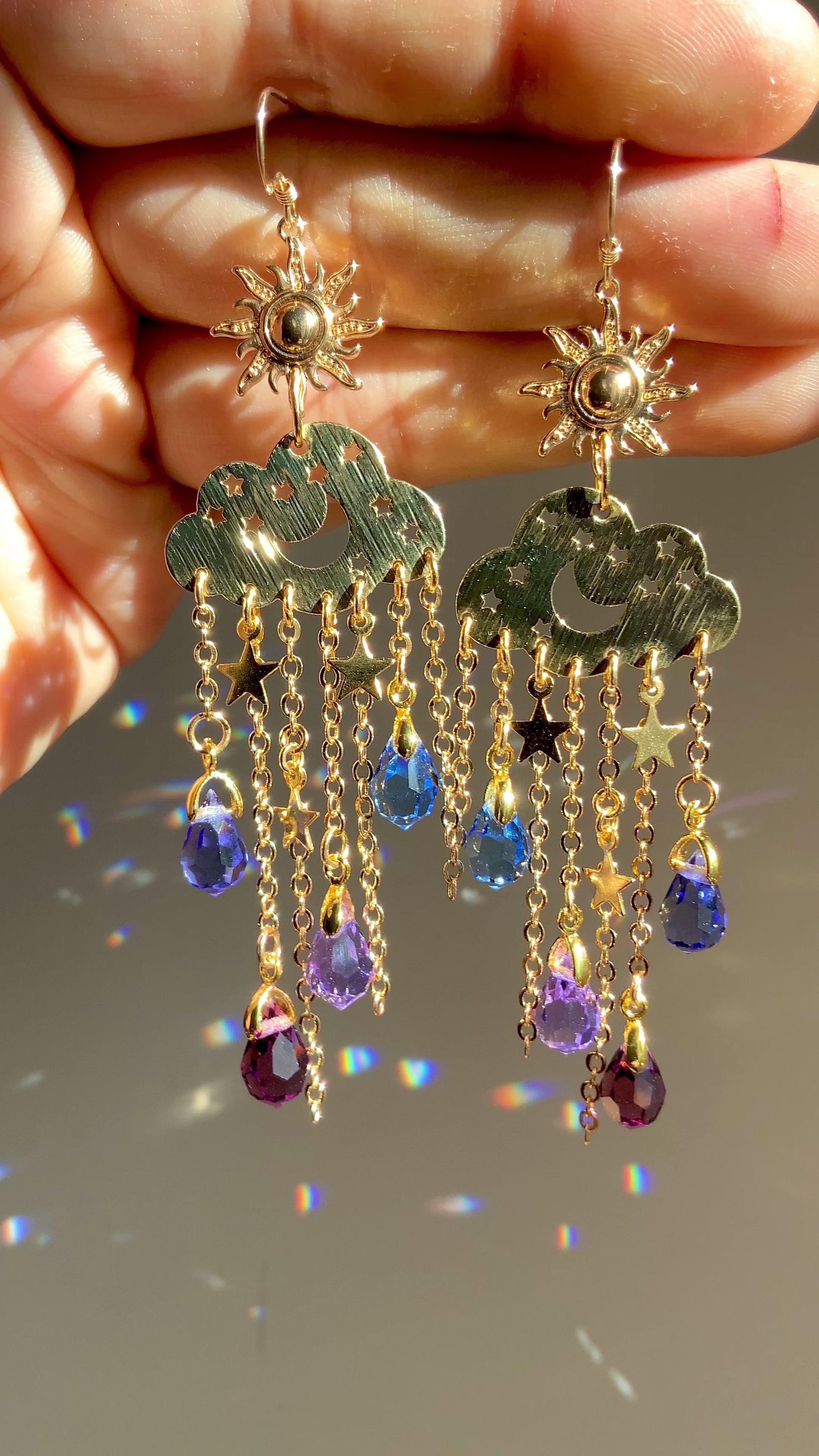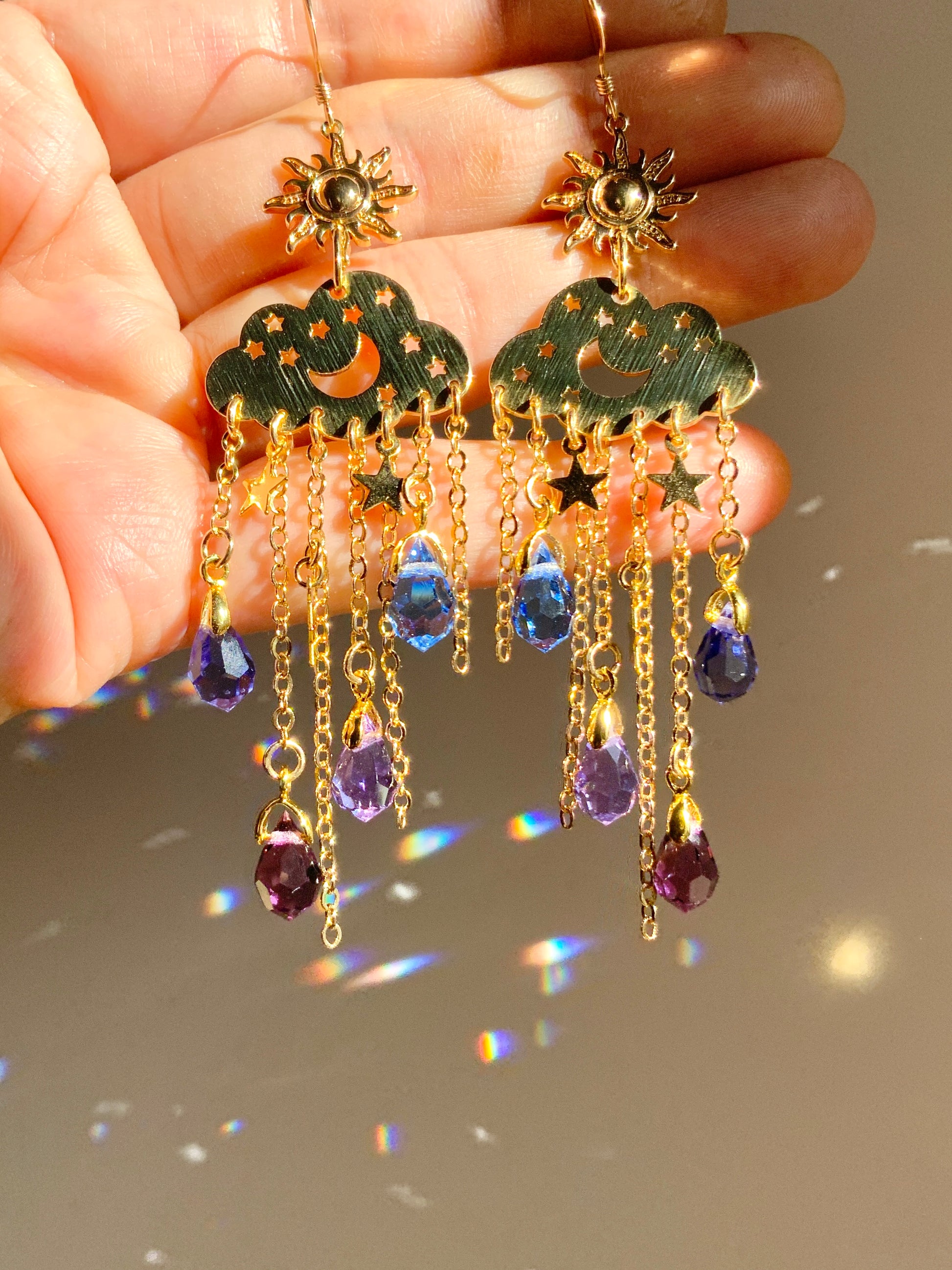 Ombré Purple Blue Crystal Rain Cloud earrings~ 18k Gold-Plated Sun Moon Celestial prism Suncatcher jewelry