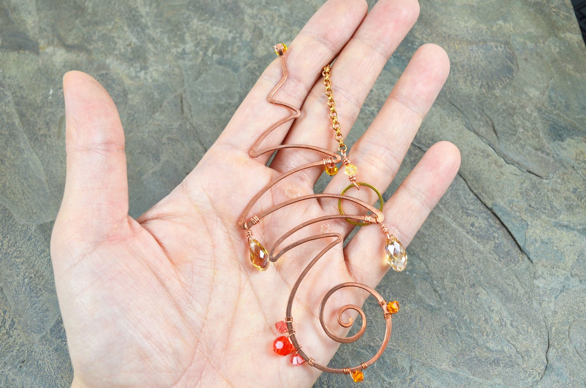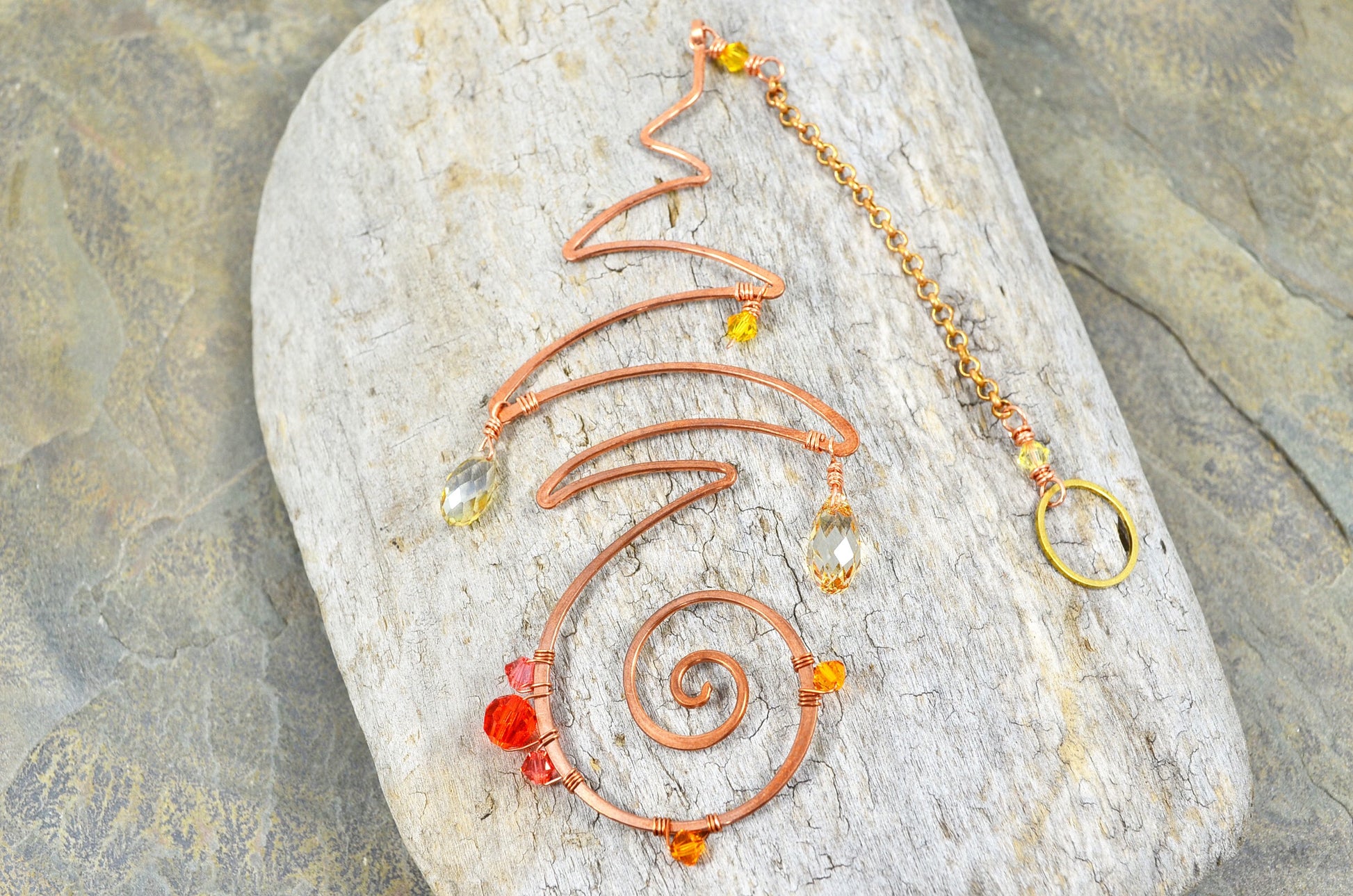 Part of our fun, new mini-suncatcher series of three Unalome-inspired designs of tranquility, passion, and love, the colors selected for this piece represent passion, reflected with fiery oranges and golden yellows.