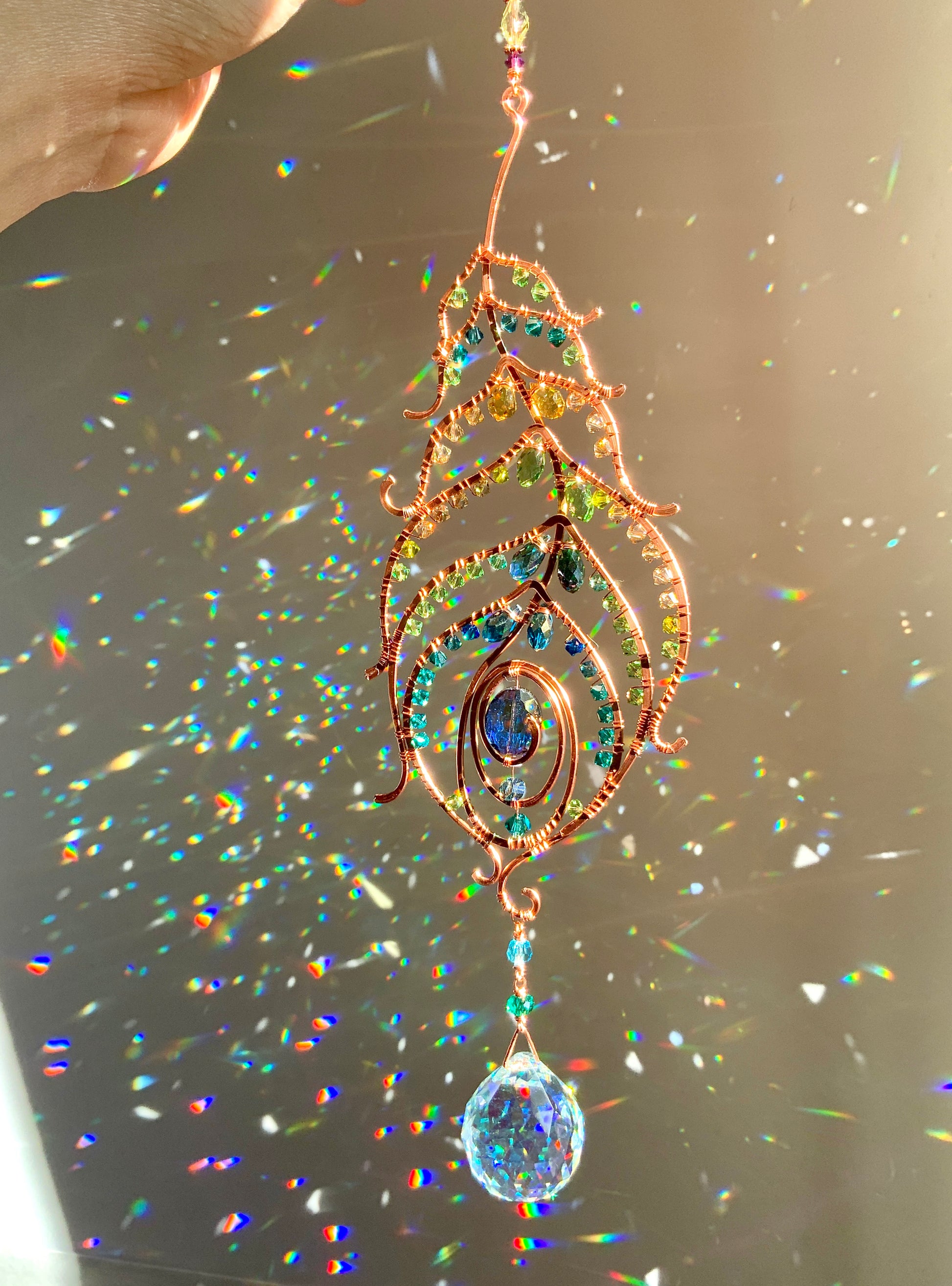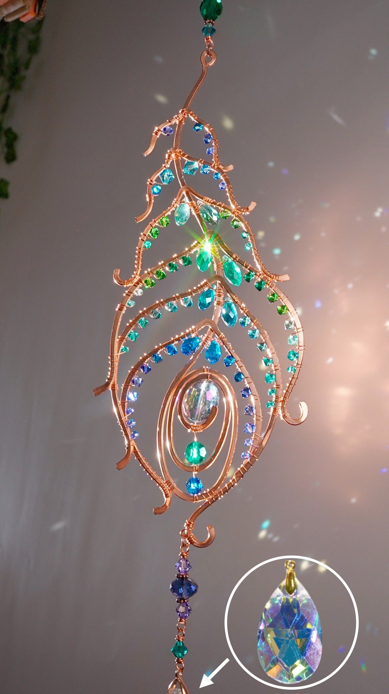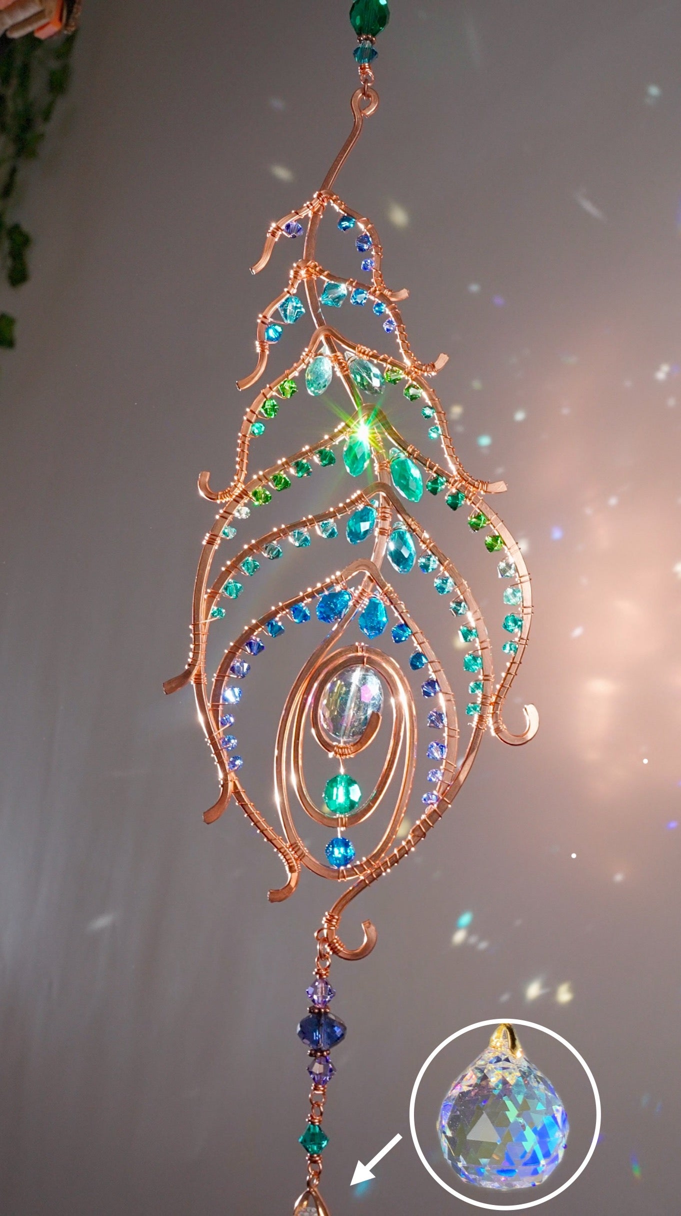 Peacock feather gemstone suncatcher fills the room with sparkles from crystal prism beads