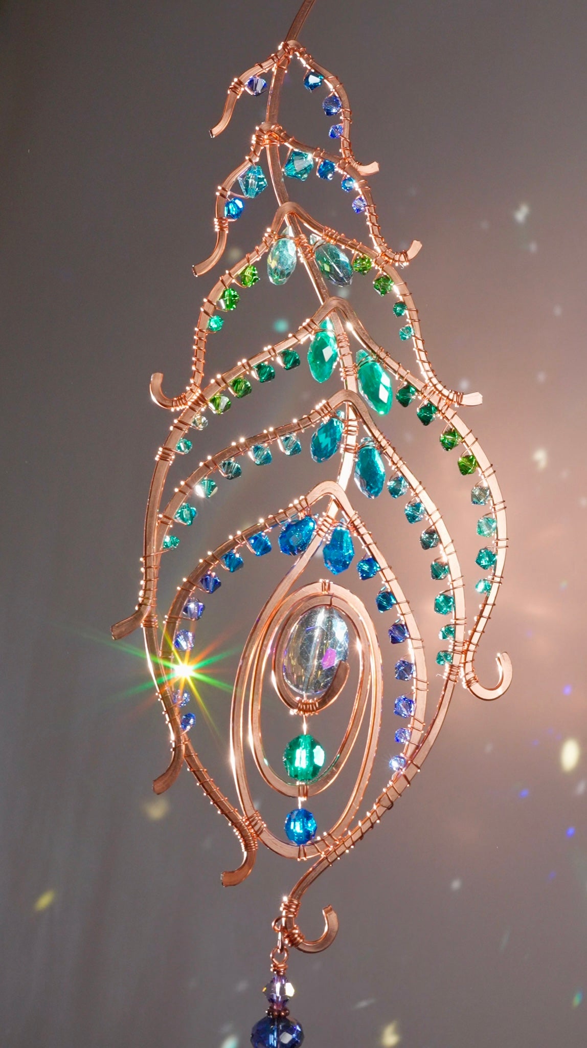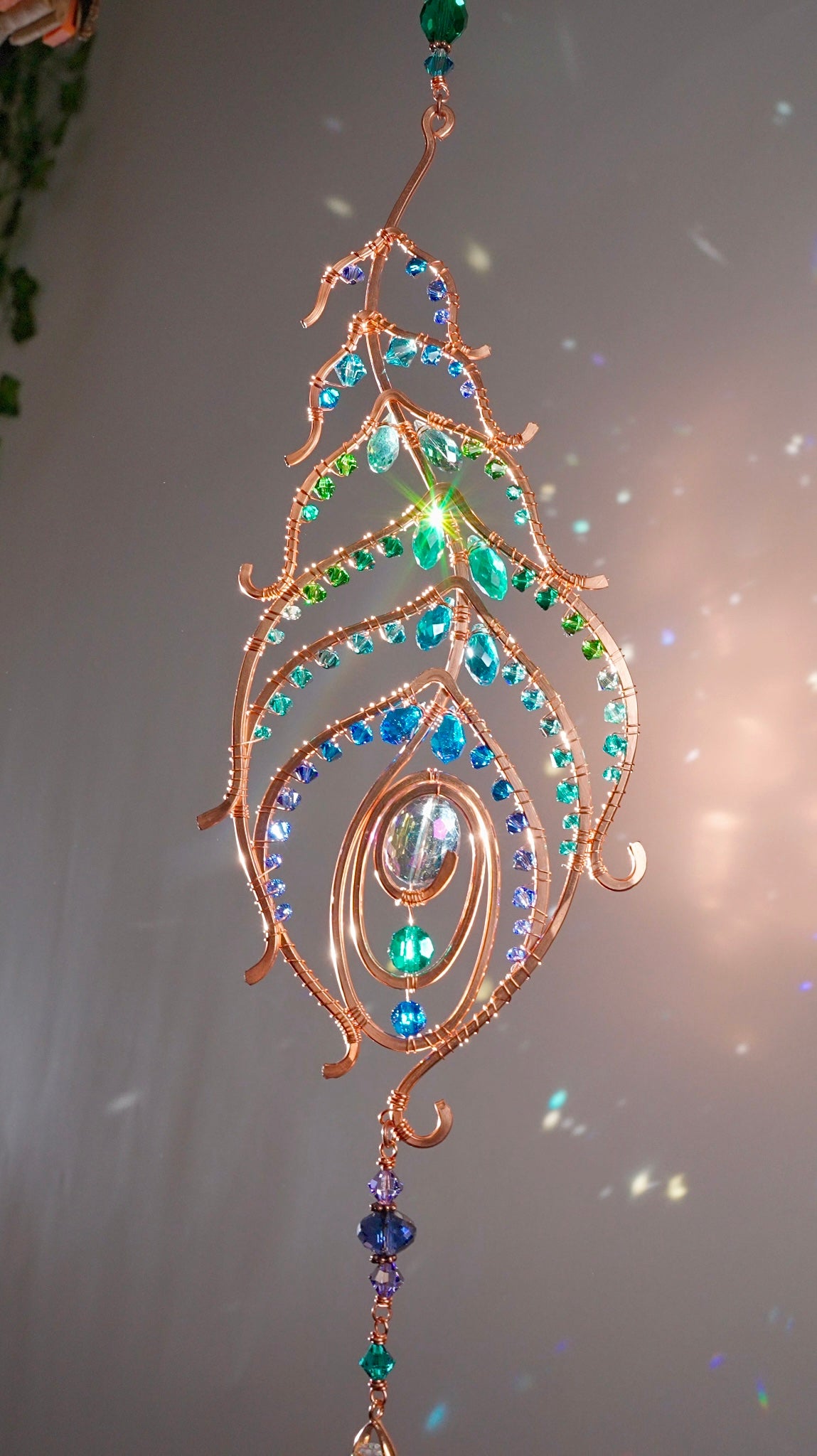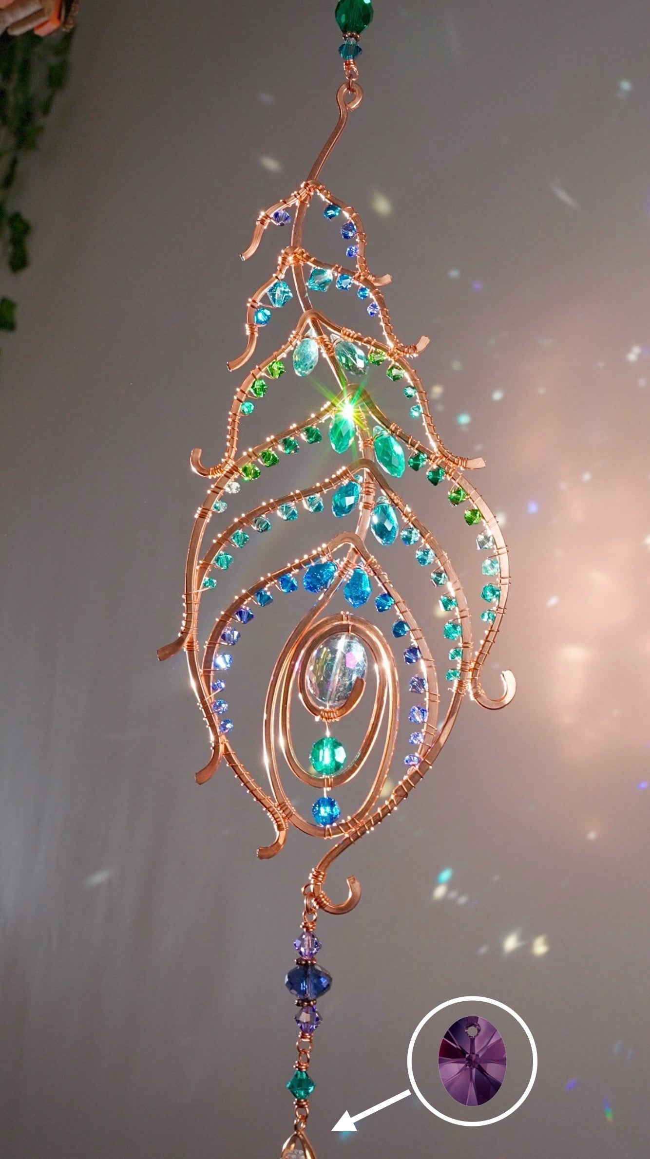 Peacock feather gemstone suncatcher fills the room with sparkles from crystal prism beads