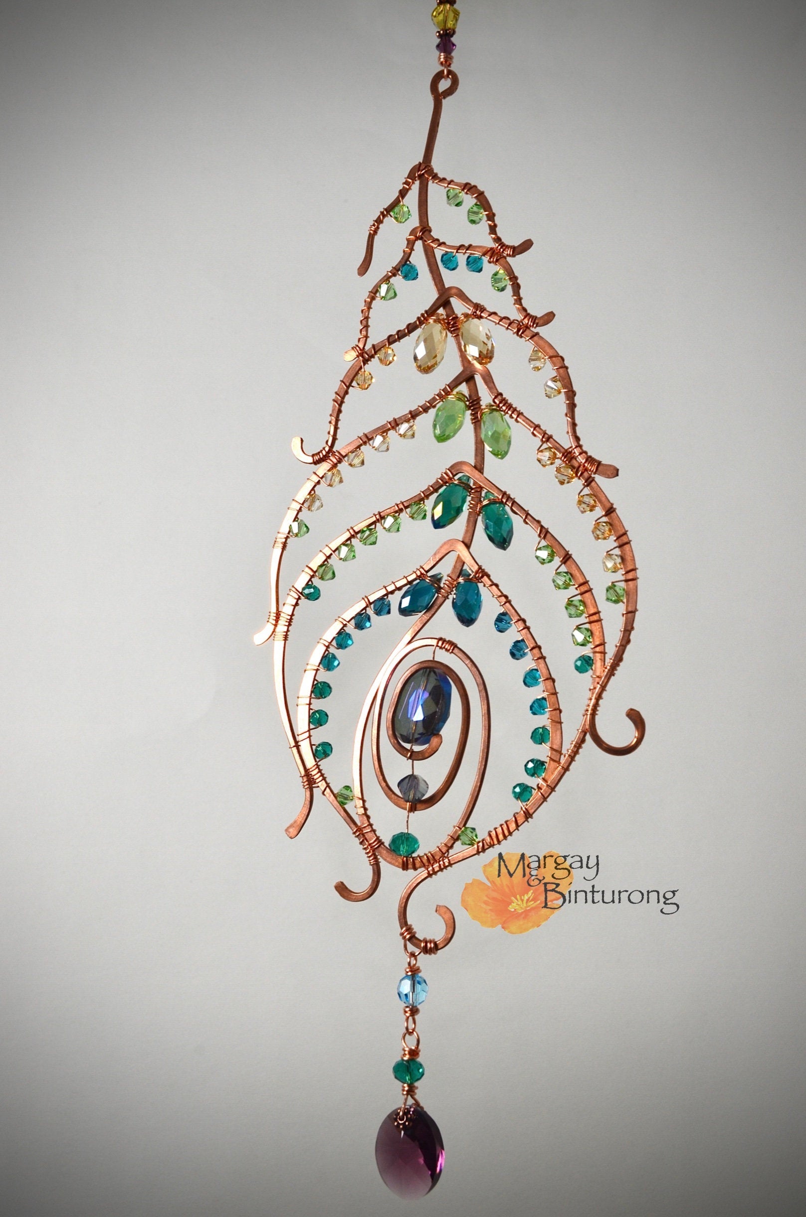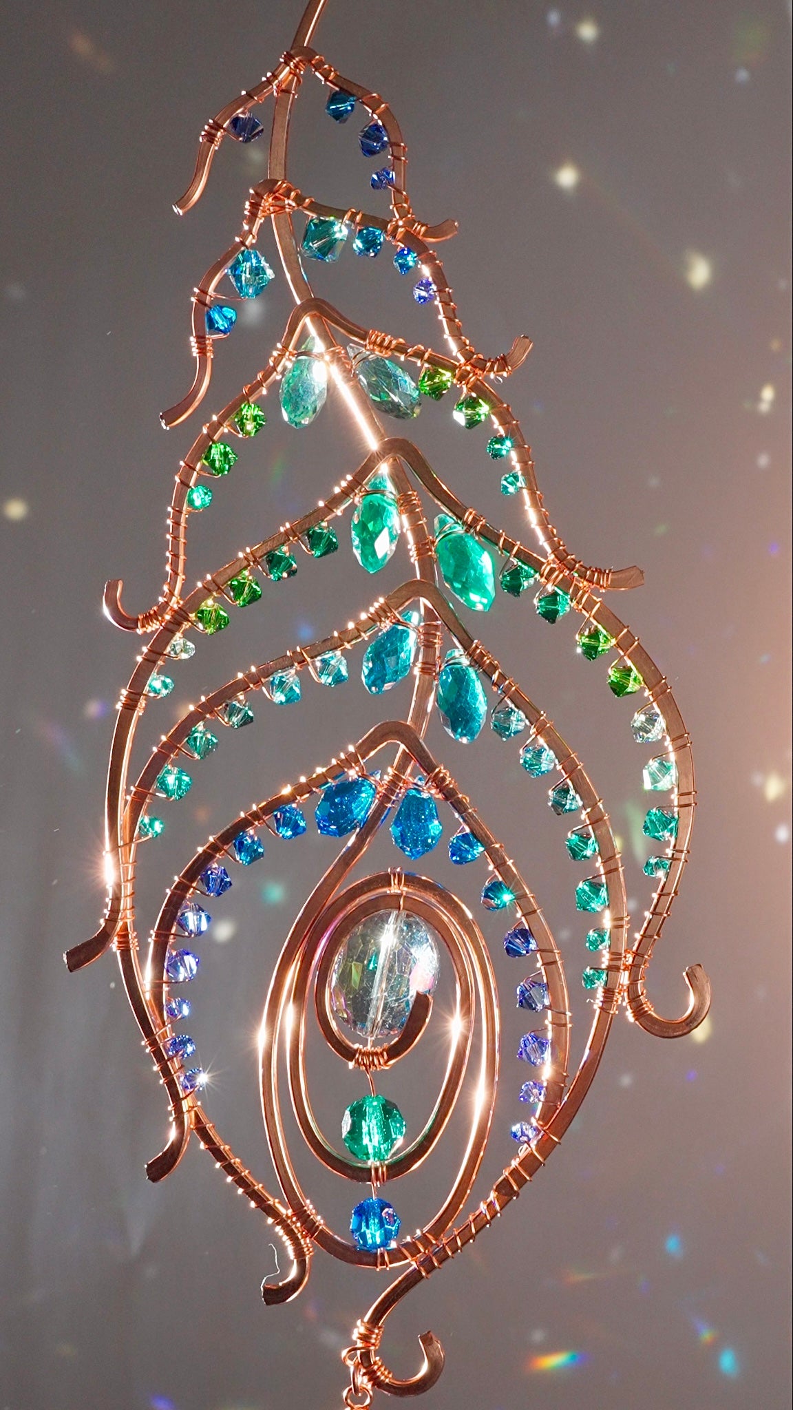 Every single aspect of this Peacock Feather was conceived, sketched on paper, designed, hand-formed from different gauges of solid Copper wire, hammered and wrapped together by me. 💎