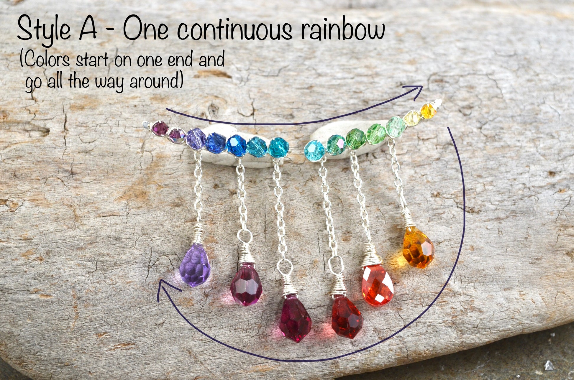 🌈 Style A - the rainbow starts on one end, goes all the way down to the other ear climber, then goes down the drops back to the other side.