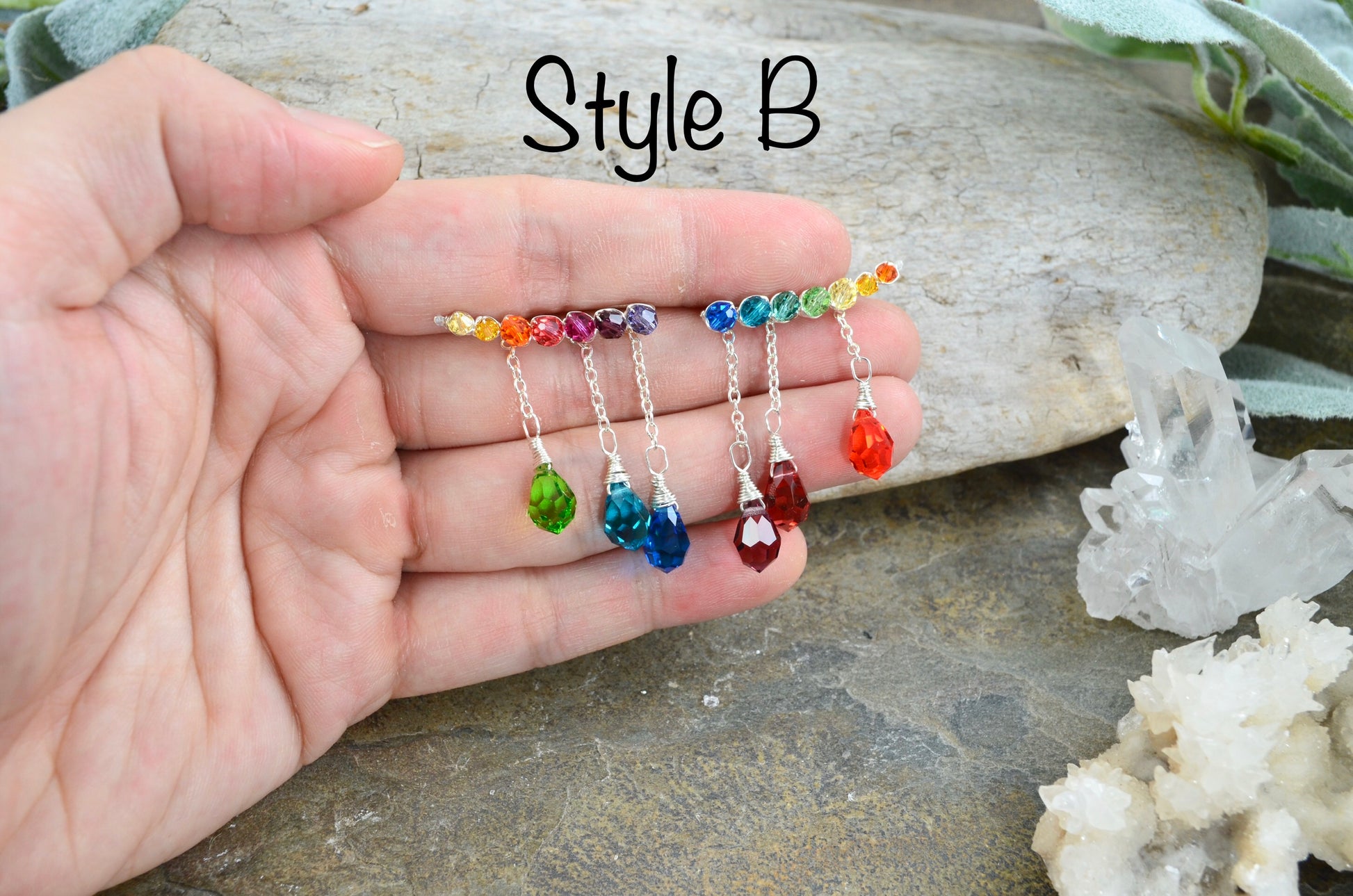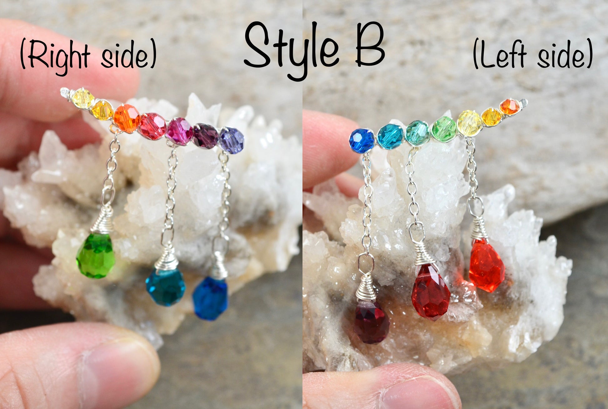 🌈 Style B - each ear climber has a self contained rainbow, beginning at the start of the ear climber, then ending at the drops. The other climber has the reverse colors.