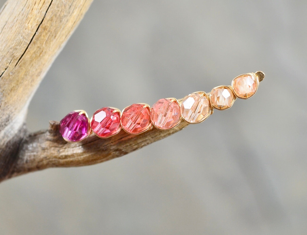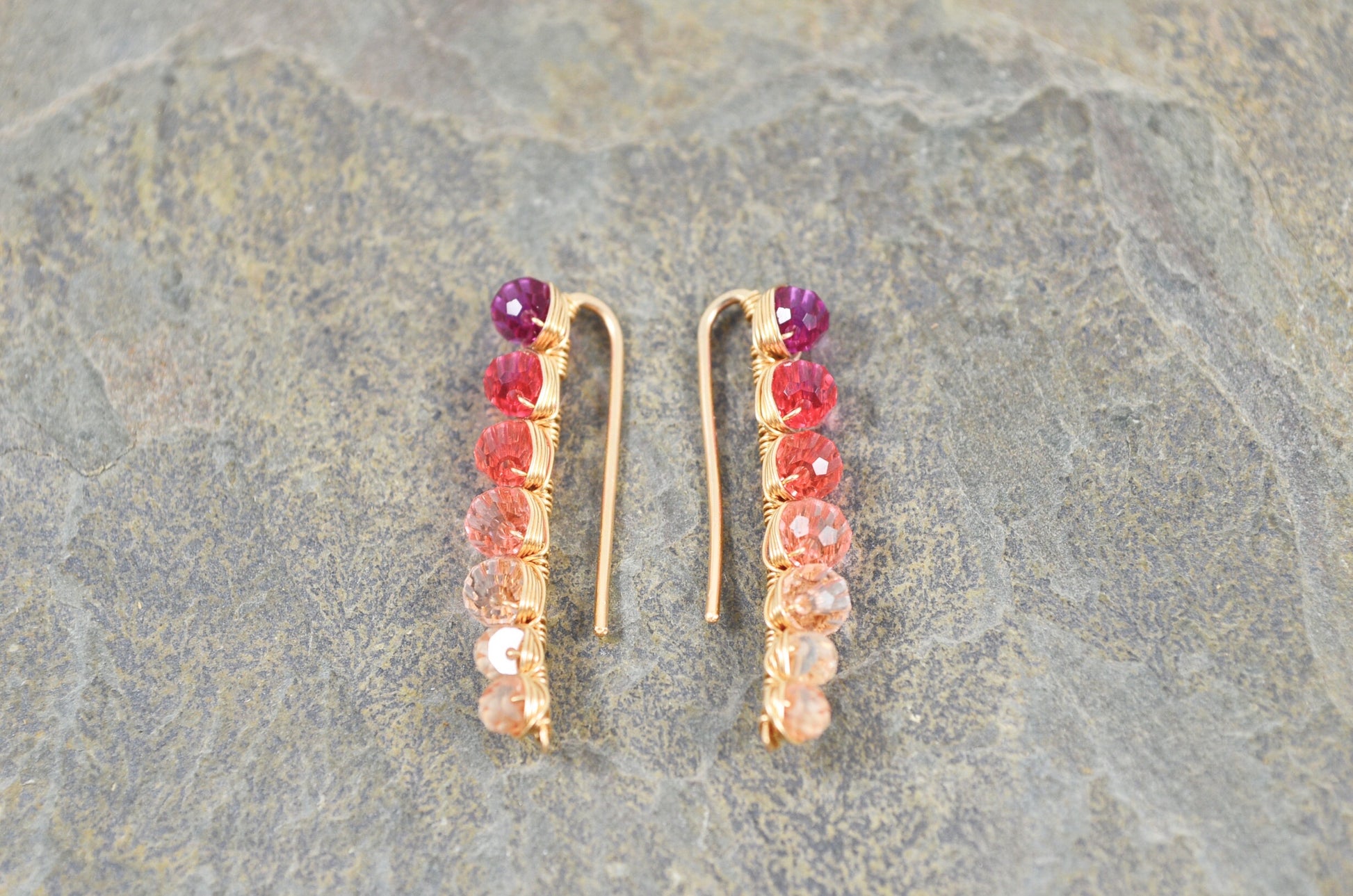 Ruby Grapefruit ombré Crystal Ear Climbers in Sterling Silver or 14k Gold Fill, ear crawler earrings