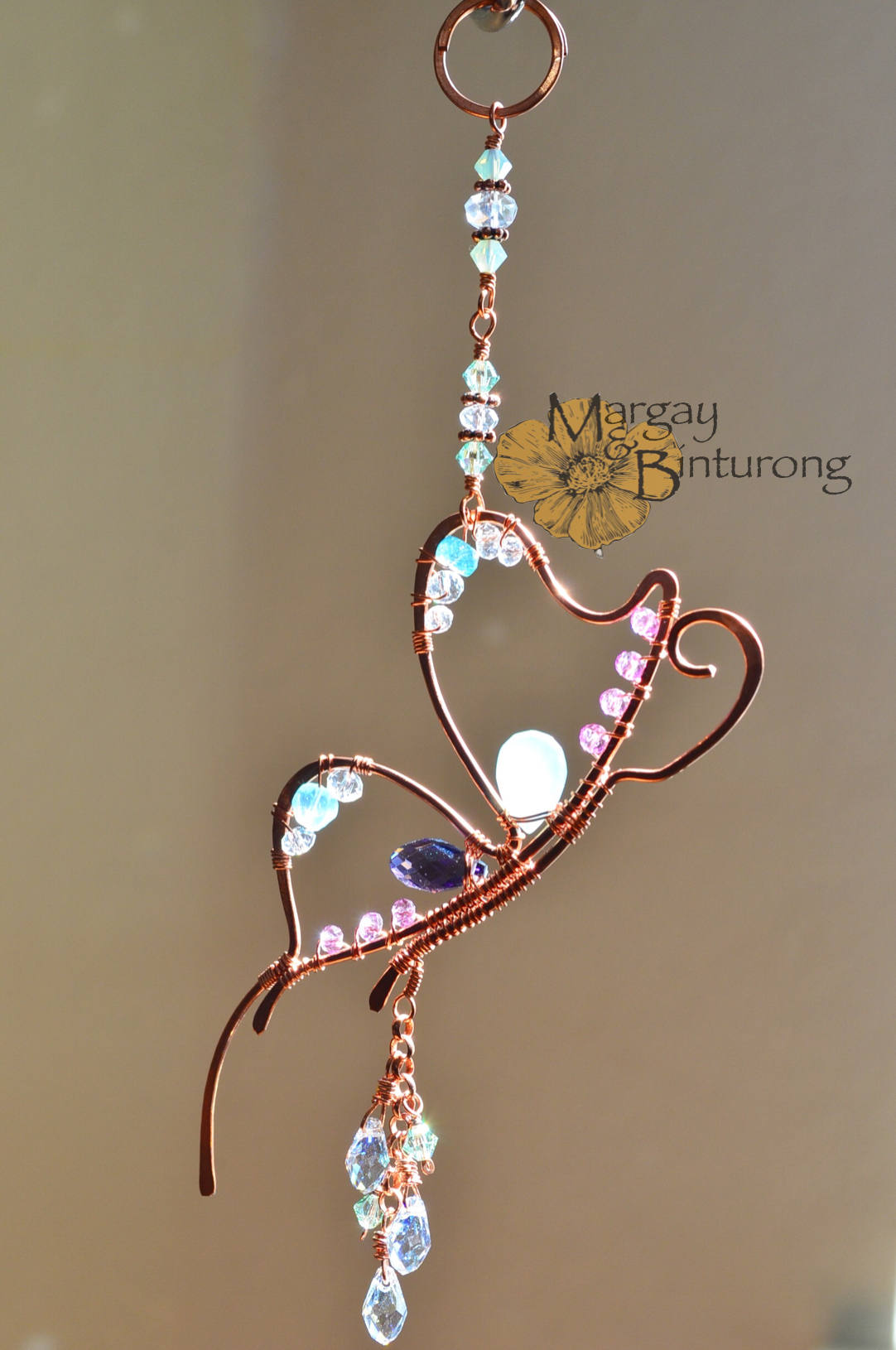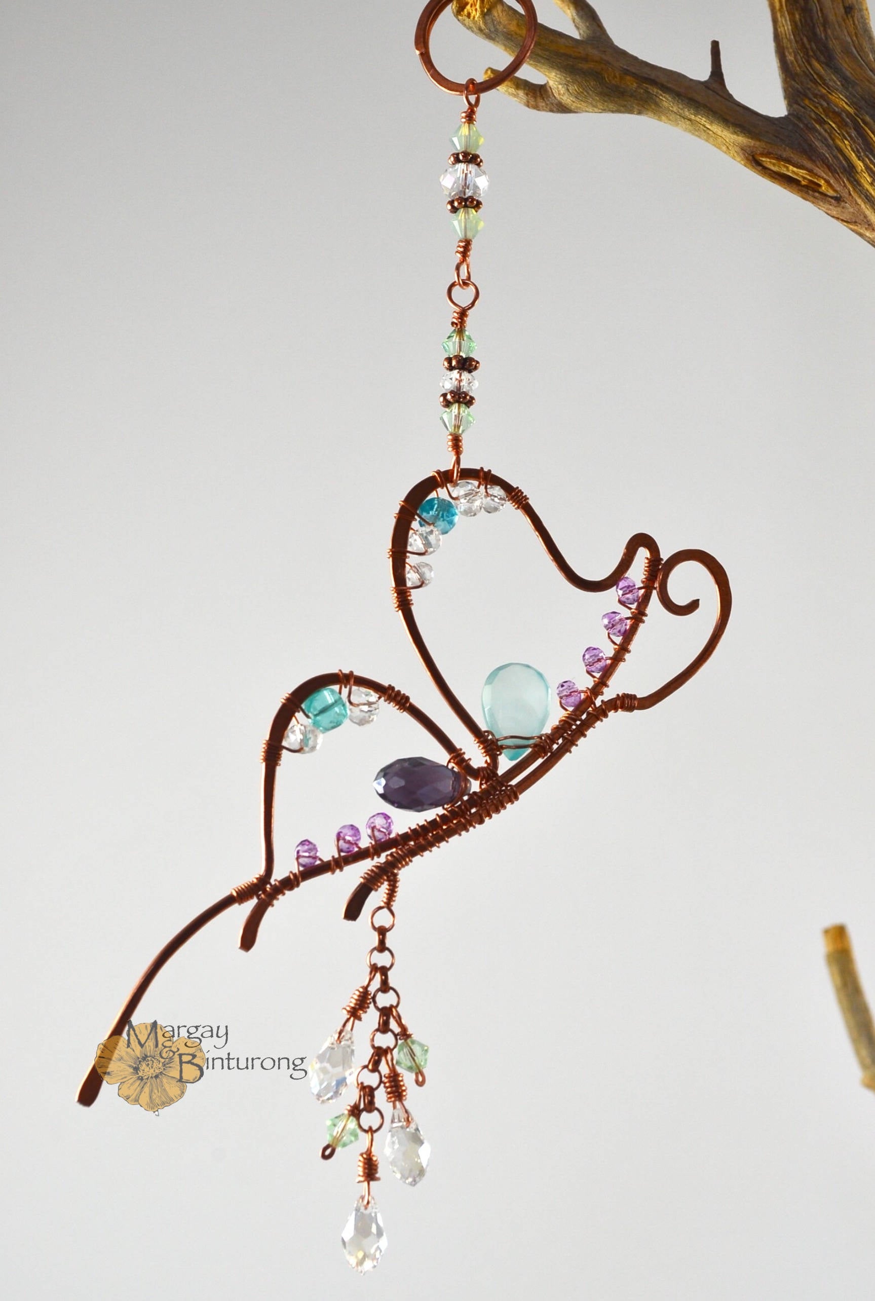 Every single aspect of this sweet little Butterfly was conceived, sketched on paper, designed, hand-formed from different gauges of solid Copper wire, hammered and wrapped together by me.