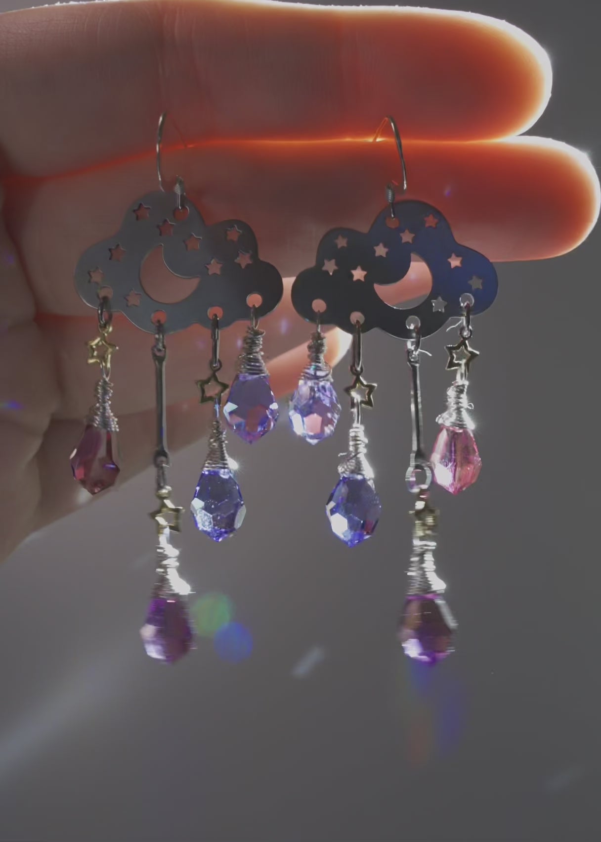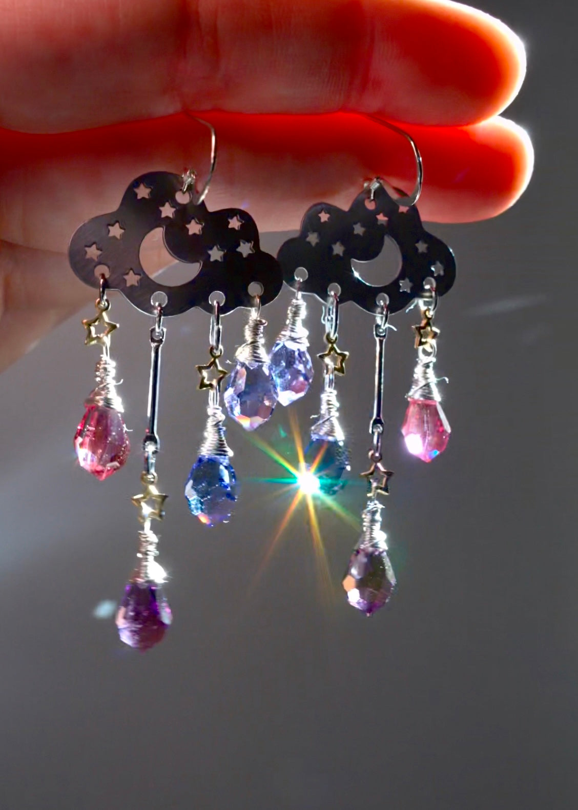 These dazzling Rain Cloud beauties feature glittering ombré sunset-inspired crystals, carefully wire-wrapped to swing and dance as you flow throughout your day! Featuring high quality crystal prism drops in 4 different shades of magenta, purple, and violet! 🙀🌈✨ The Stainless Steel clouds have a soft, satin-brushed finish, with moon and Star cutouts. Dangling below are teeny tiny brass stars. ✨