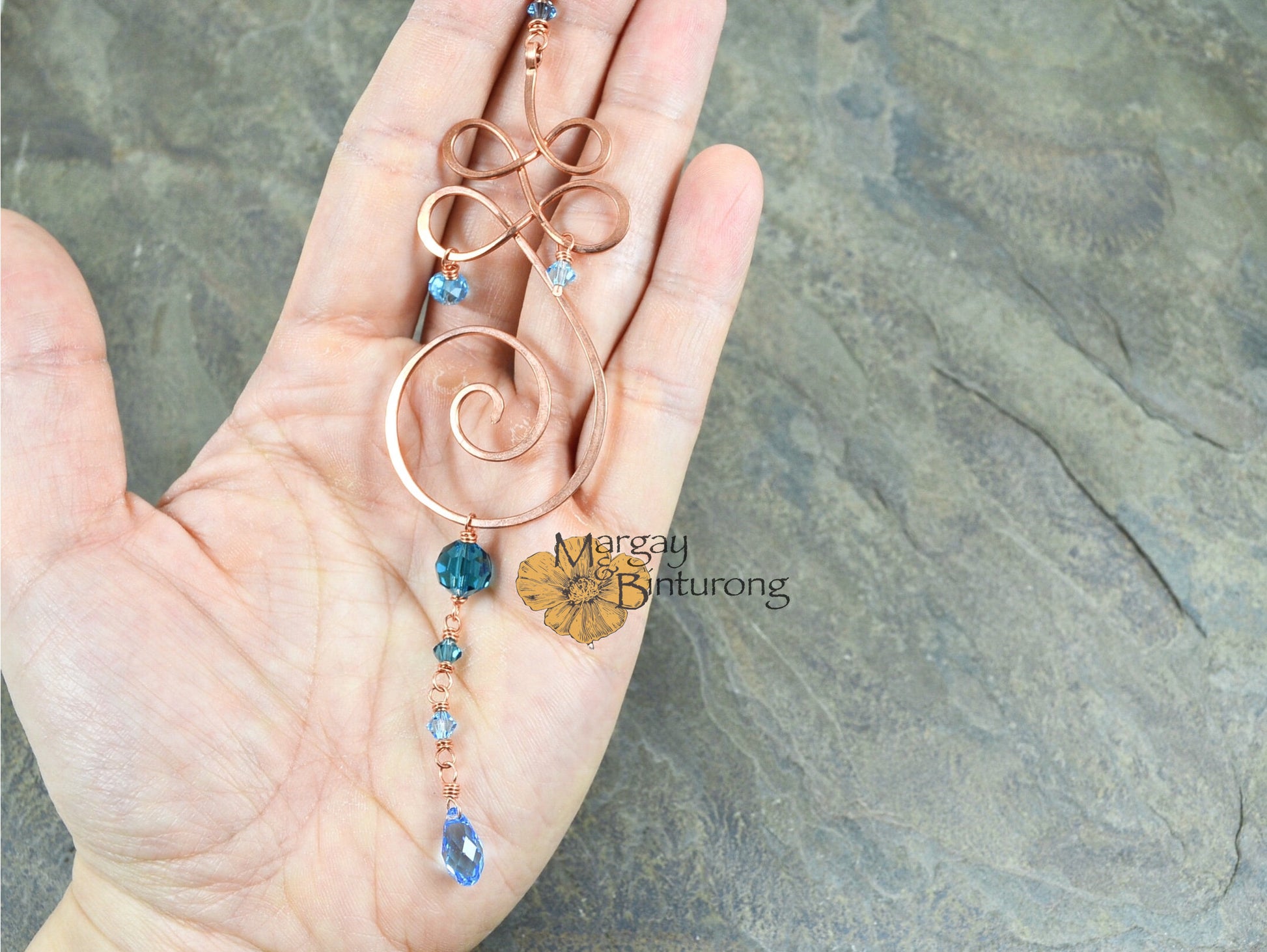 Part of our fun, new mini-suncatcher series of three Unalome-inspired designs of tranquility, passion, and love, the colors selected for this piece represent tranquility, reflected with sky blues and deep teal blue.
