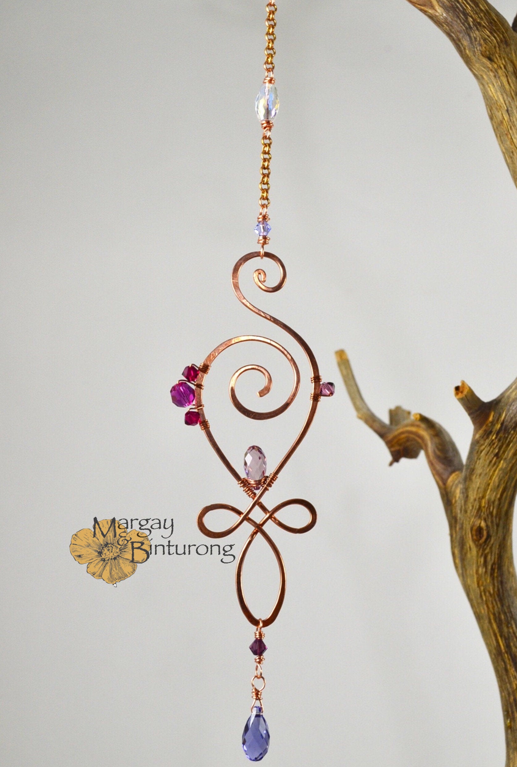 Part of our fun, new mini-suncatcher series of three Unalome-inspired designs of tranquility, passion, and love, the colors selected for this piece represent love, reflected with deep, ruby pinks and violet purples.