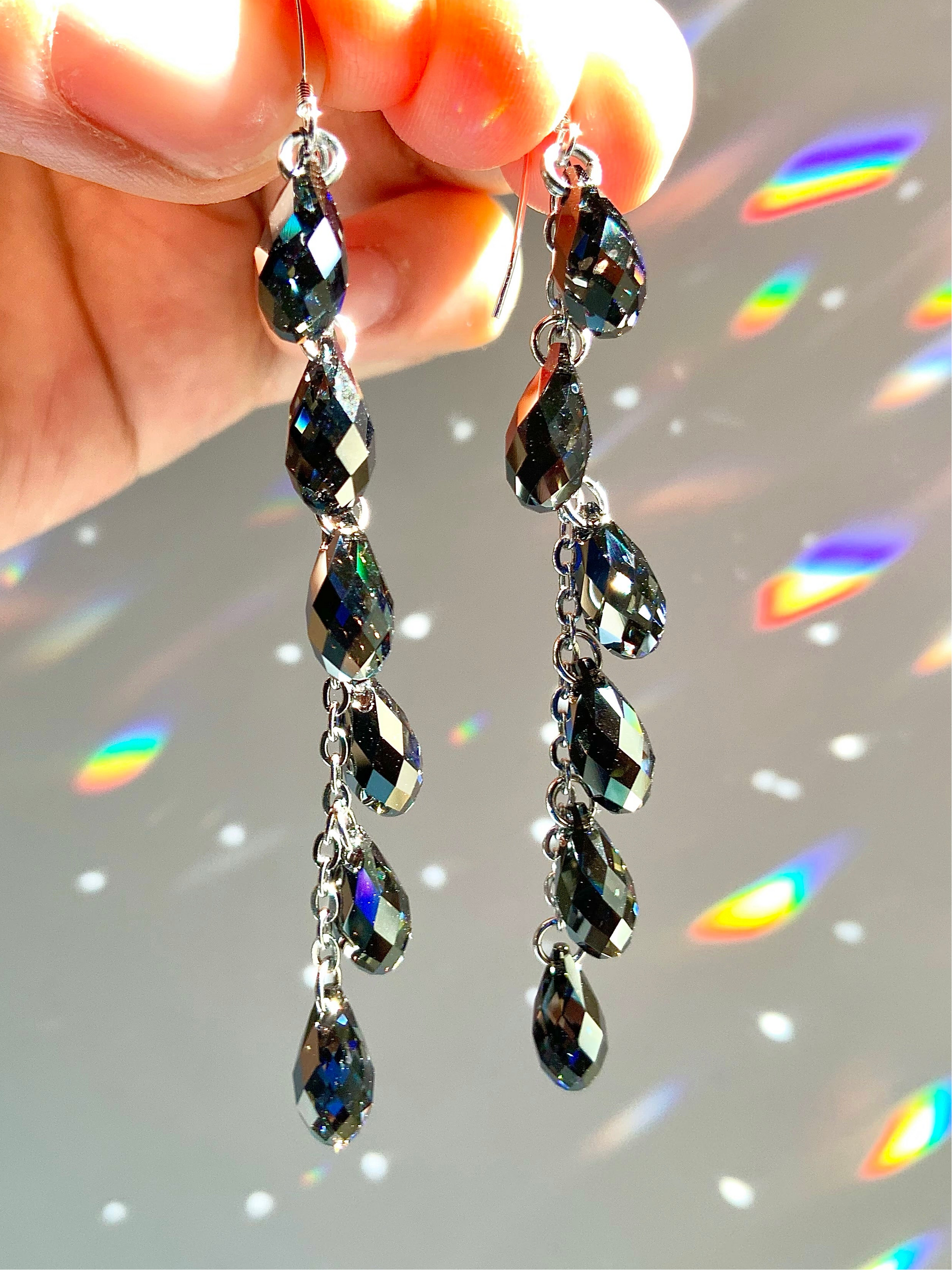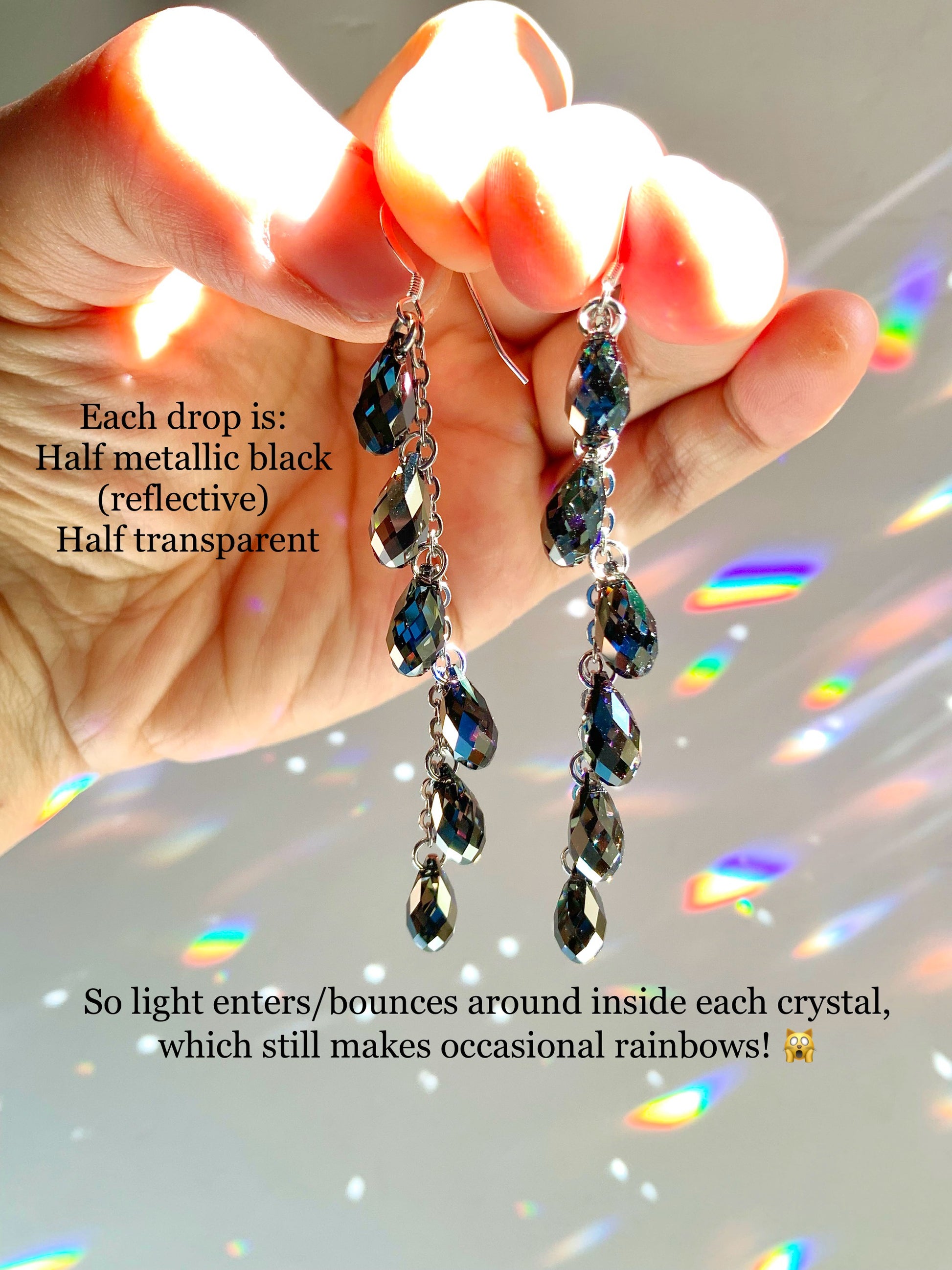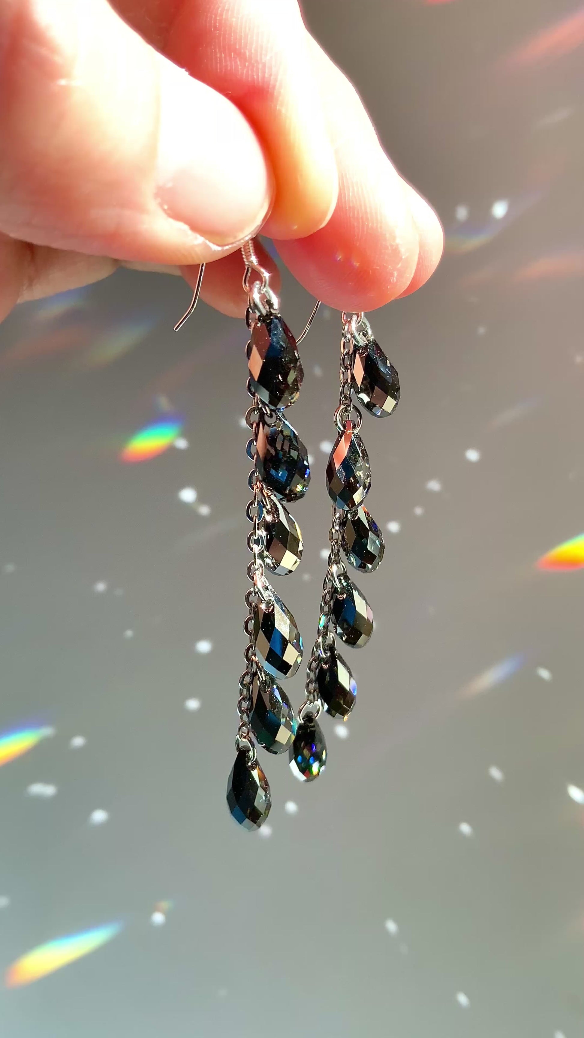 These earrings feature a total of 12 gem-cut, luxe water drop Crystals that glitter and sparkle in their silvery metallic black charm, while still making occasional rainbows! 🌈✨