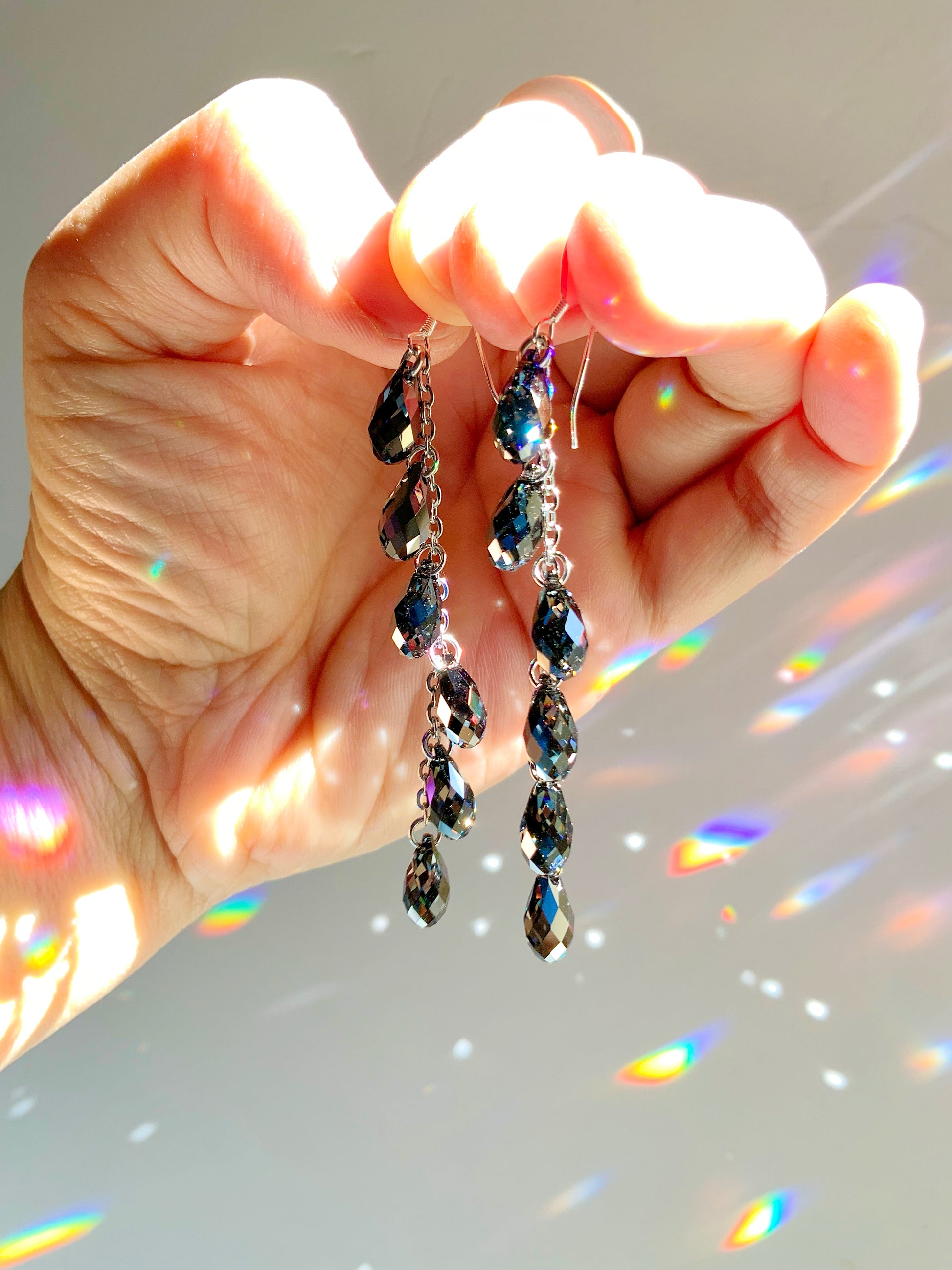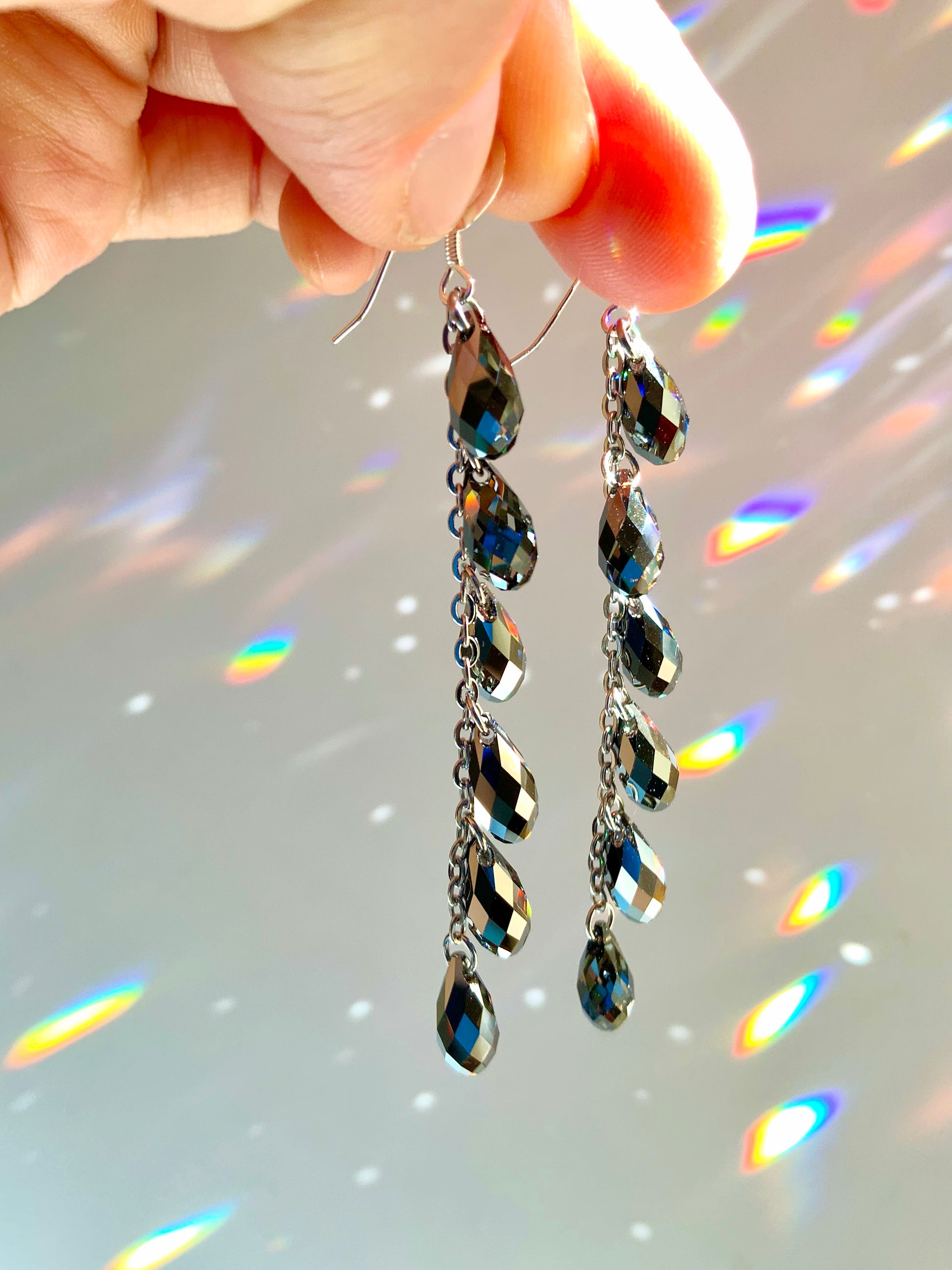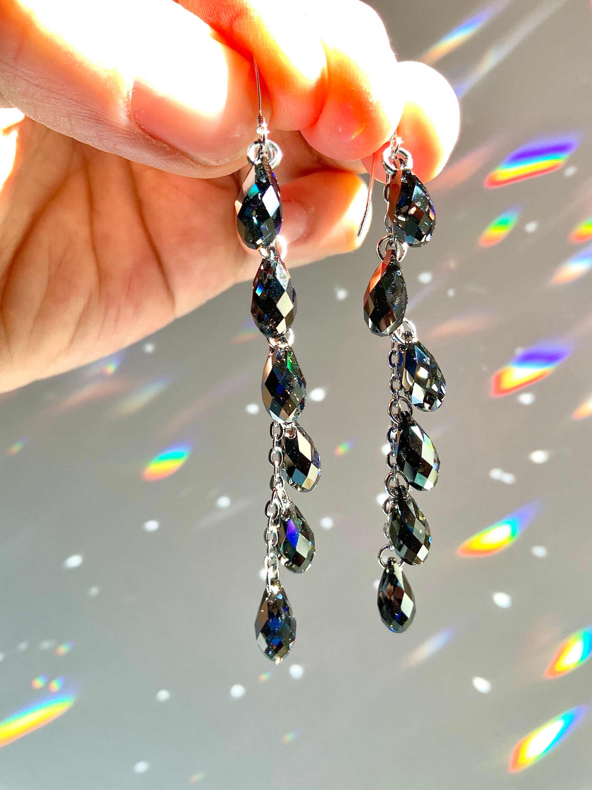 These earrings feature a total of 12 gem-cut, luxe water drop Crystals that glitter and sparkle in their silvery metallic black charm, while still making occasional rainbows! 🌈✨