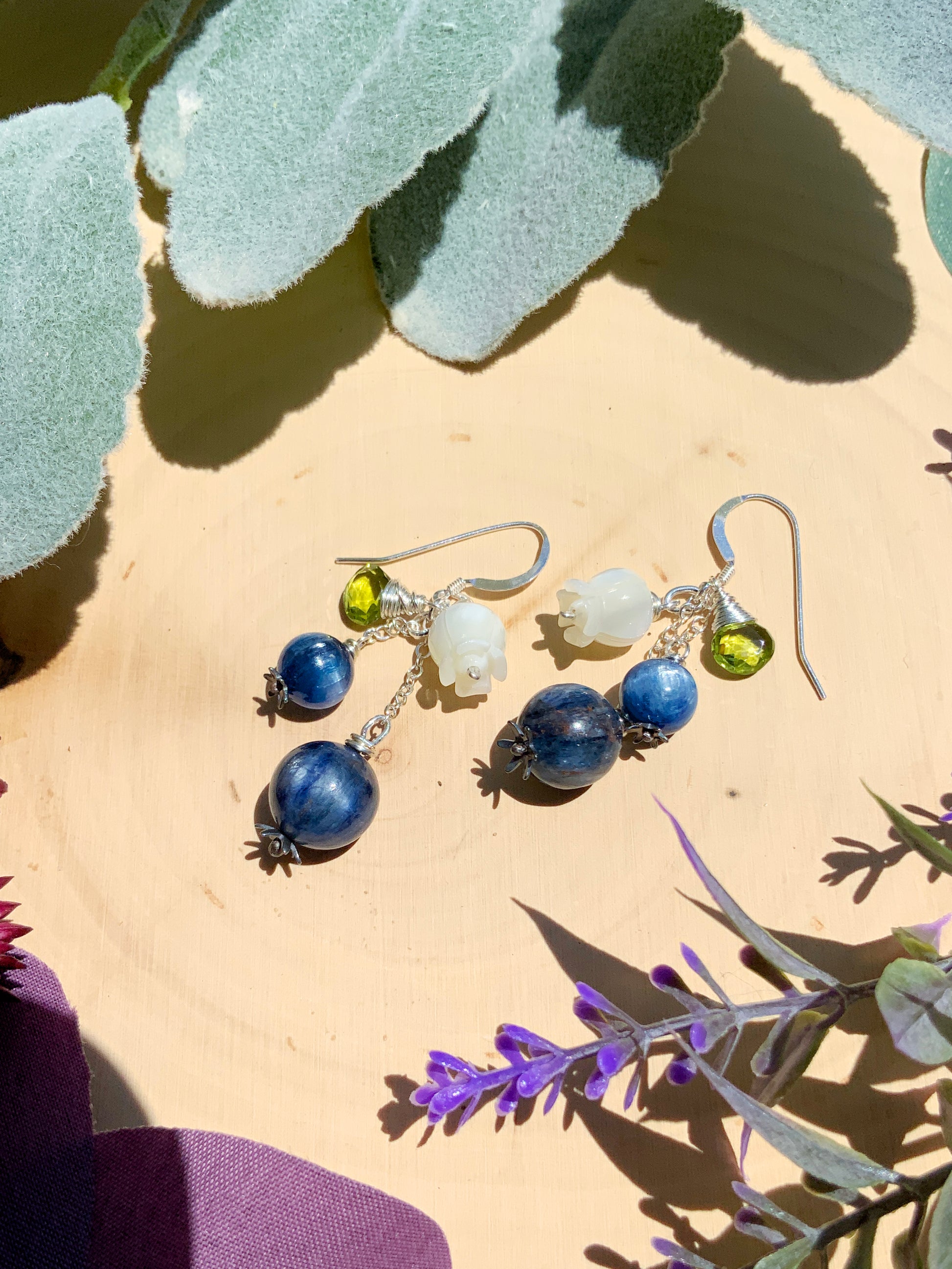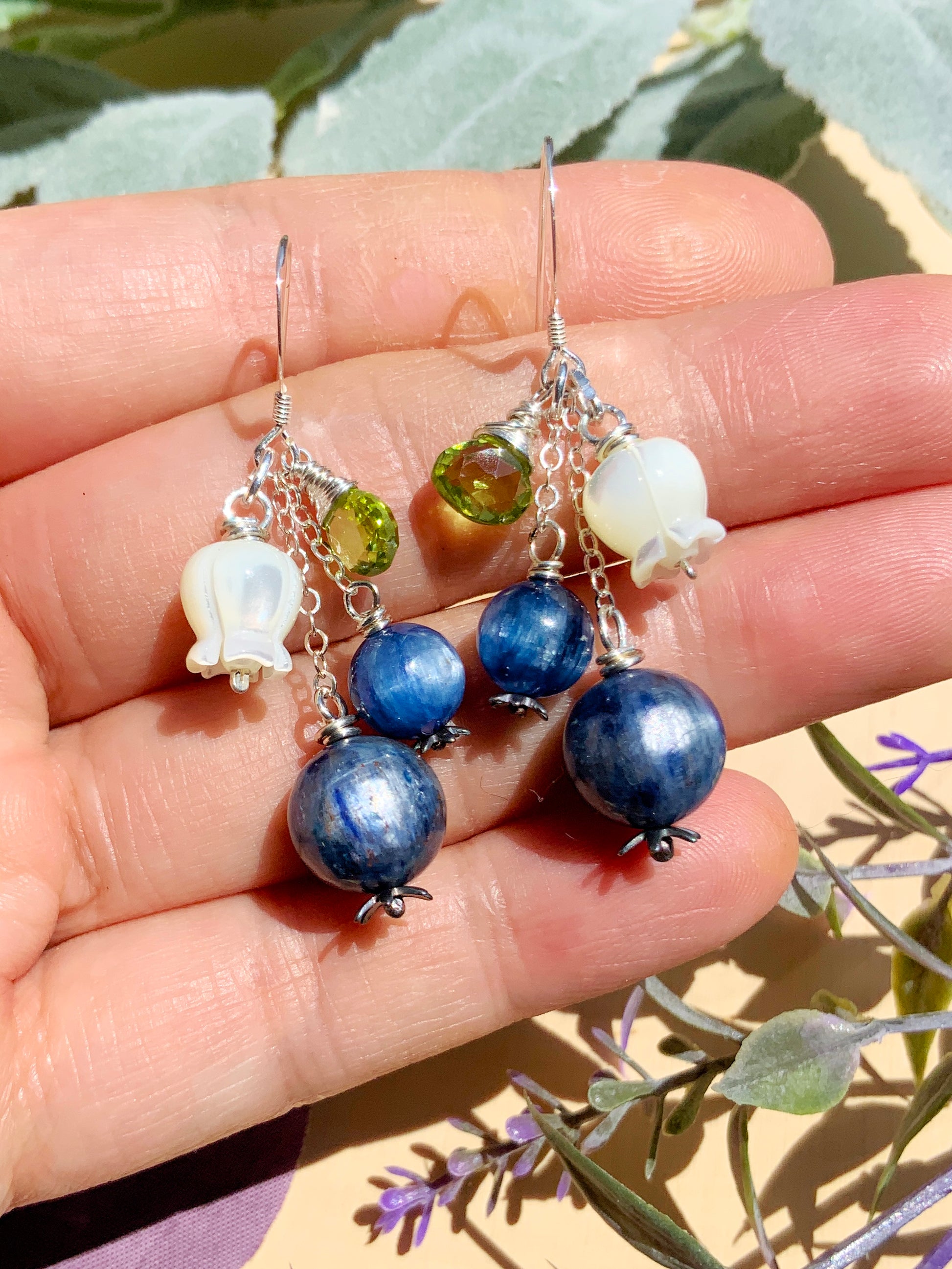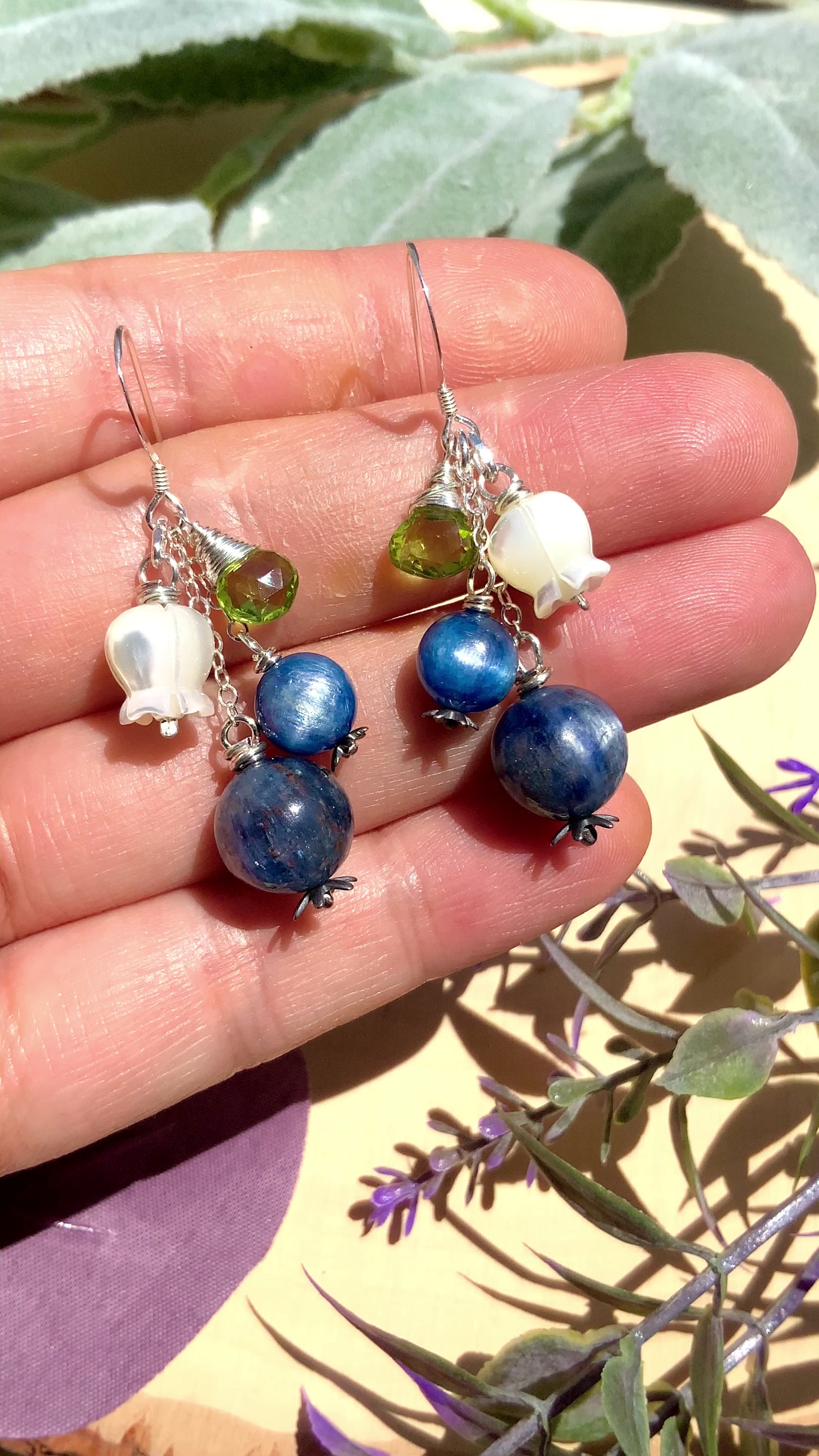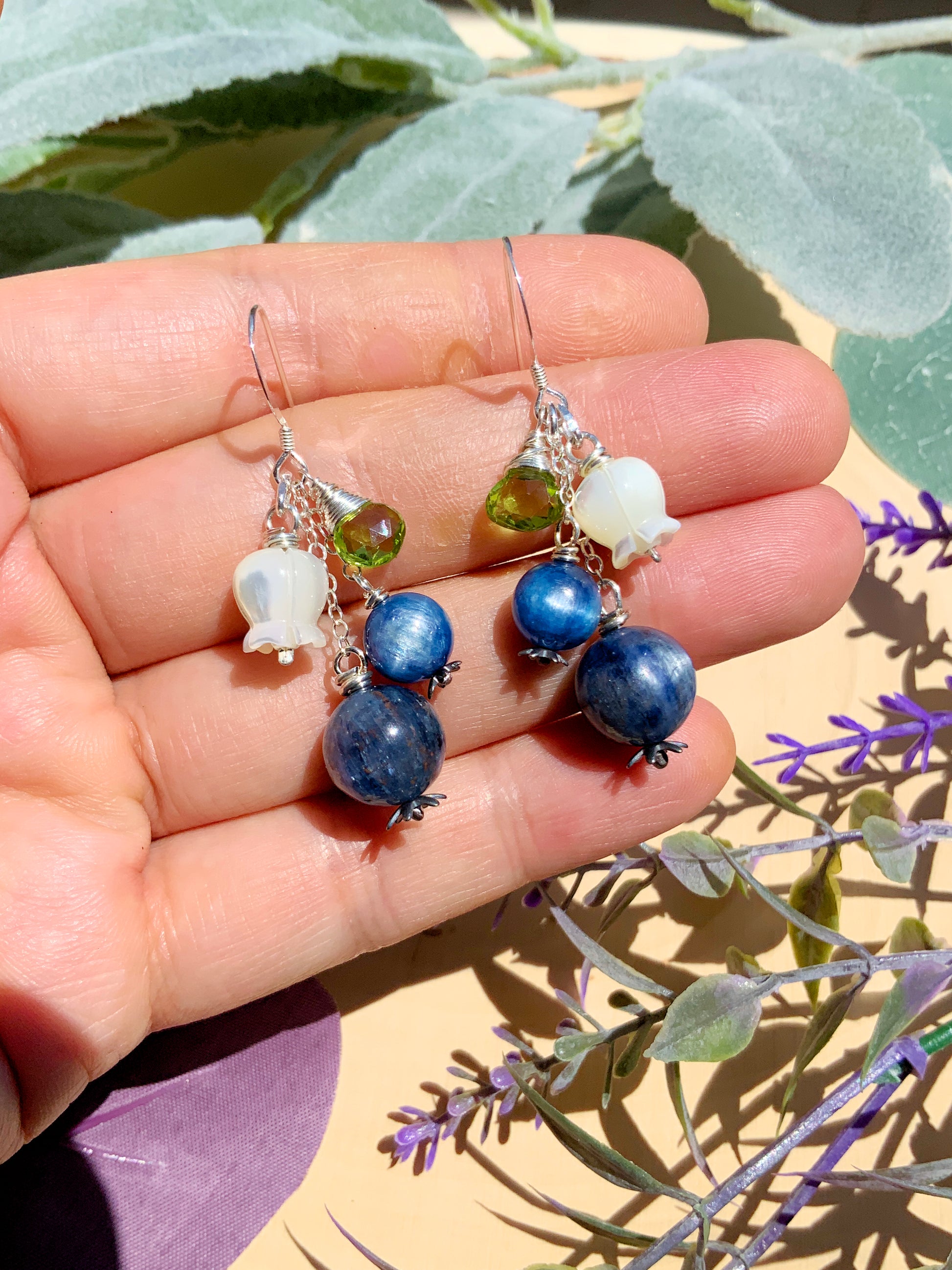 Kyanite Blueberry Blossom Earrings~ Peridot, Mother of Pearl, Sterling Silver or 14k Gold-Filled Blue Gemstone Fruit Jewelry