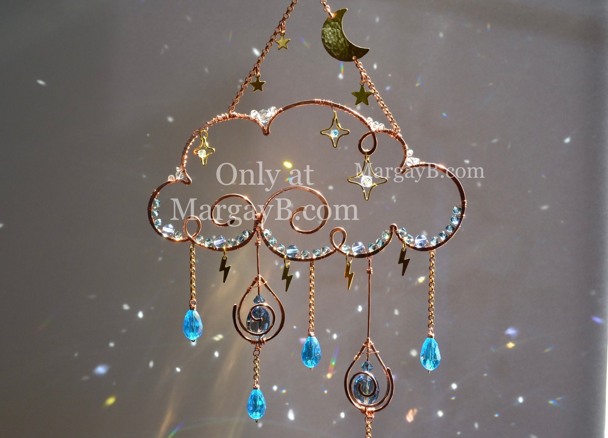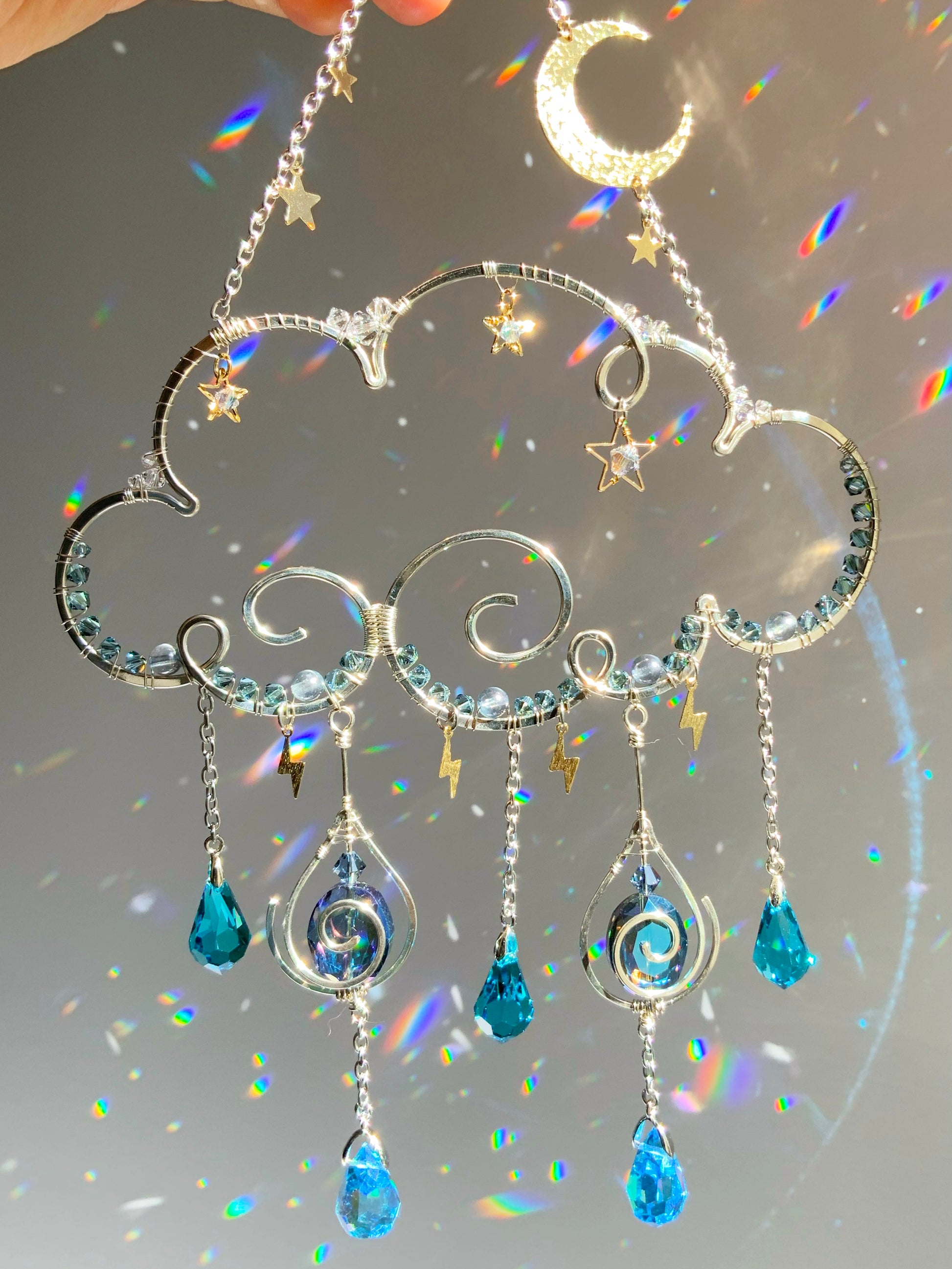 Rain Cloud Suncatcher with Moon, Stars, Lightning, and Crystal Raindrops