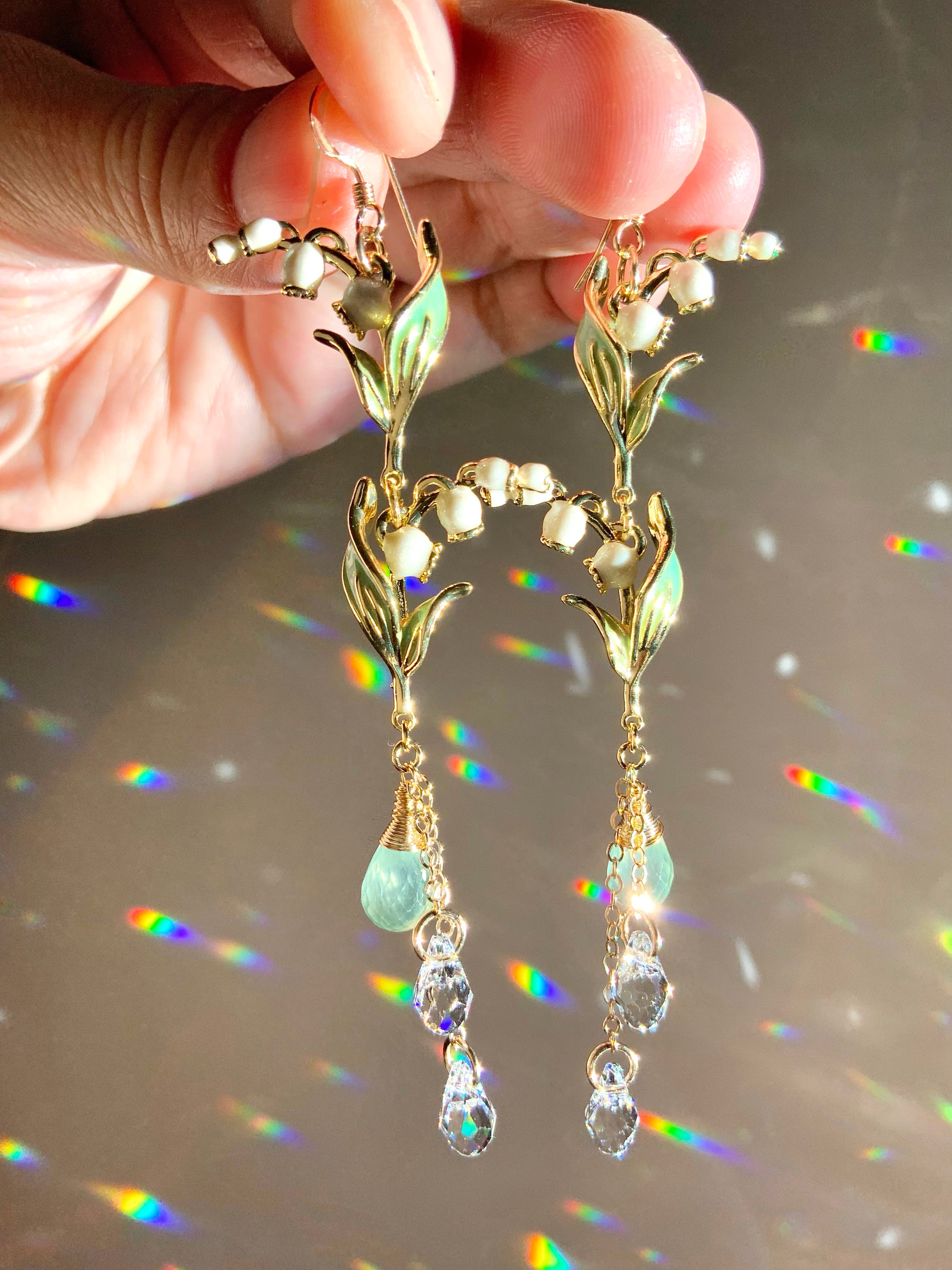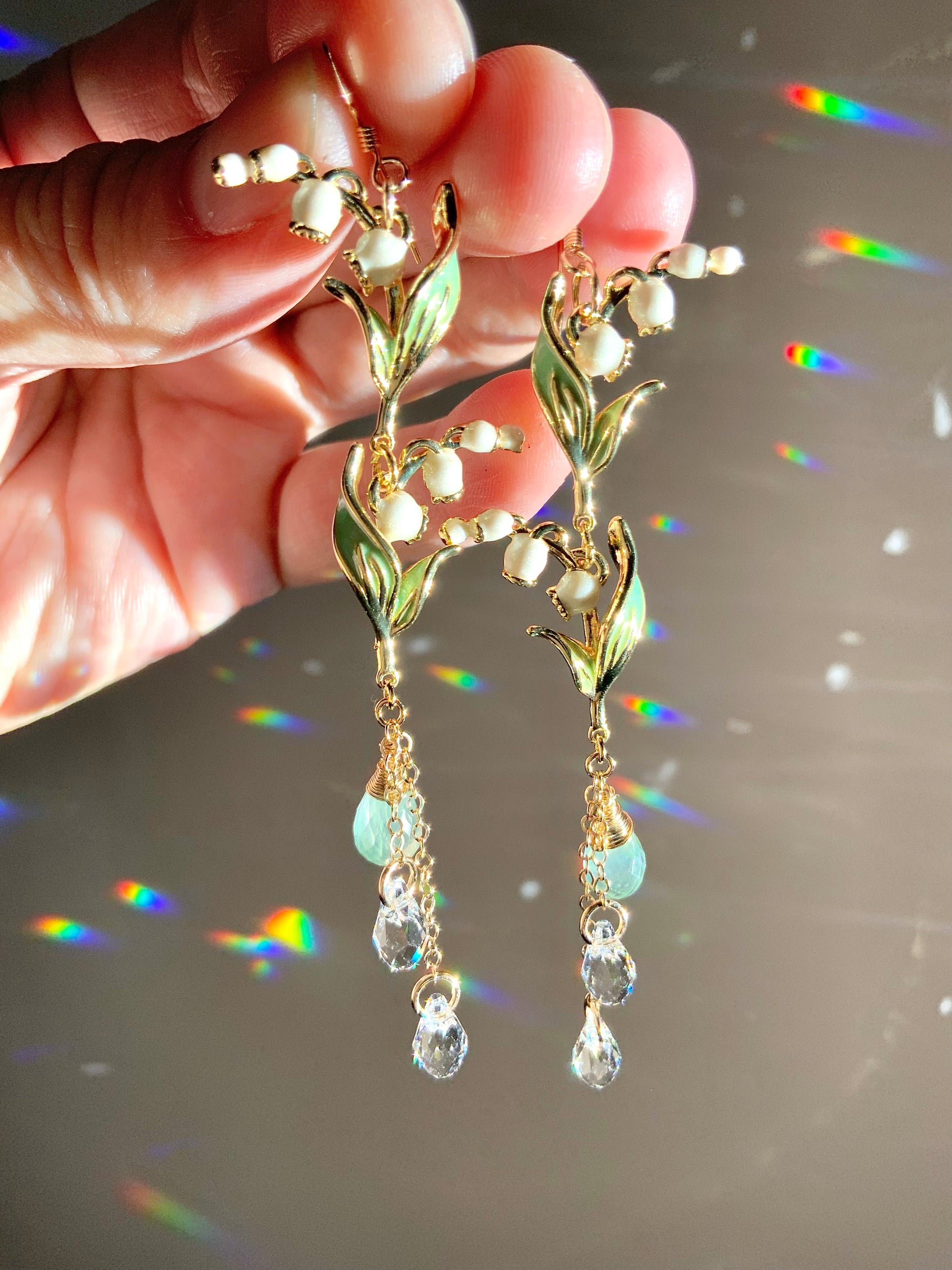 Prehnite Lily of the Valley Earrings~ 14k Gold-Filled Floral Enamel Jewelry