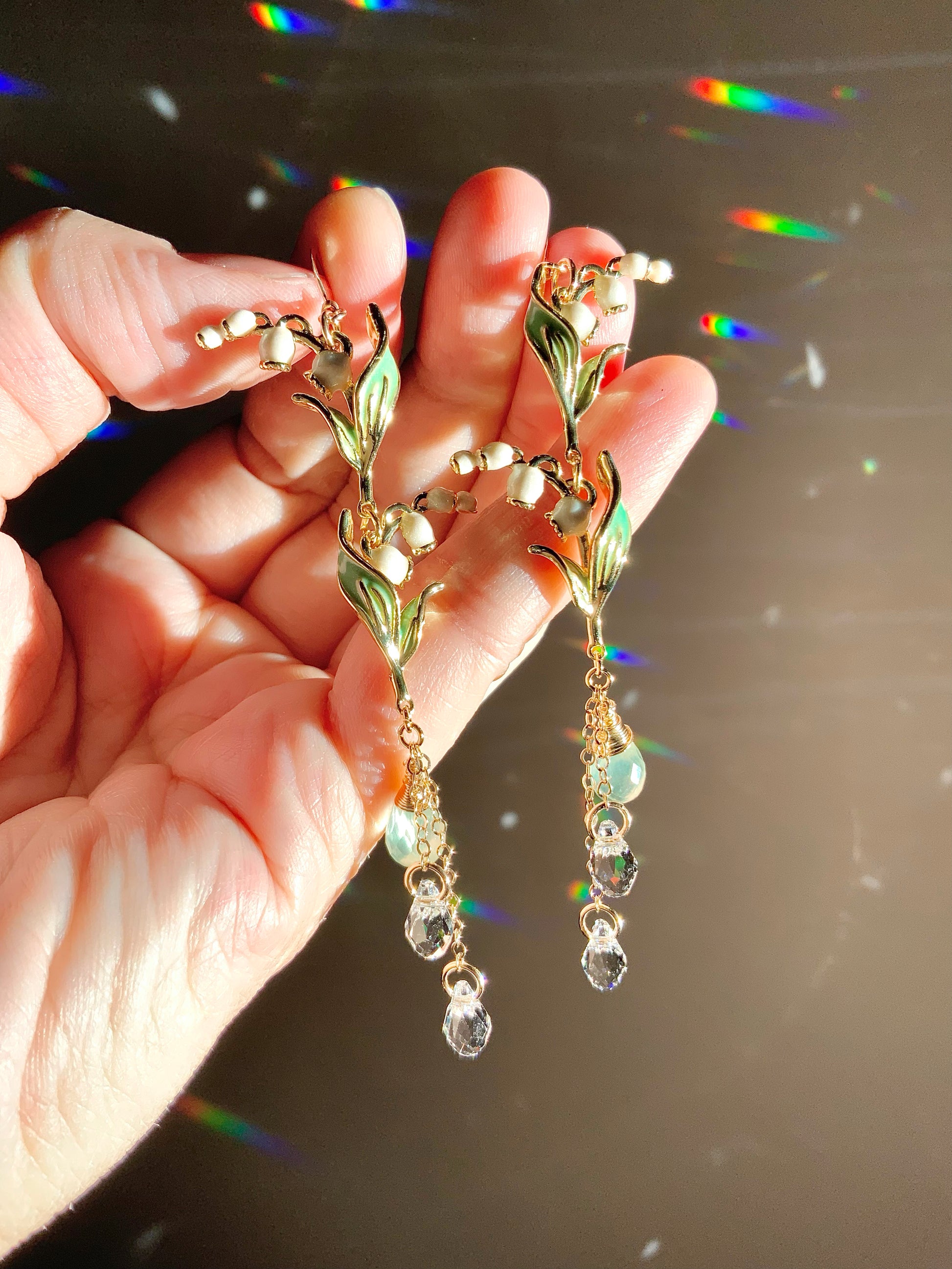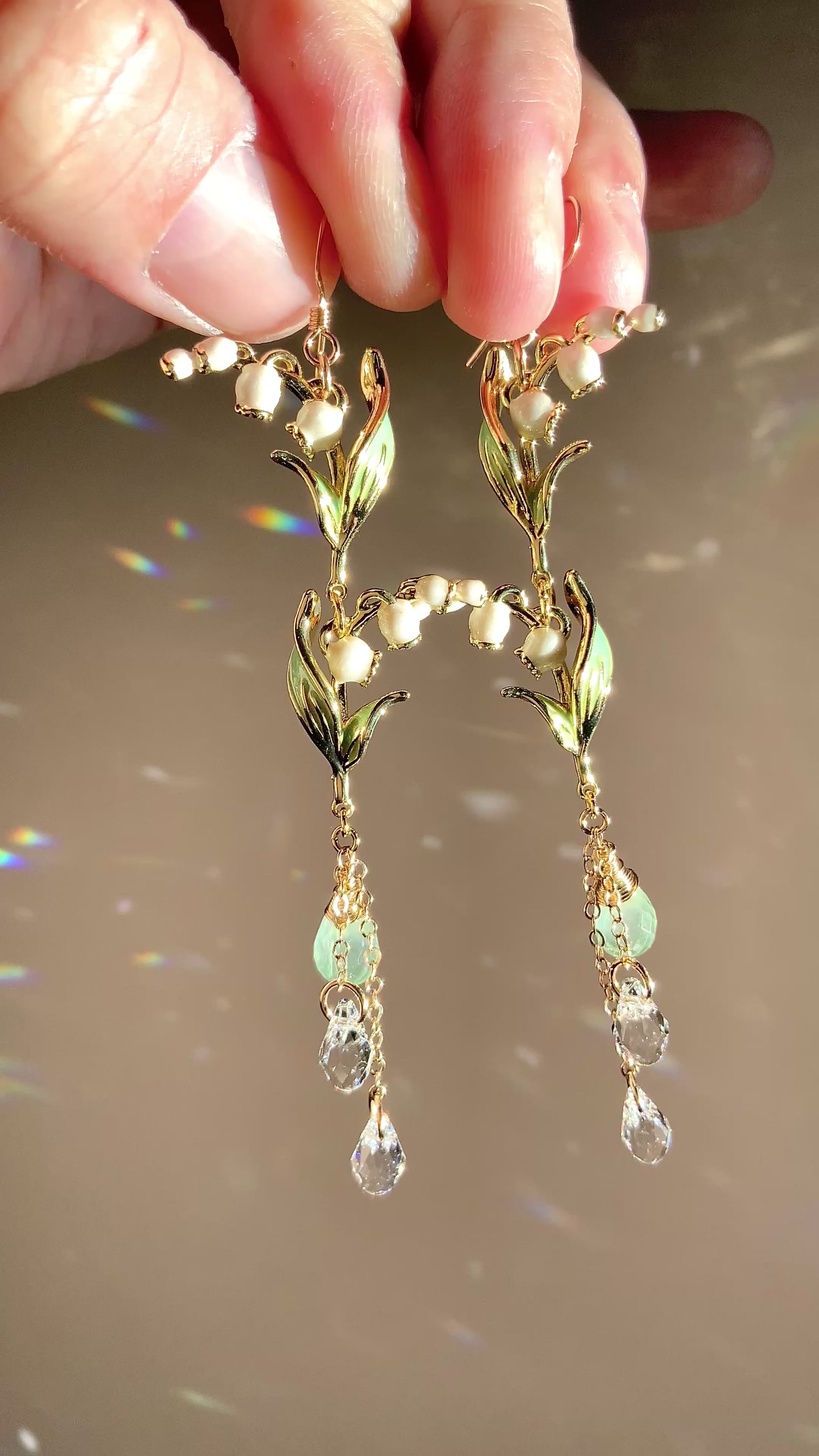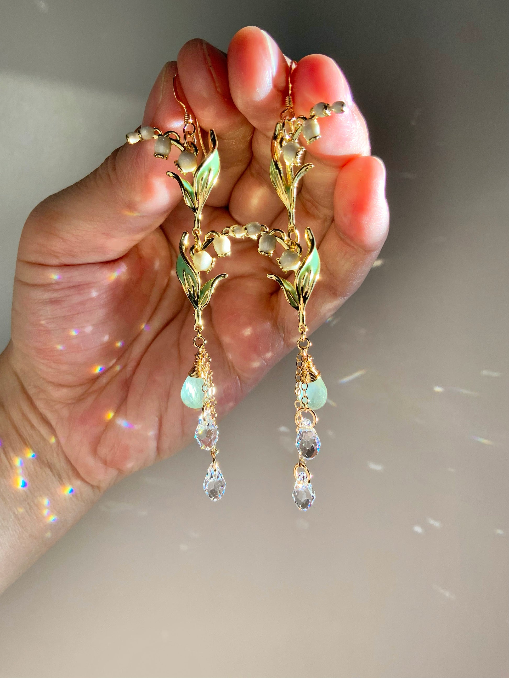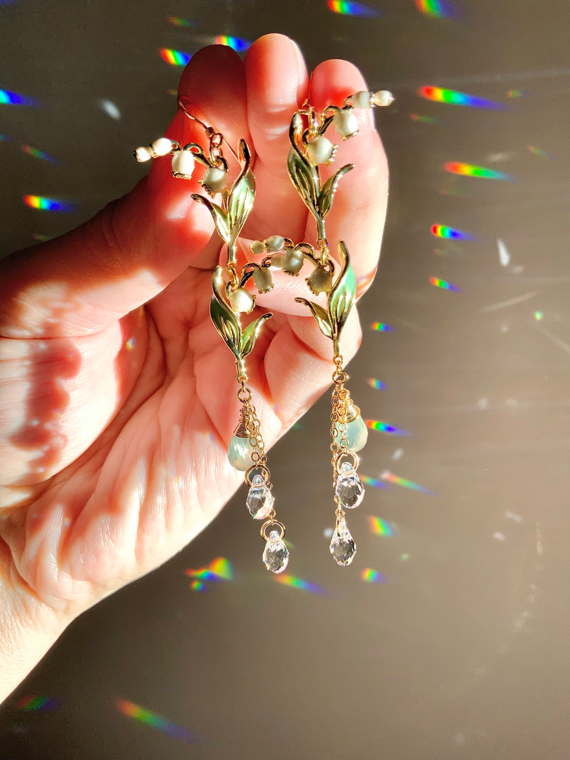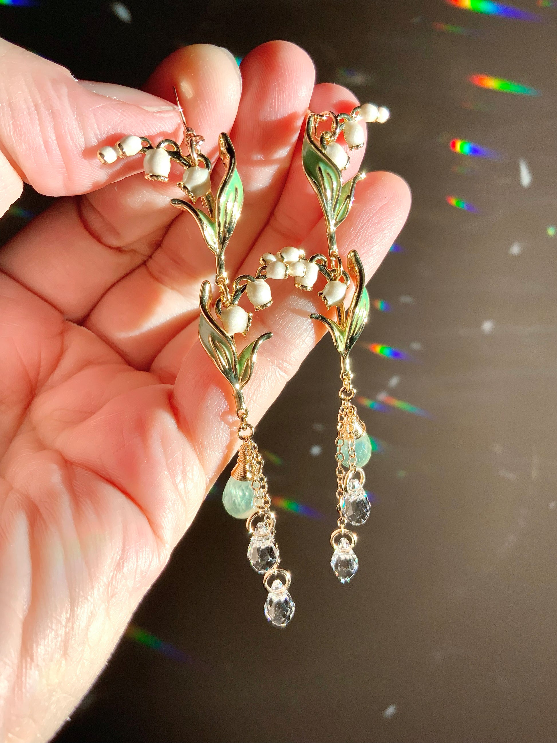 These delicate and dangly beauties feature a cascade of two beautiful Lily of the Valley sprigs, with soft green leaves and pearlescent white enamel blossoms that hang above a trio of the best quality Prehnite I’ve ever had the pleasure of working with, and of course, super sparkly prism "water drops!"