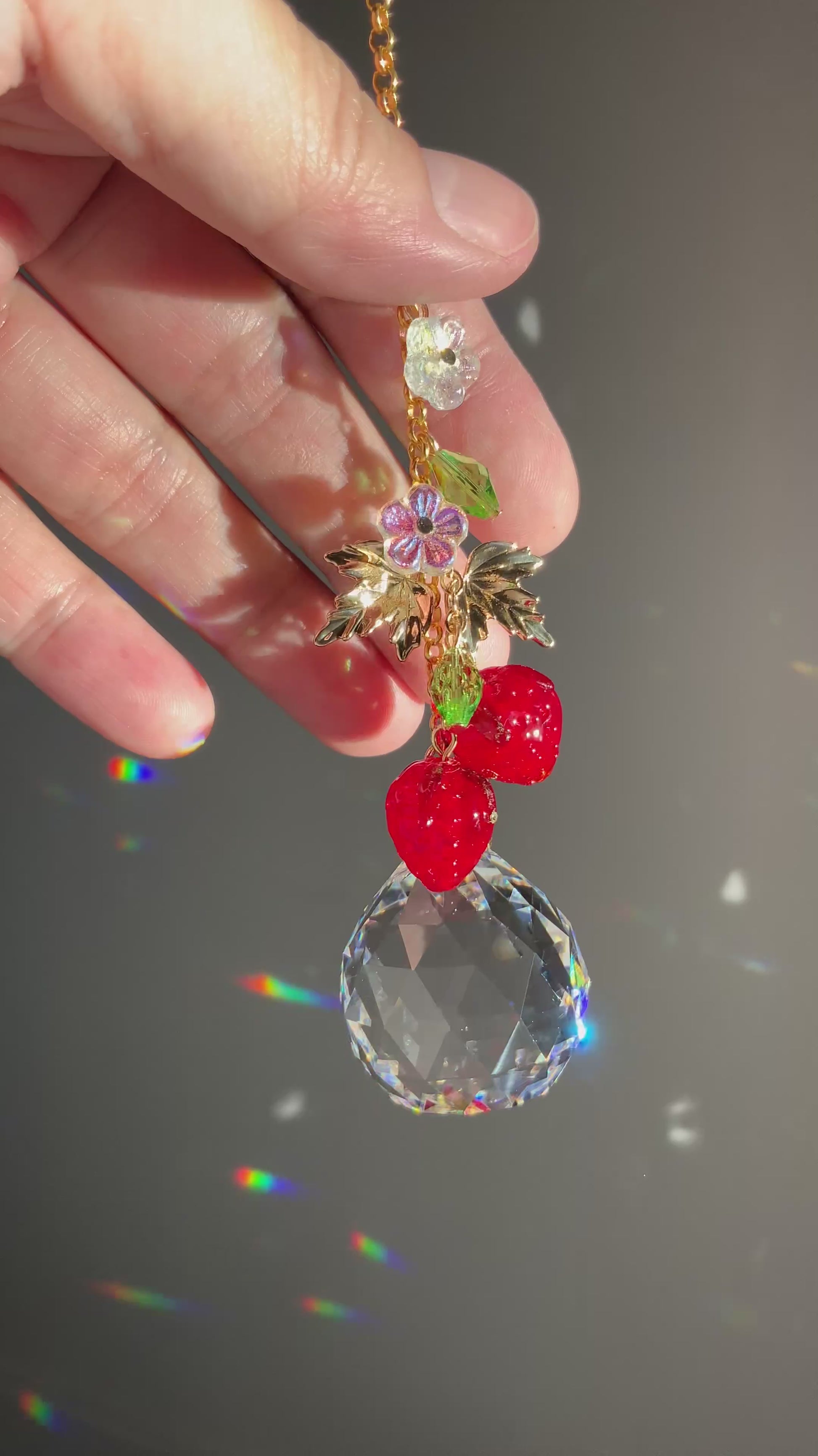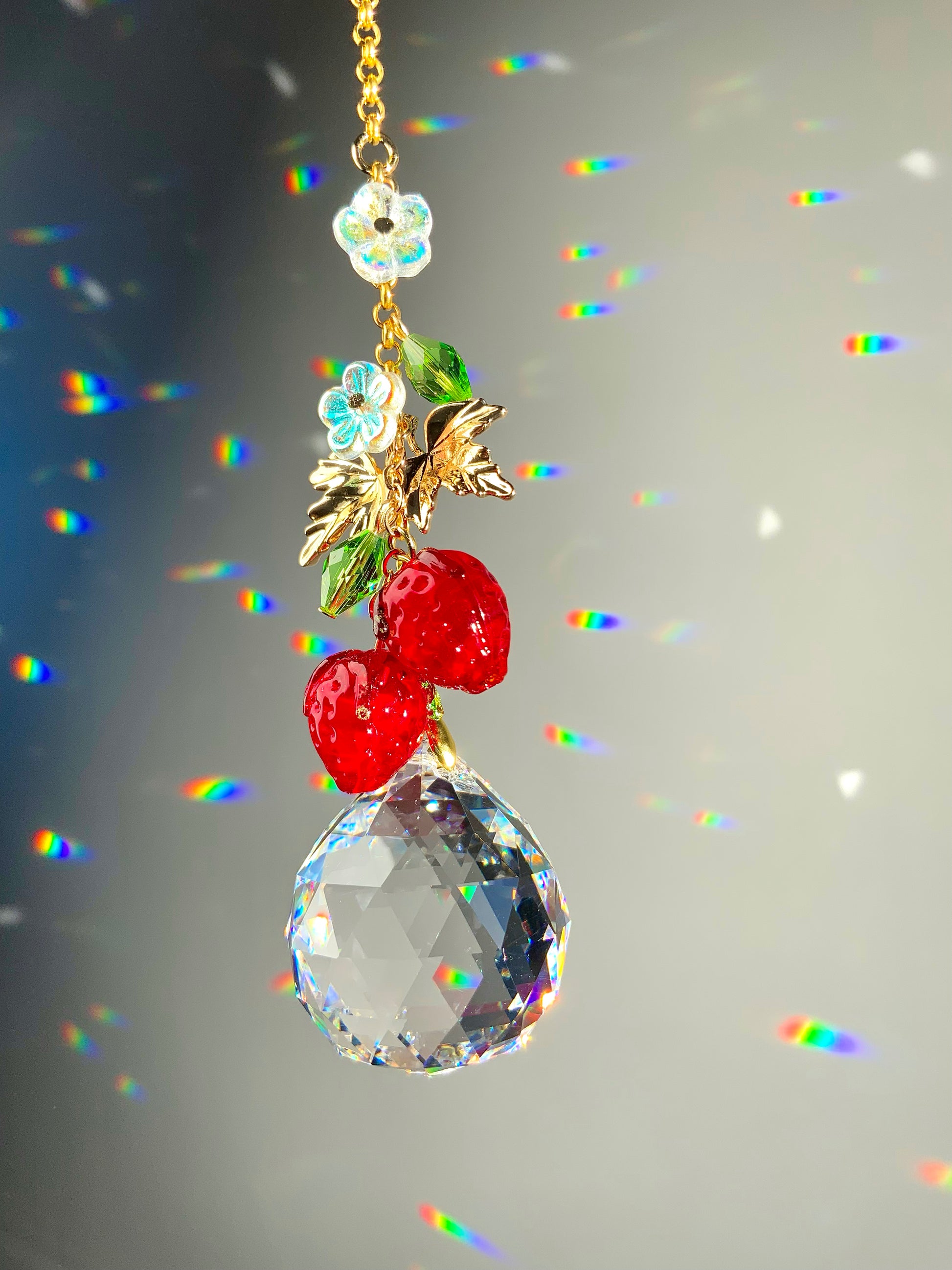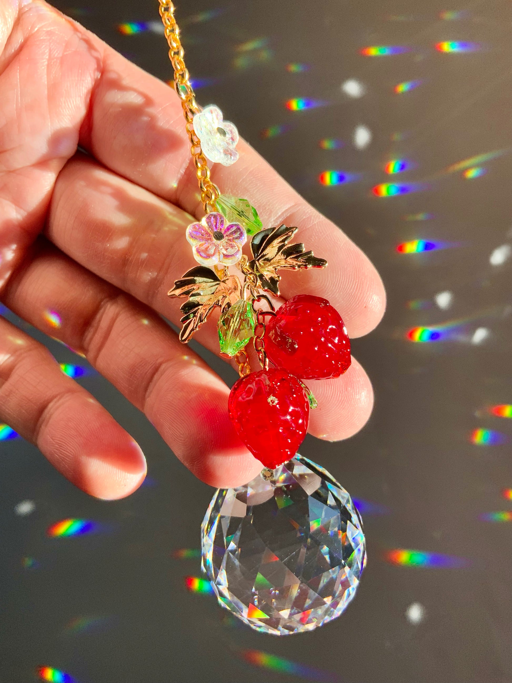 The strawberry leaves have beautiful details, the strawberries themselves have tiny little dimples for the seeds, and the absolutely gorgeous focal prism makes fantastic, vibrant rainbows! 🌈 ✨ These luscious berry crystals are a rich, deep red; so good you could almost eat it! 🤤