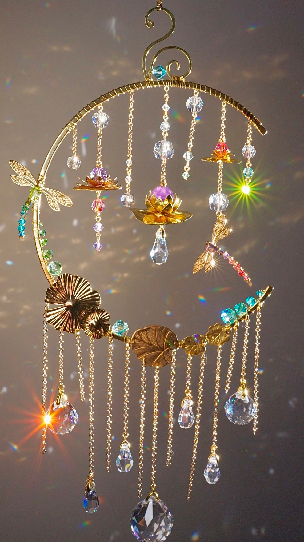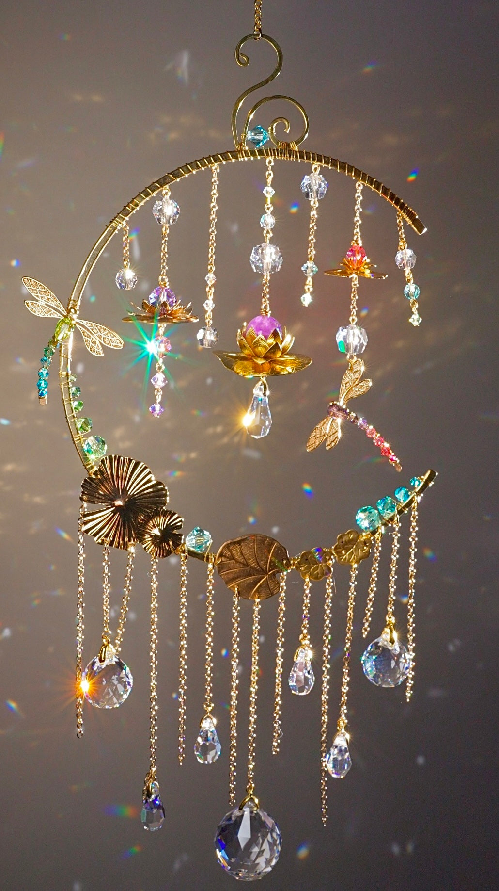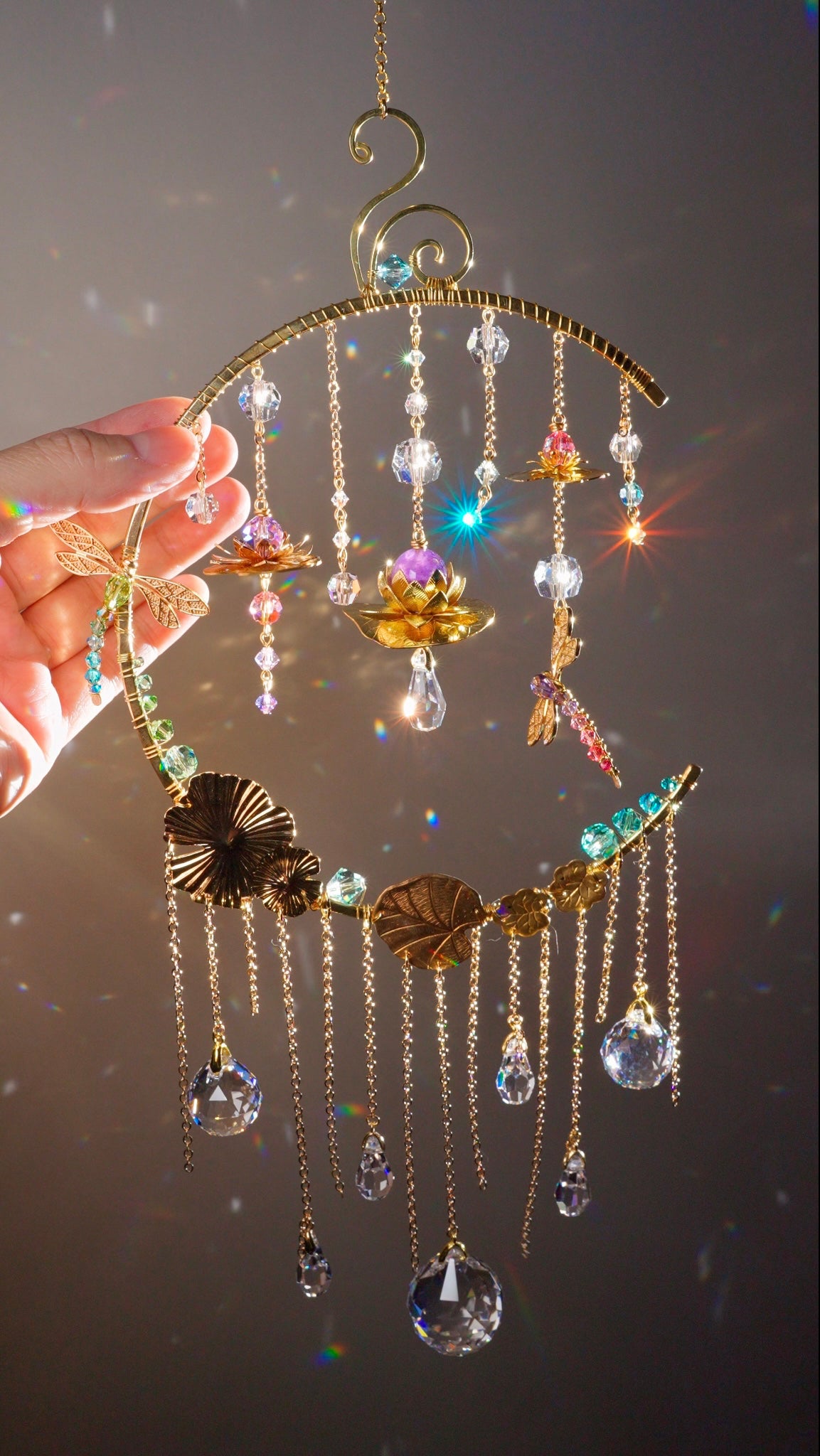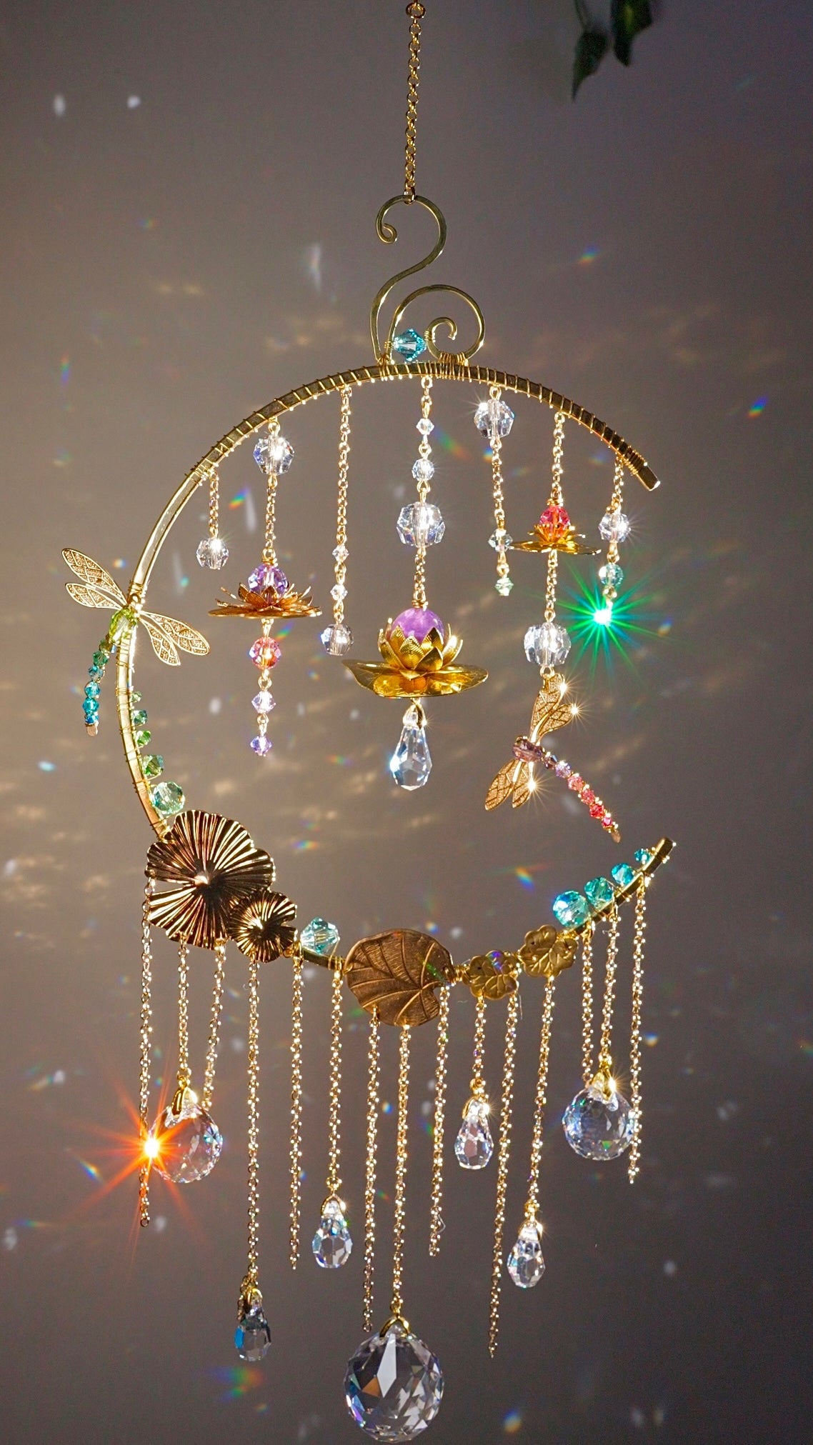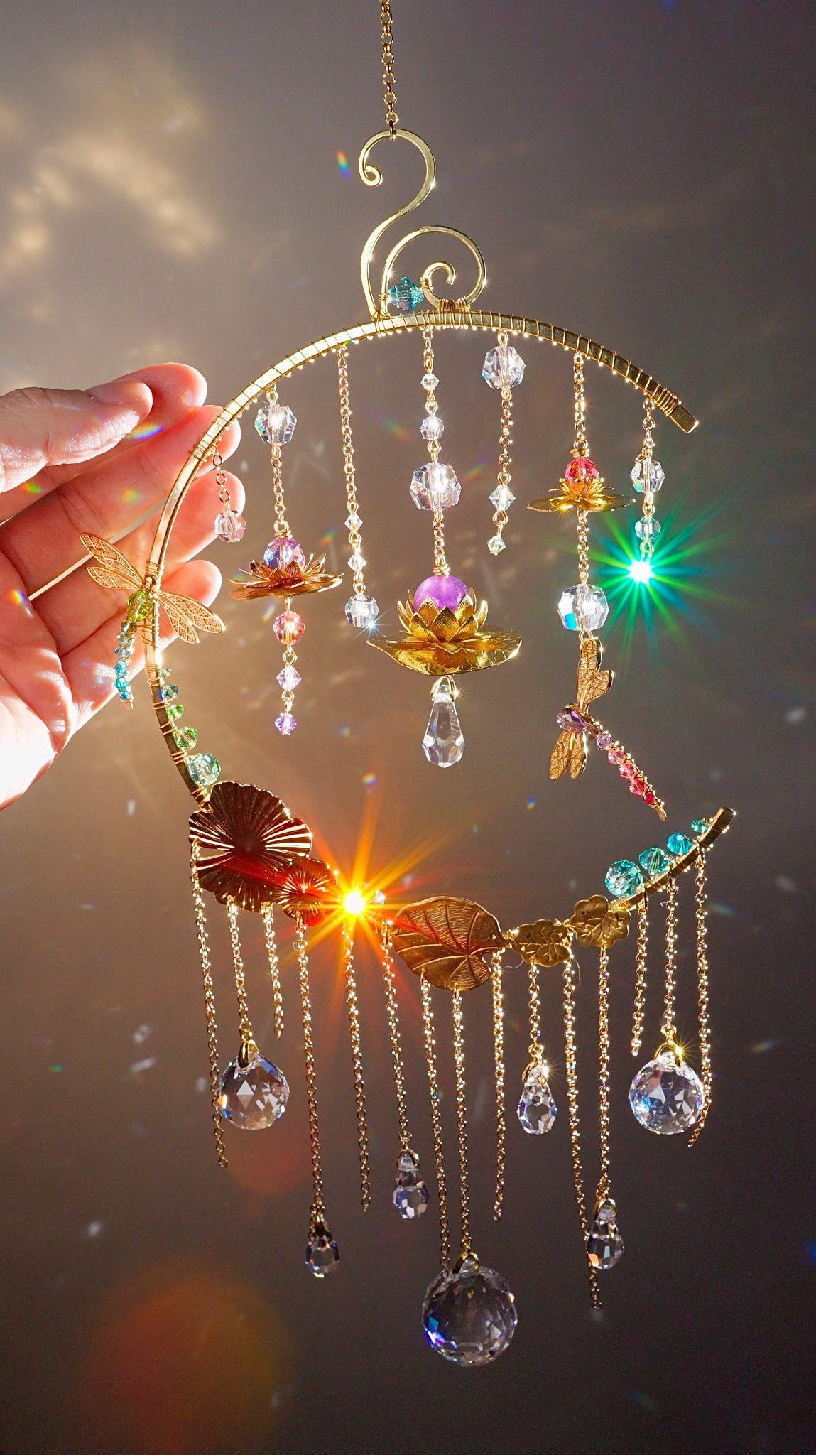 "Water Lily Mist" ~ Dragonfly Lotus Lily Pad Crystal Ball Suncatcher, 18k Gold-Plated Boho Room Decor, July Birthflower