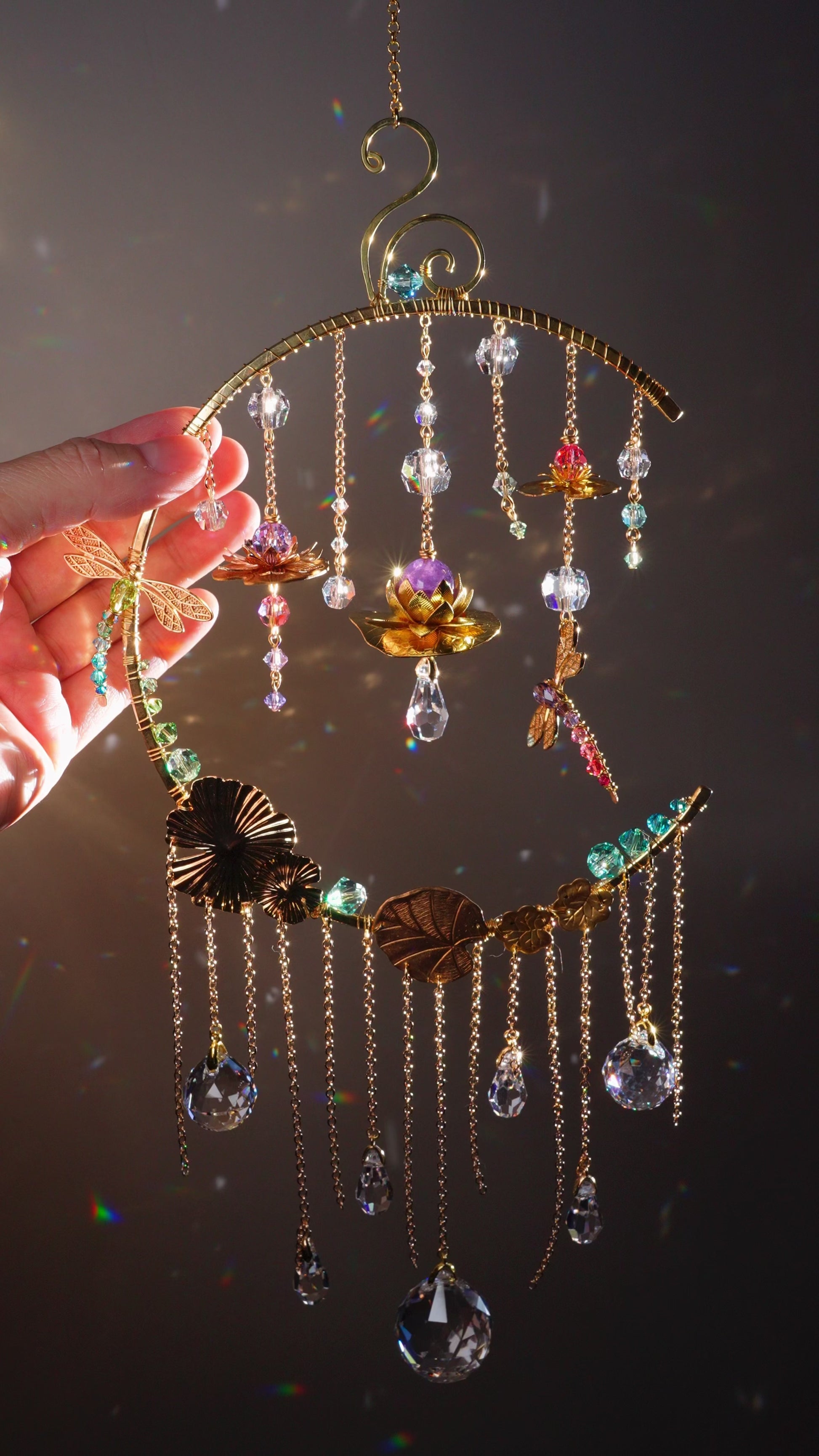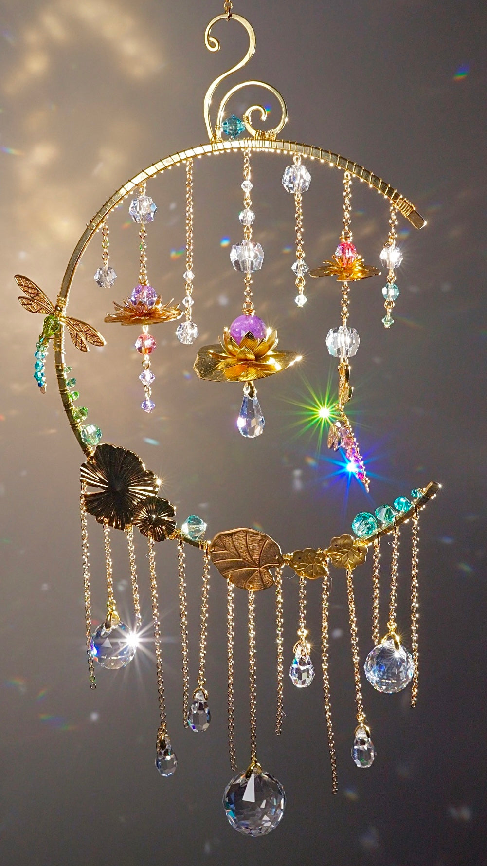 "Water Lily Mist" is a delicately balanced cascade of crystal and metal: an arc portal into a scene of floating lotus blooms sitting atop lilypads, and glittering droplets caught mid-fall.